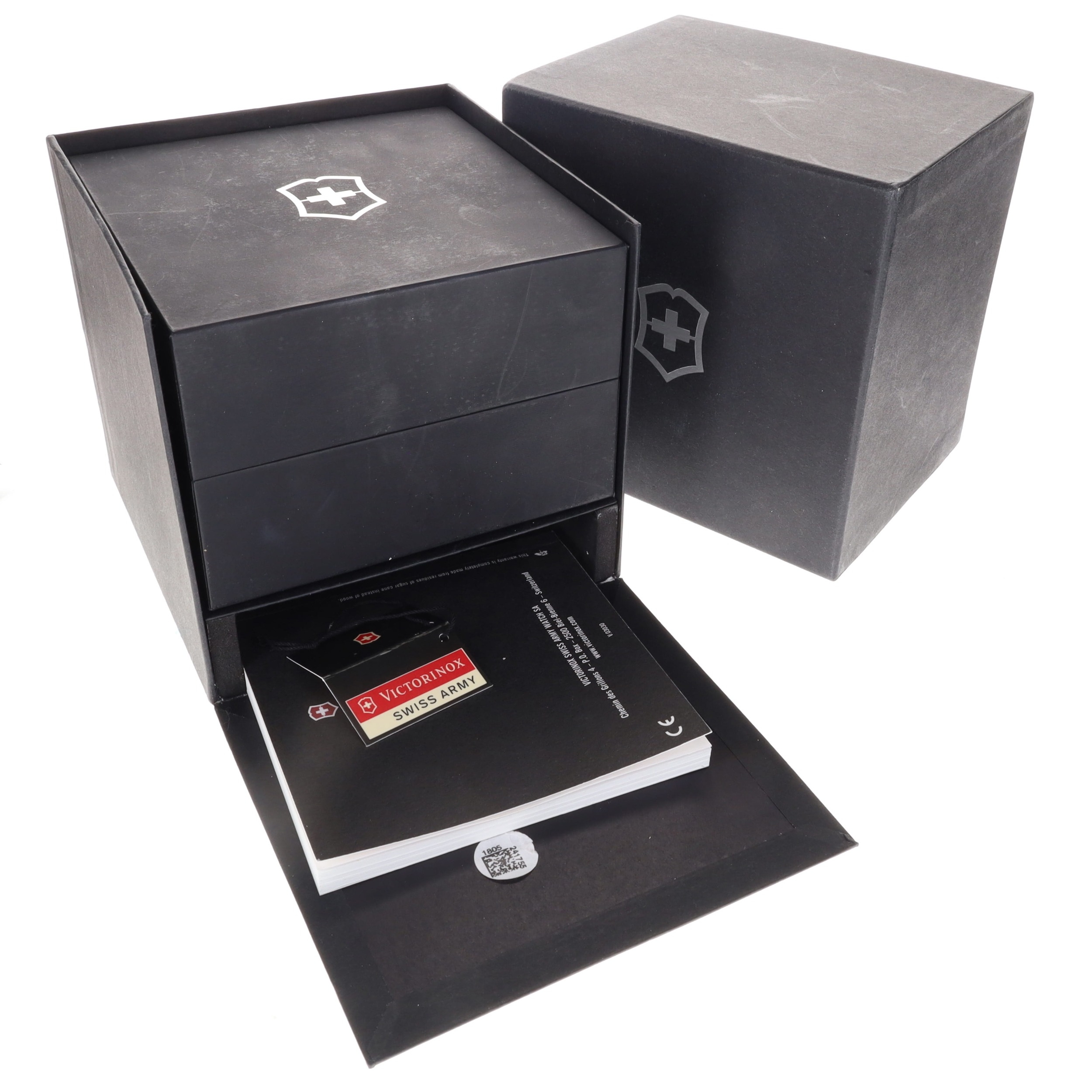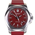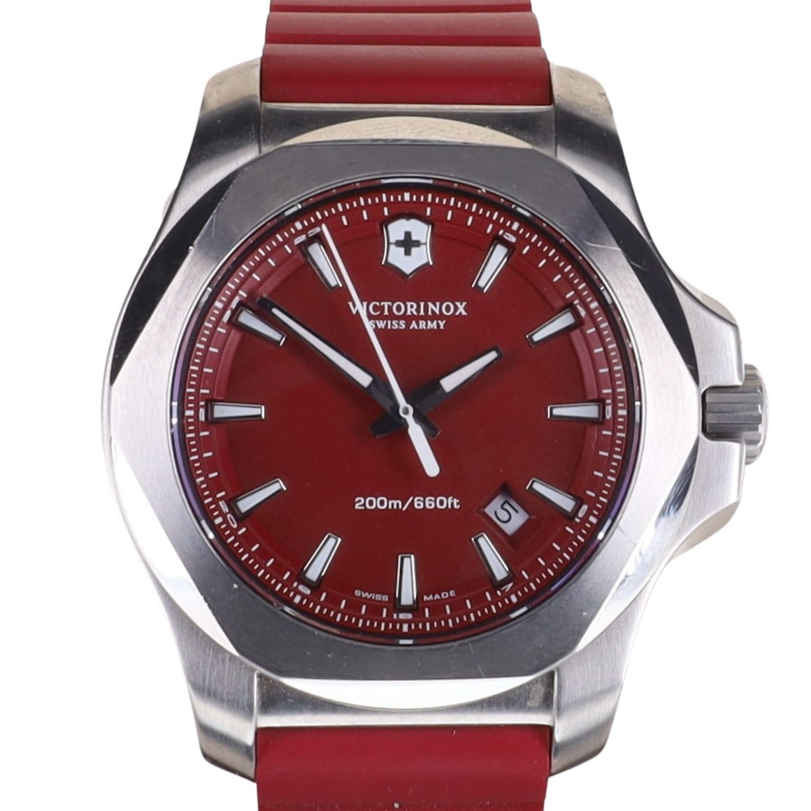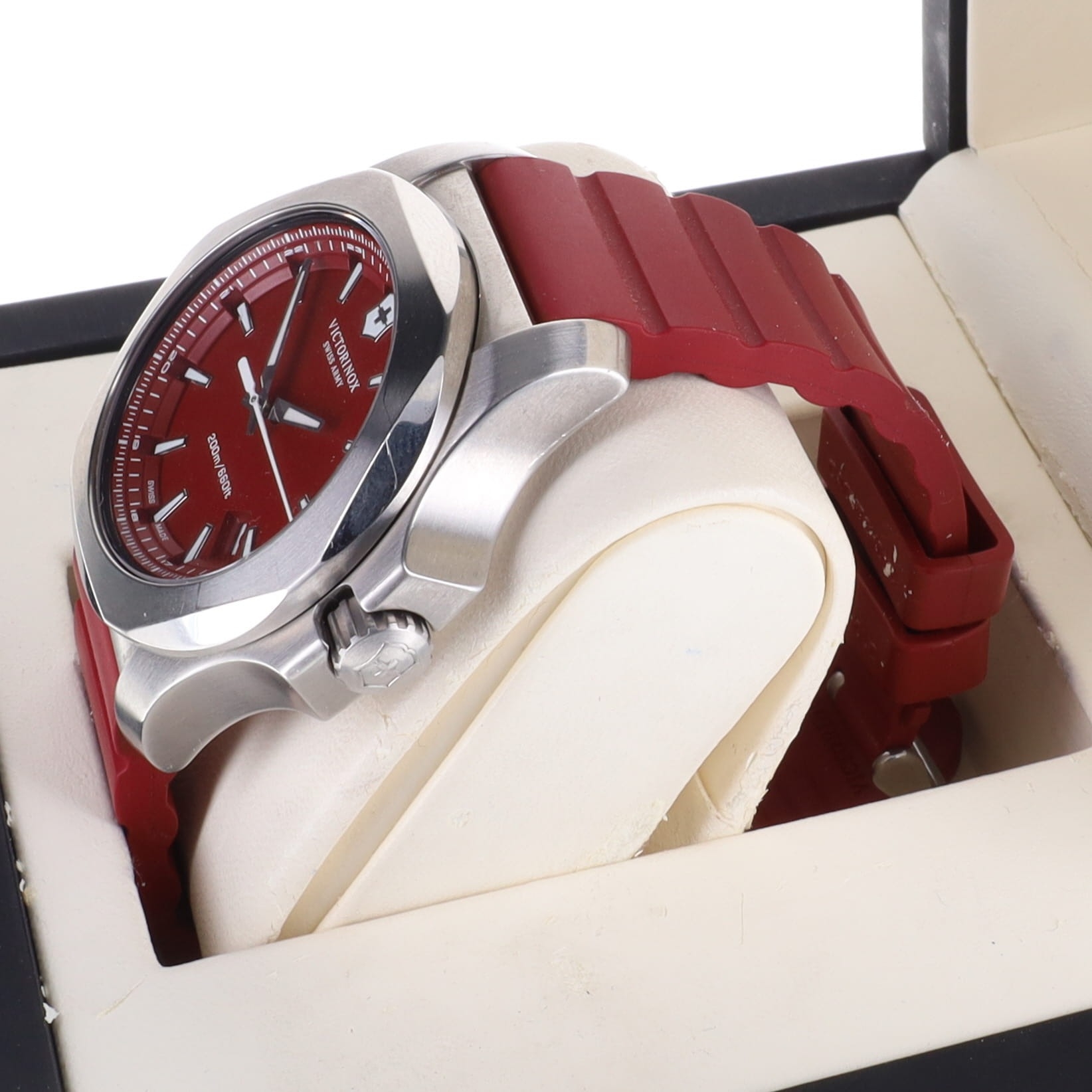 Victorinox Swiss Army - Inox 200m Diver's Quartz Watch. Ronda quartz movement. Case made from stainless steel, red rubber strap. Sapphire crystal. Fixed bezel. Red dial with silver lumed hands and hour markers, date window in between 4 and 5 o'clock. Dial signed 'Victorinox Swiss Army 200m/660ft' in white font. Screw down crown and quick set date function. Watch is in full working order. Box and warranty booklet included.