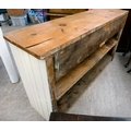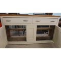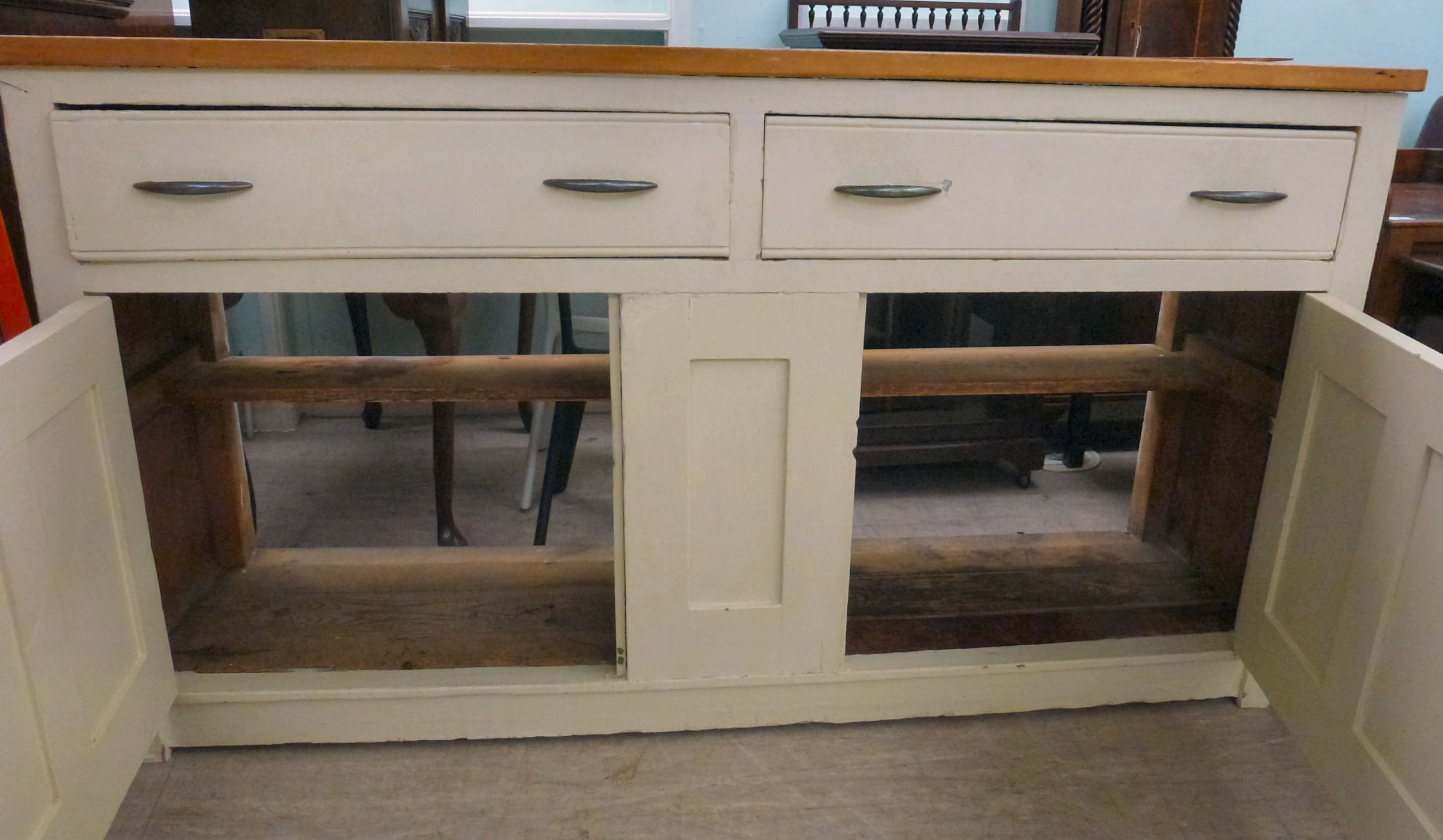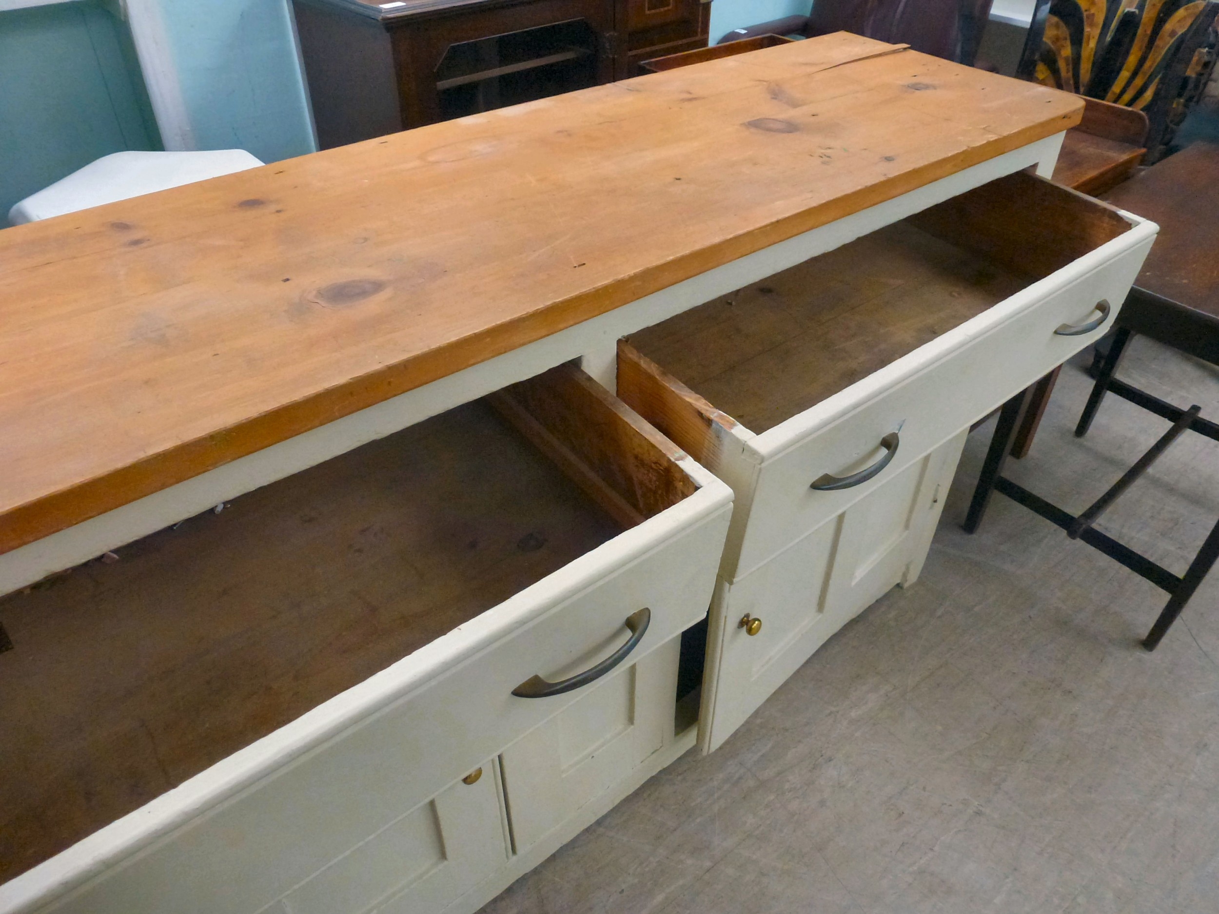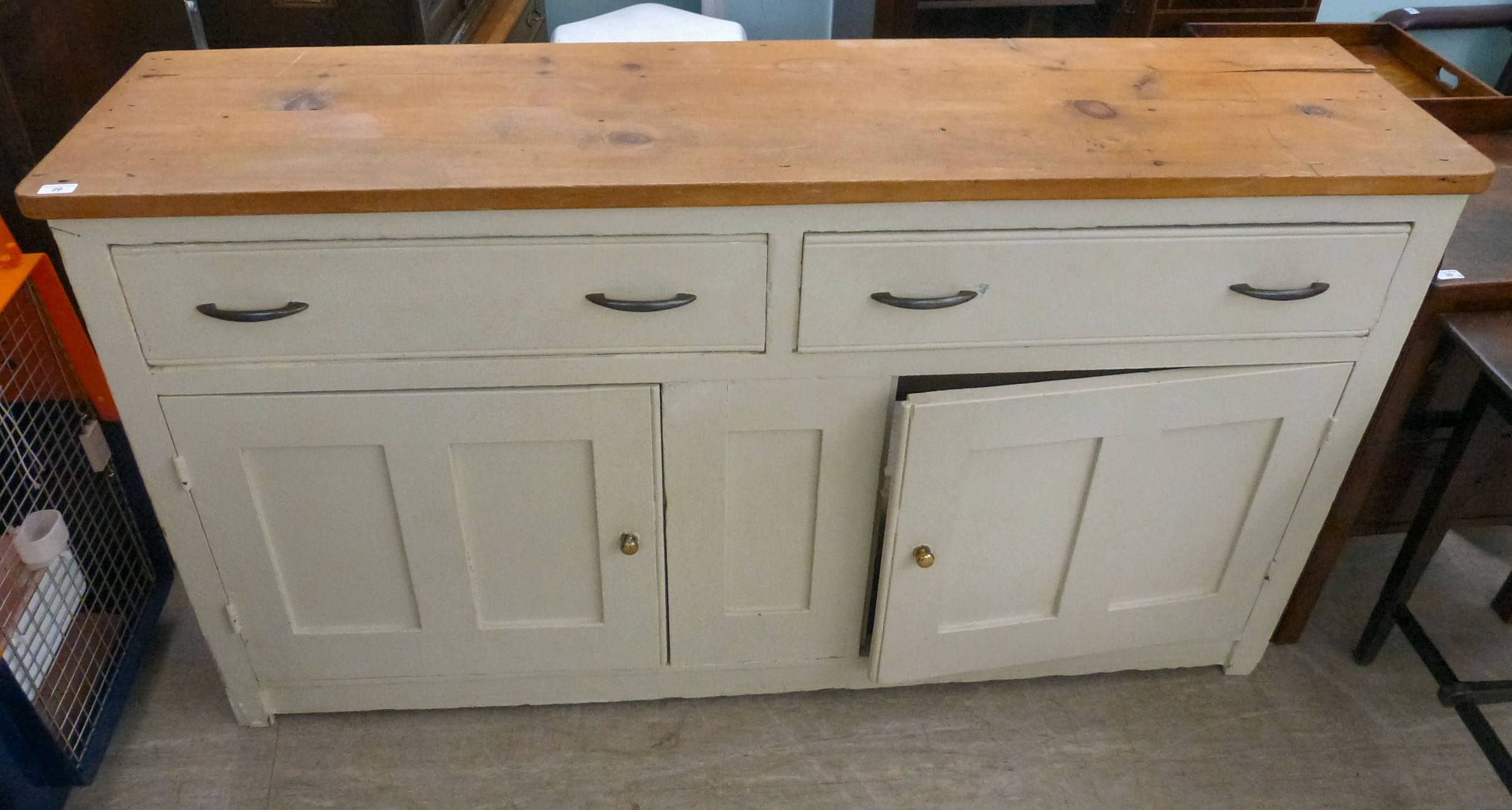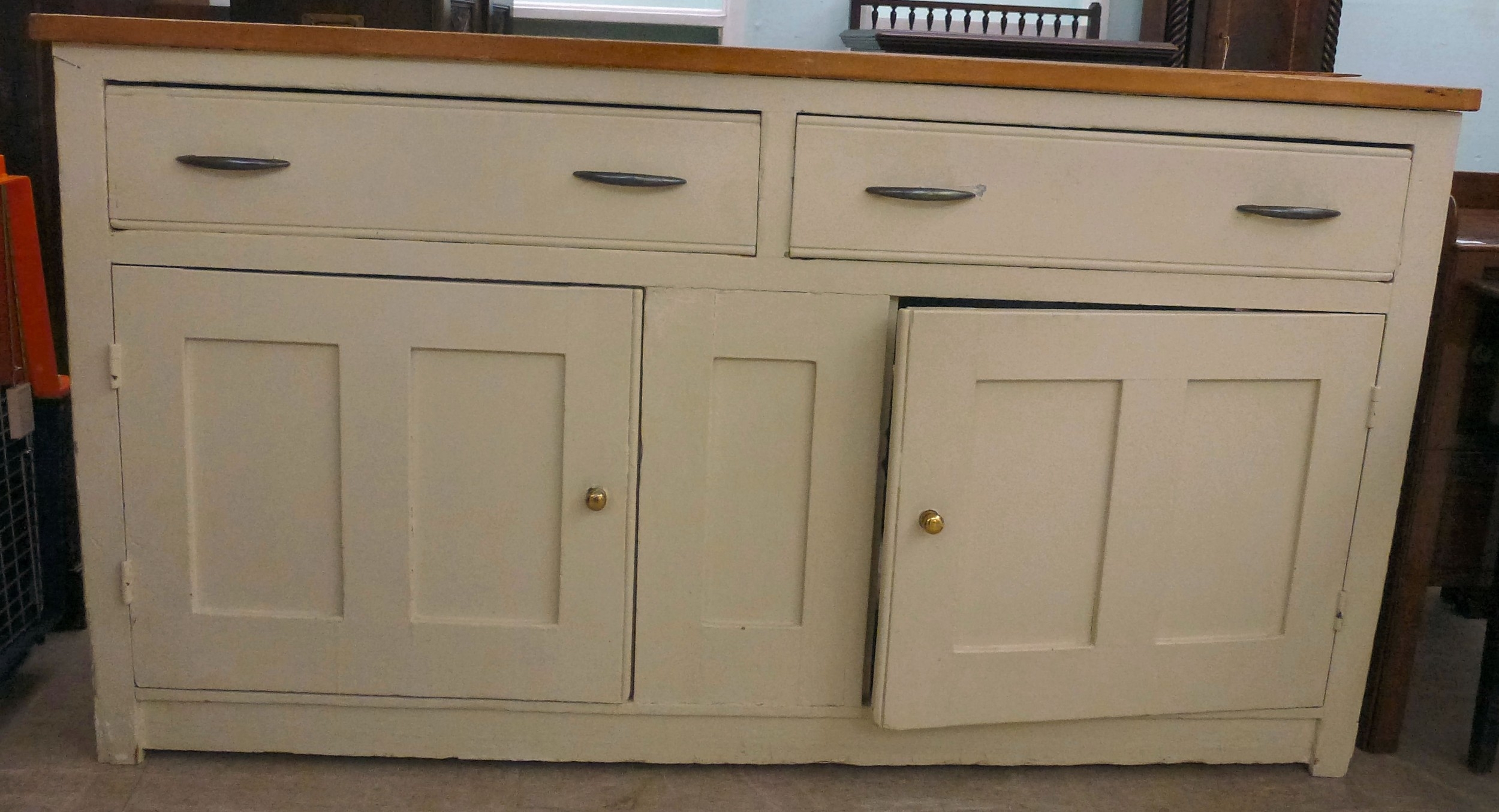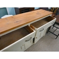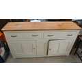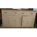 A late 19thC and later cream painted wooden sideboard, the showwood pine surface over two drawers/two cupboard doors, raised on stubby block feet 37"h 67"w