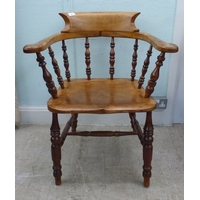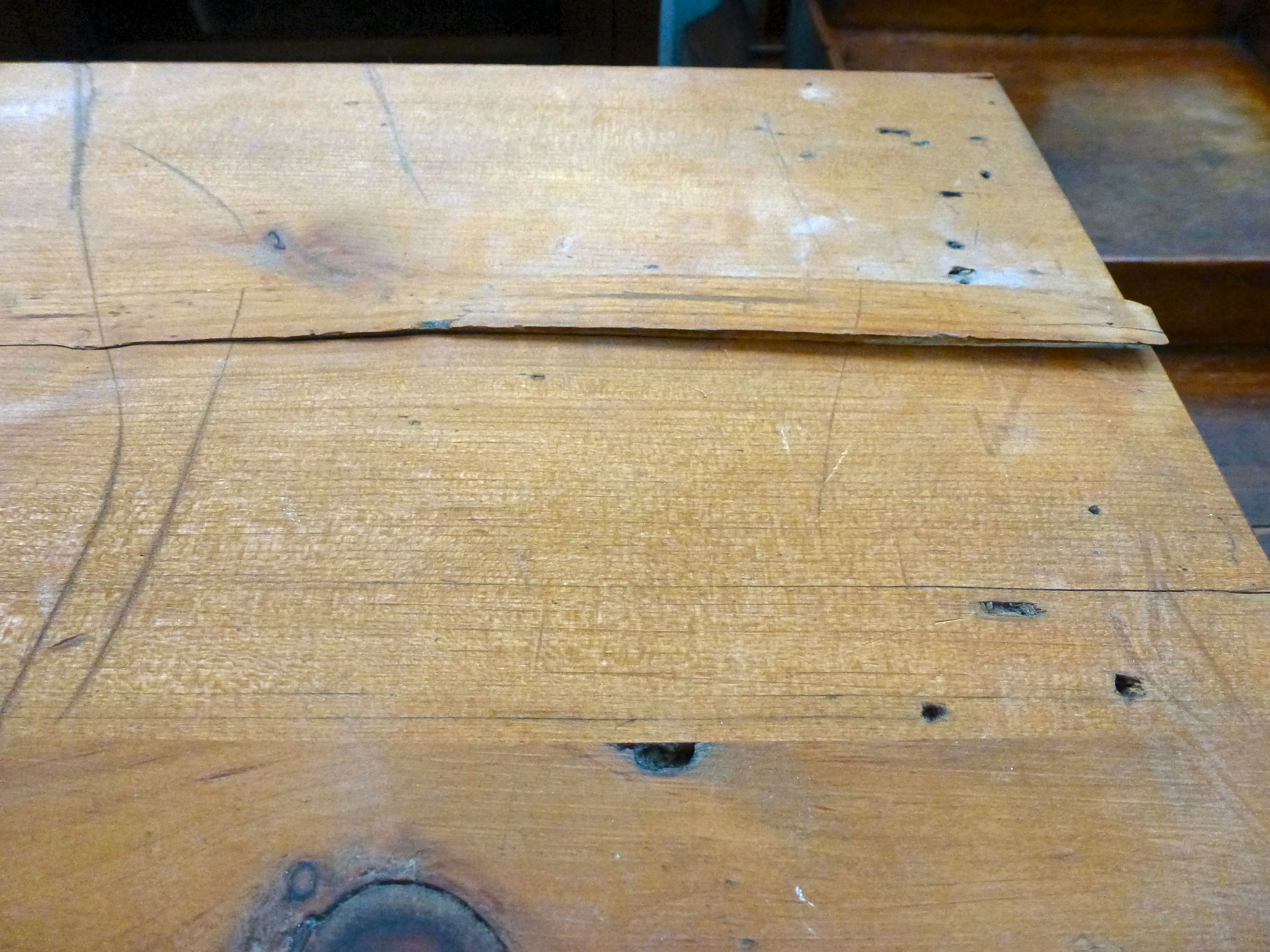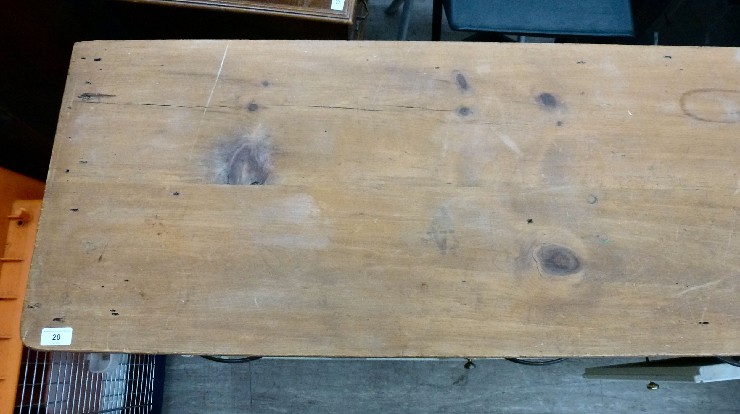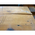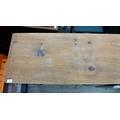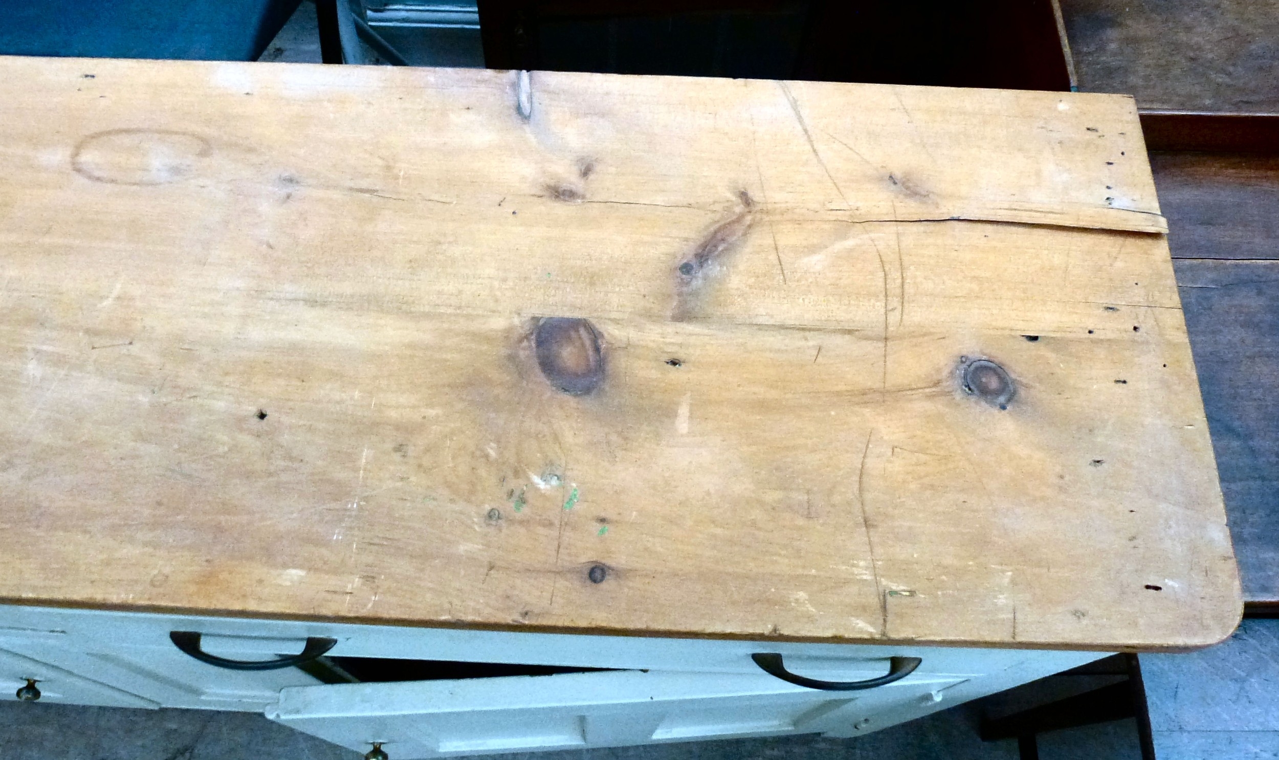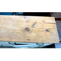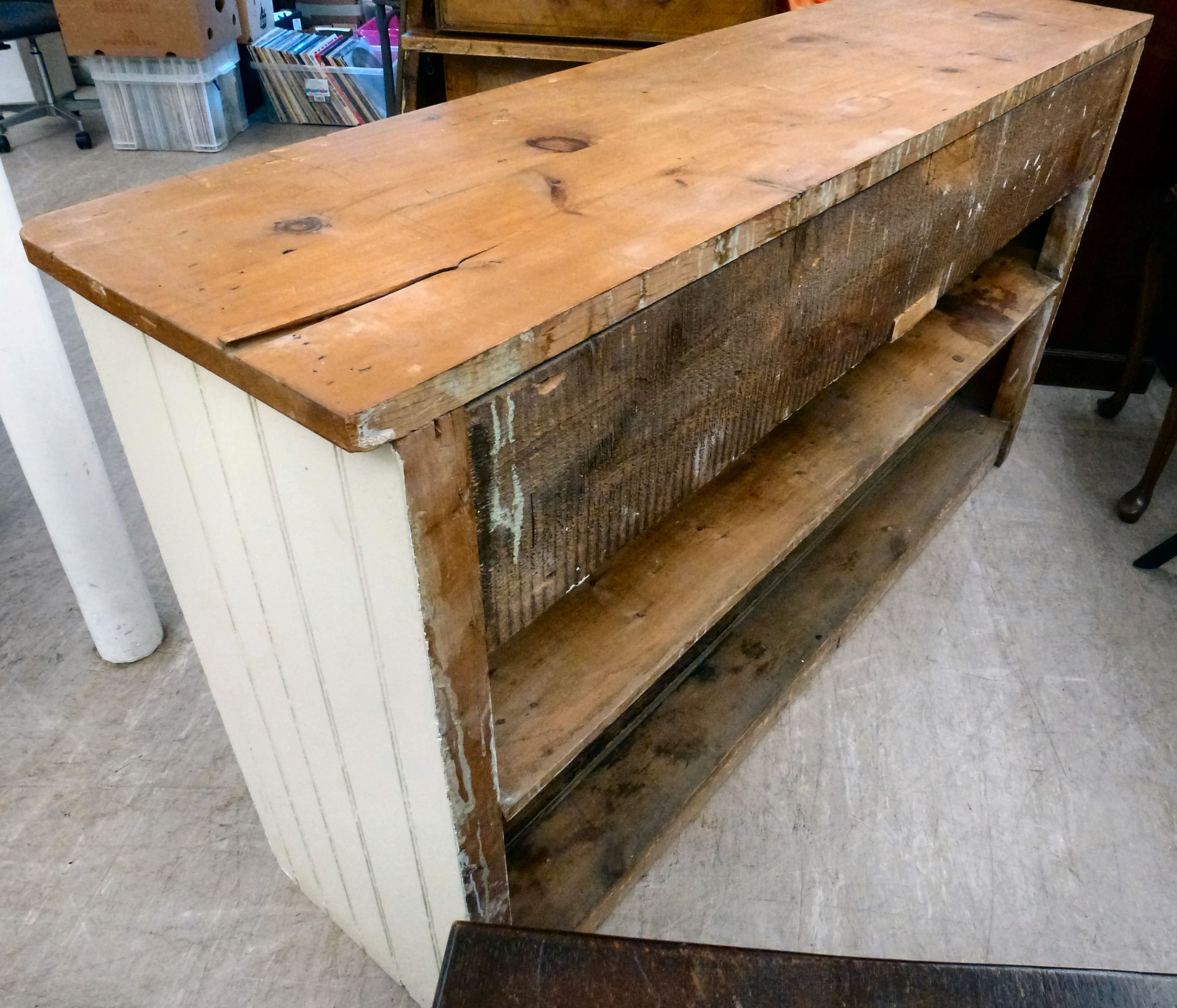 A late 19thC and later cream painted wooden sideboard, the showwood pine surface over two drawers/two cupboard doors, raised on stubby block feet 37"h 67"w