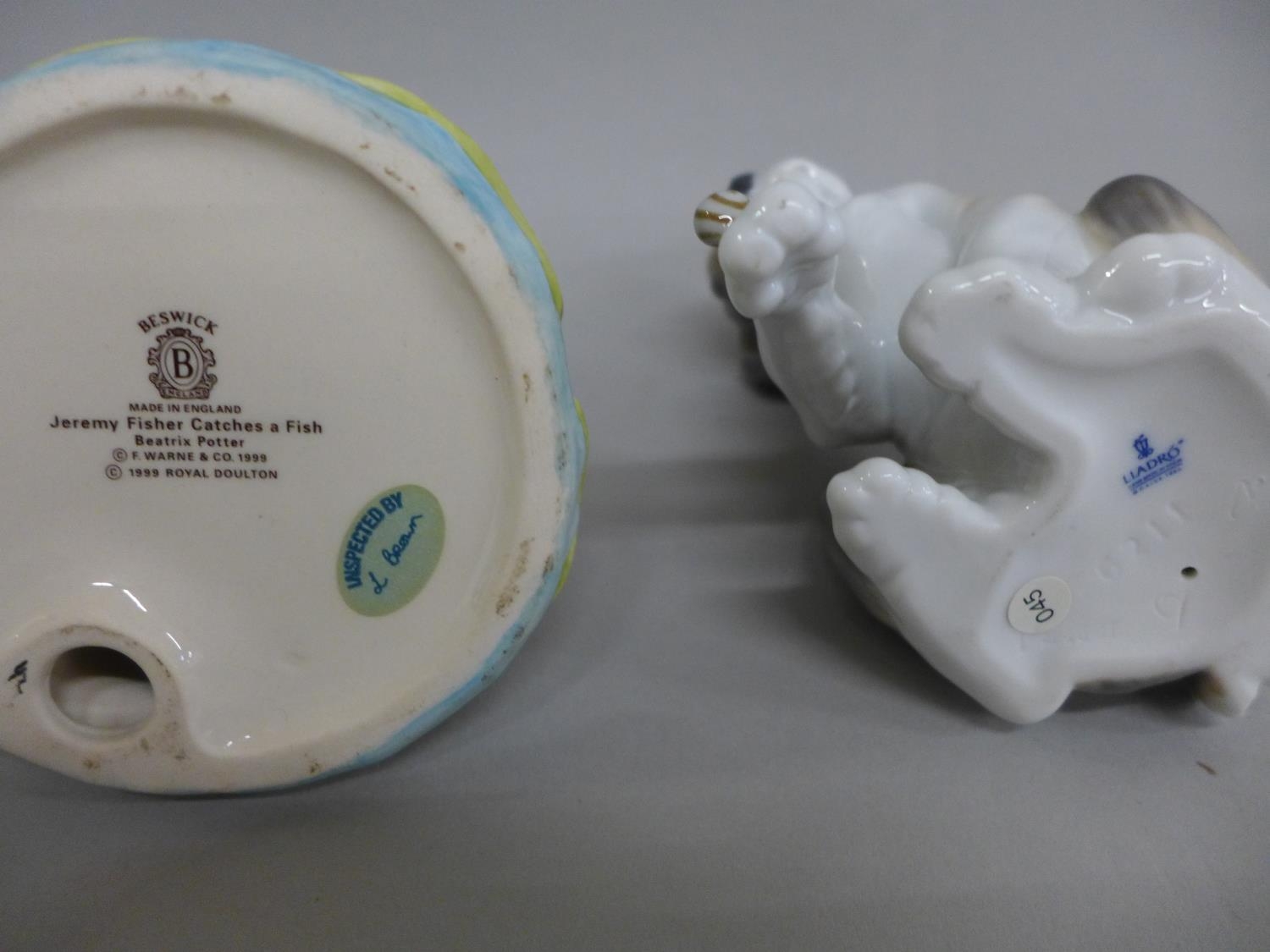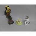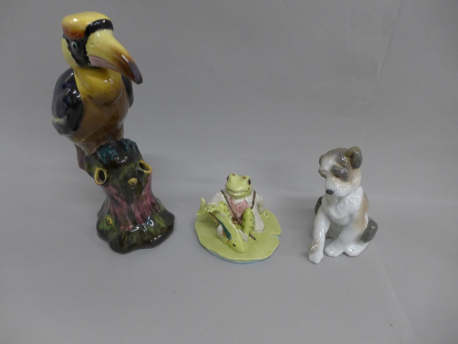 A Beswick Jeremy Fisher Catches a Fish, a Lladro model of a dog and a hat pin stand in the form of a tropical bird, (3), (beak a/f)