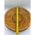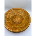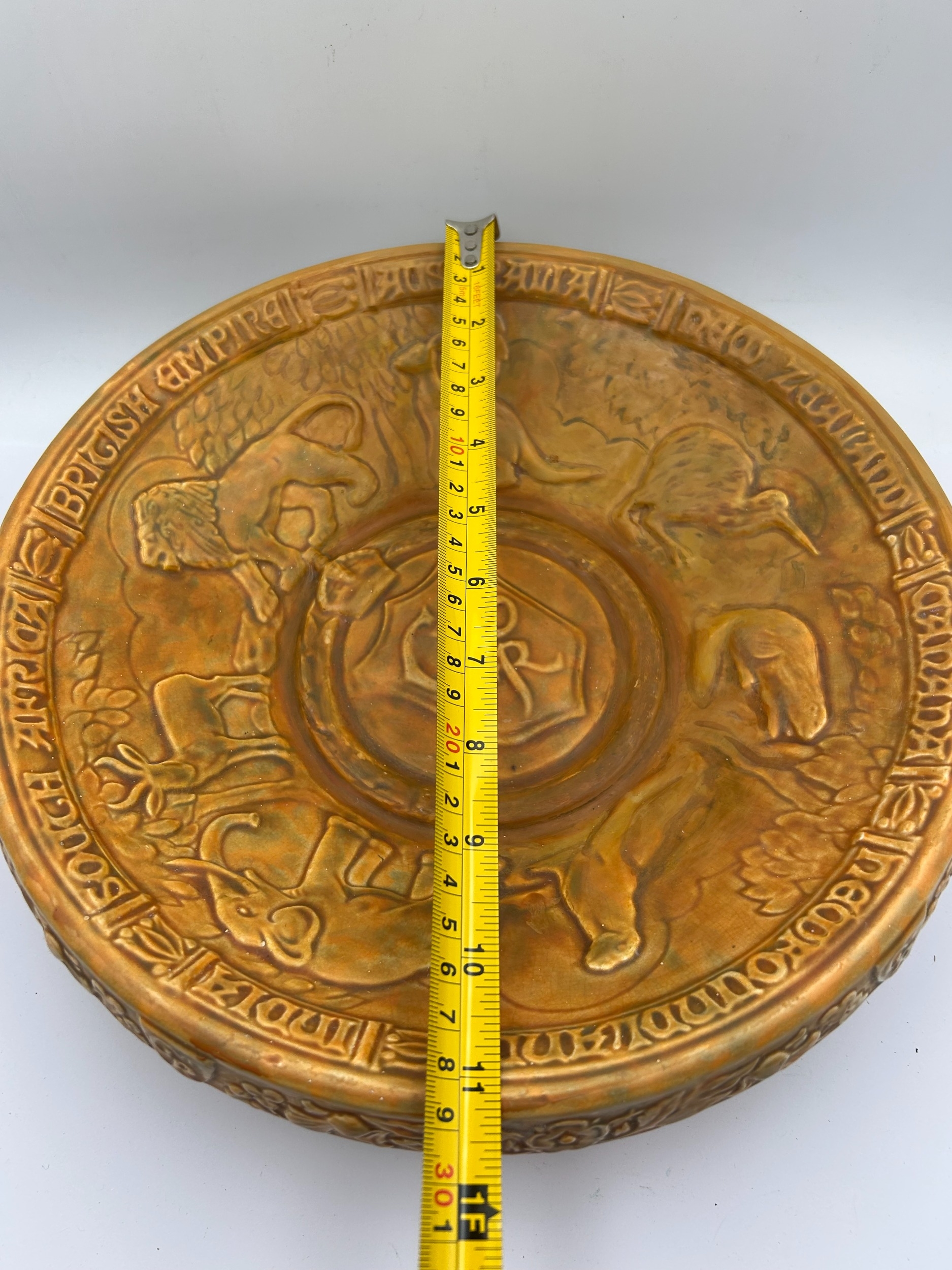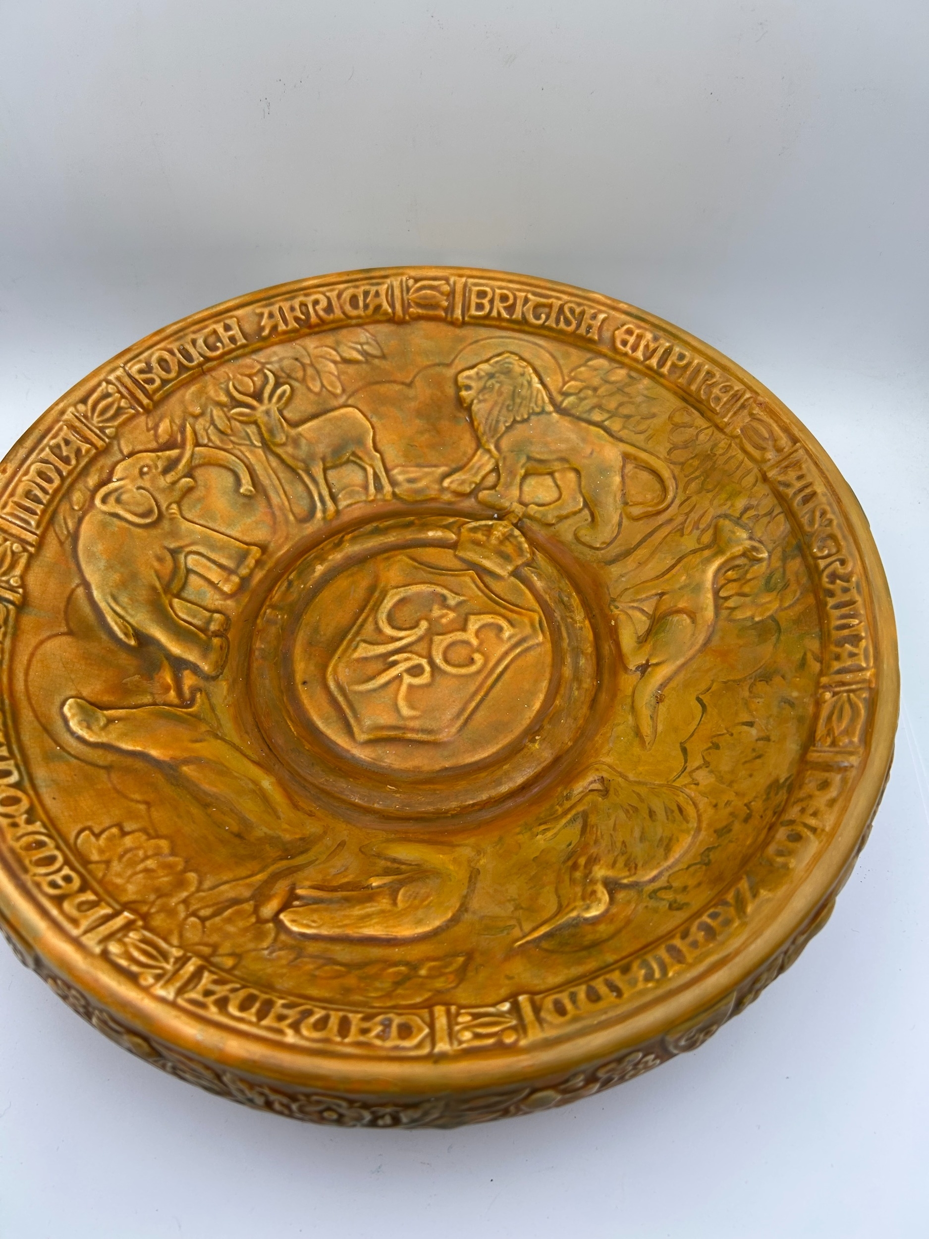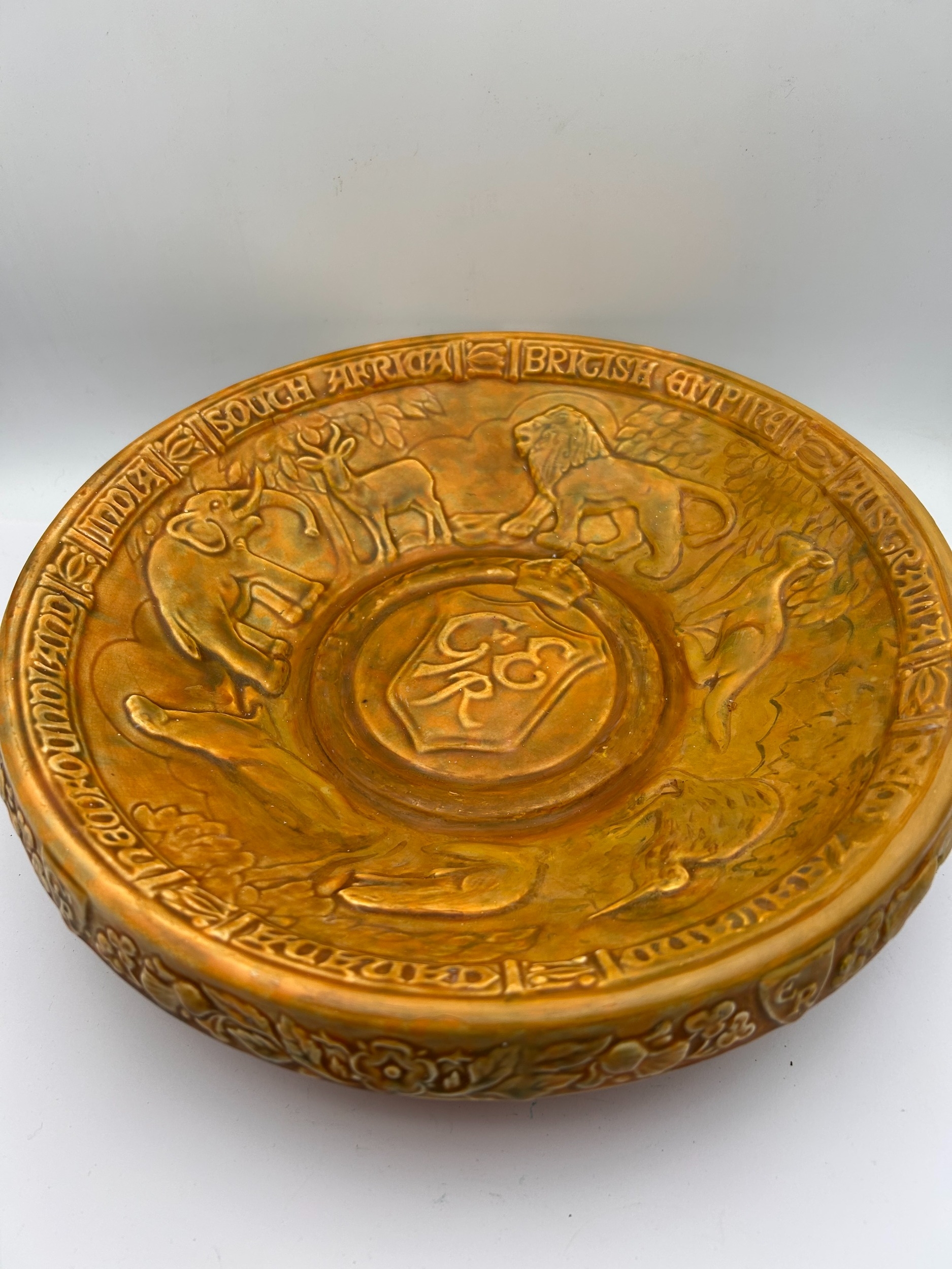 A single, large commemorative earthenware plaque or charger manufactured by Wade Heath Pottery in England. The object is finished with a mottled bronze-effect glaze and features a heavily relief-molded design centered on the theme of the British Empire. The central design displays symbolic animals, including a lion, an elephant, and a kangaroo, representing the Dominions, surrounding a central raised cipher. The rim is inscribed with raised text including "SOUTH AFRICA," "BRITISH EMPIRE," and "AUSTRALIA." The reverse base is stamped with the manufacturer's mark reading "Wade Ware Pottery Hand Made By WADE HEATH ENGLAND."