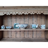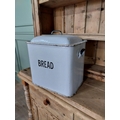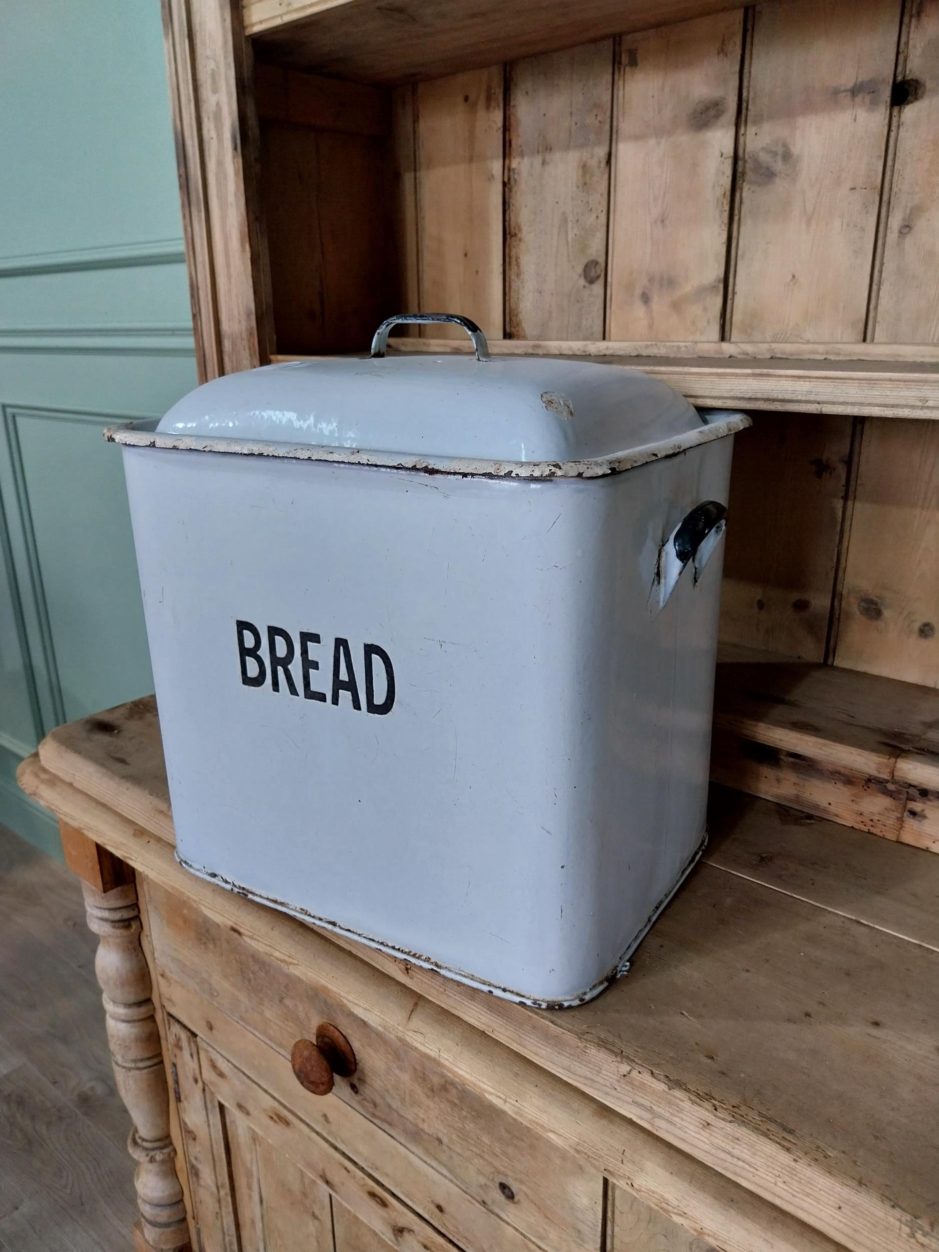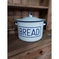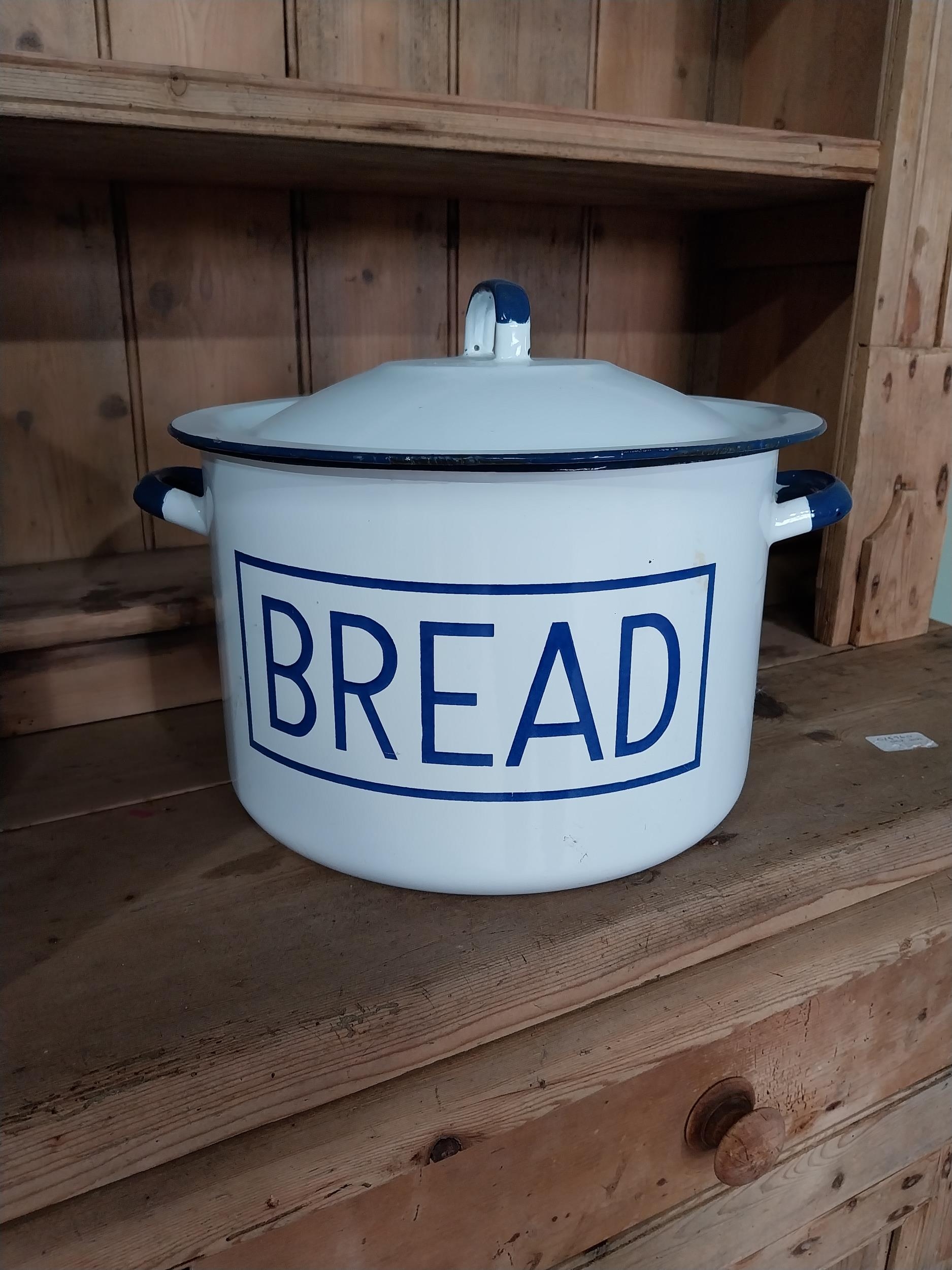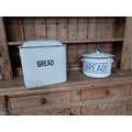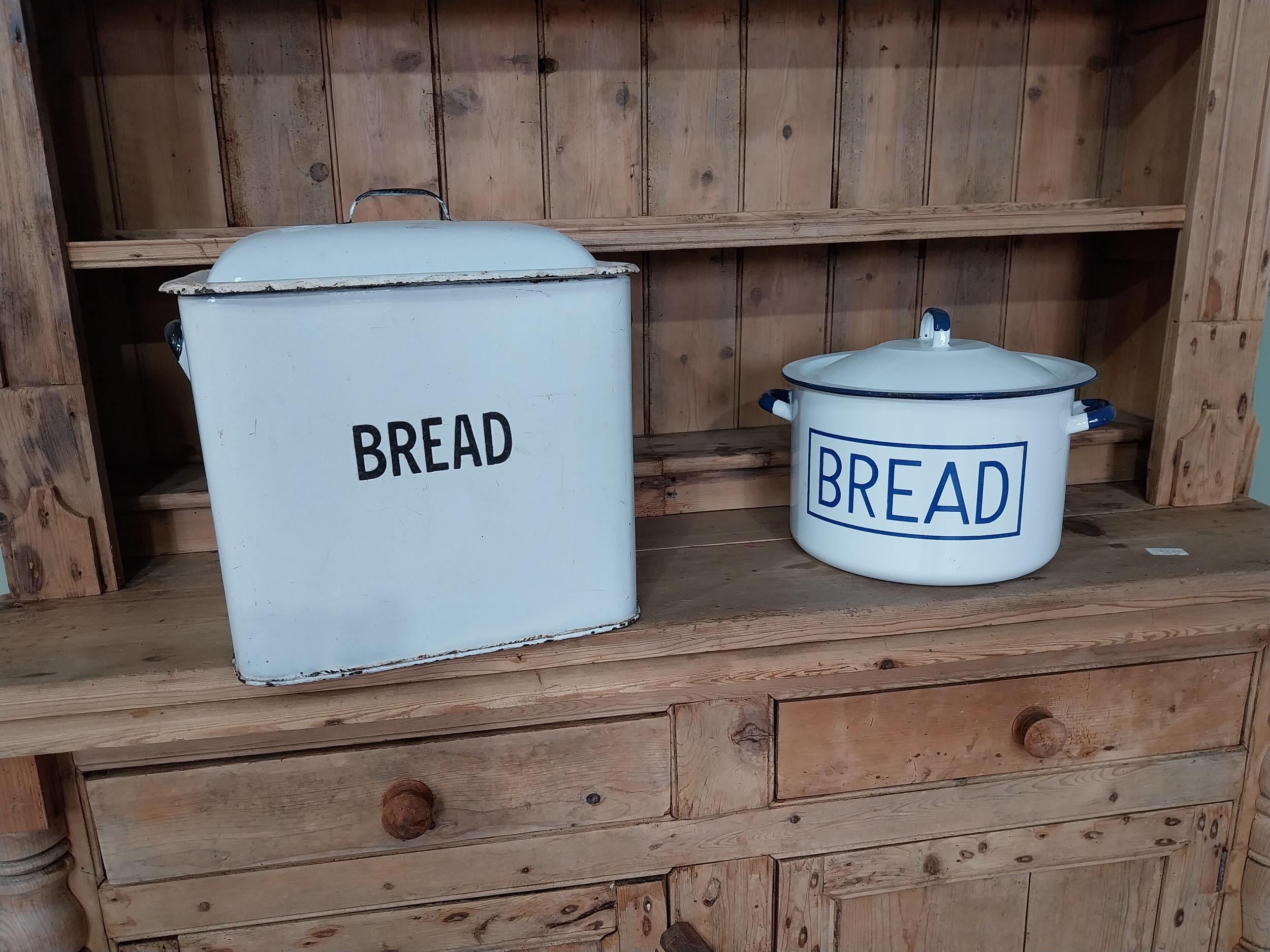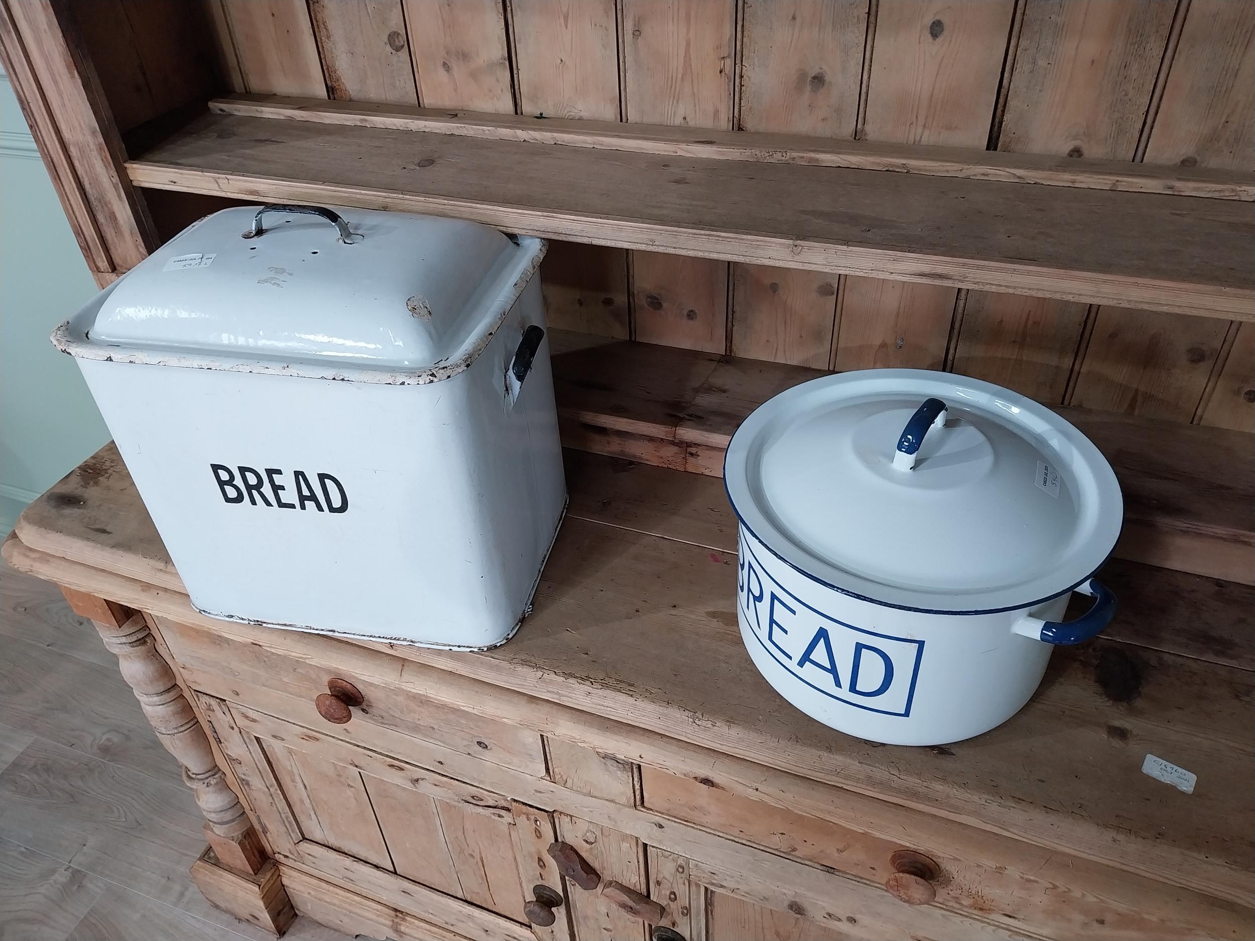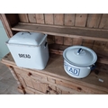Two early 20th C. enamel lidded bread bins {40 cm H x 42 cm W x 28 cm D and 28 cm H x 37 cm Dia.}.