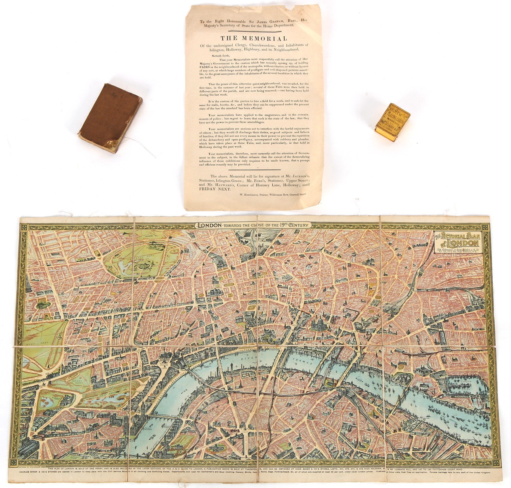 Property of a deceased estate - BAKER, Charles - 'The Pictorial Plan of London' or 'London towards the Close of the 19th Century' - a folding colour lithographic map, circa 1900, 15.75 by 27.95ins. (40 by 71cms.) (overall); together with a Victorian printed notice regarding nuisance fairs held in Islington, Holloway, Highbury, and Its Neighbourhood, circa 1845; a Thomas De La Rue diary for 1869; and a packet of 'Pygmy Playing Cards', by Thomas De La Rue (4). Provenance - Francis Woodland Reader (1864-1951), and thence by family descent.