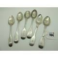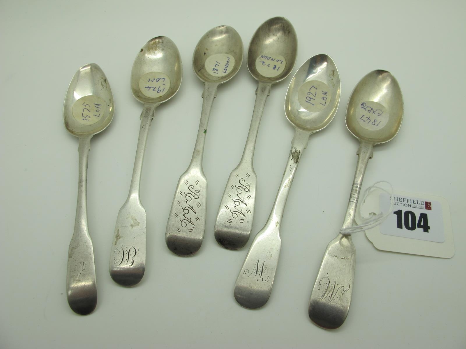 A Pair of Hallmarked Silver Fiddle Pattern Teaspoons, London 1871, initialled; together with four further hallmarked silver fiddle pattern teaspoons, initialled (120grams). (6)
