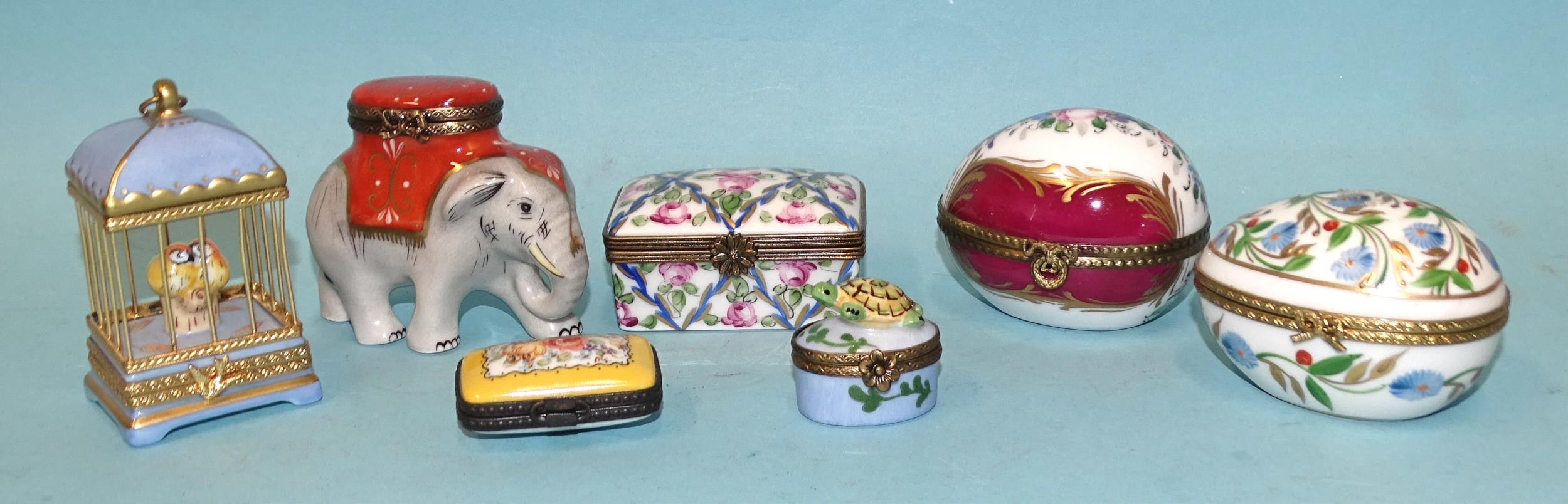 A collection of seven various Limoges France porcelain boxes marked Peint Main, including two lovebirds in cage, 7cm high, an elephant 5.5cm high, two oval and one rectangular box with floral decoration, a small oval box with tortoise on top and a small rectangular floral-decorated box, (7).