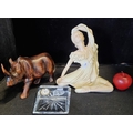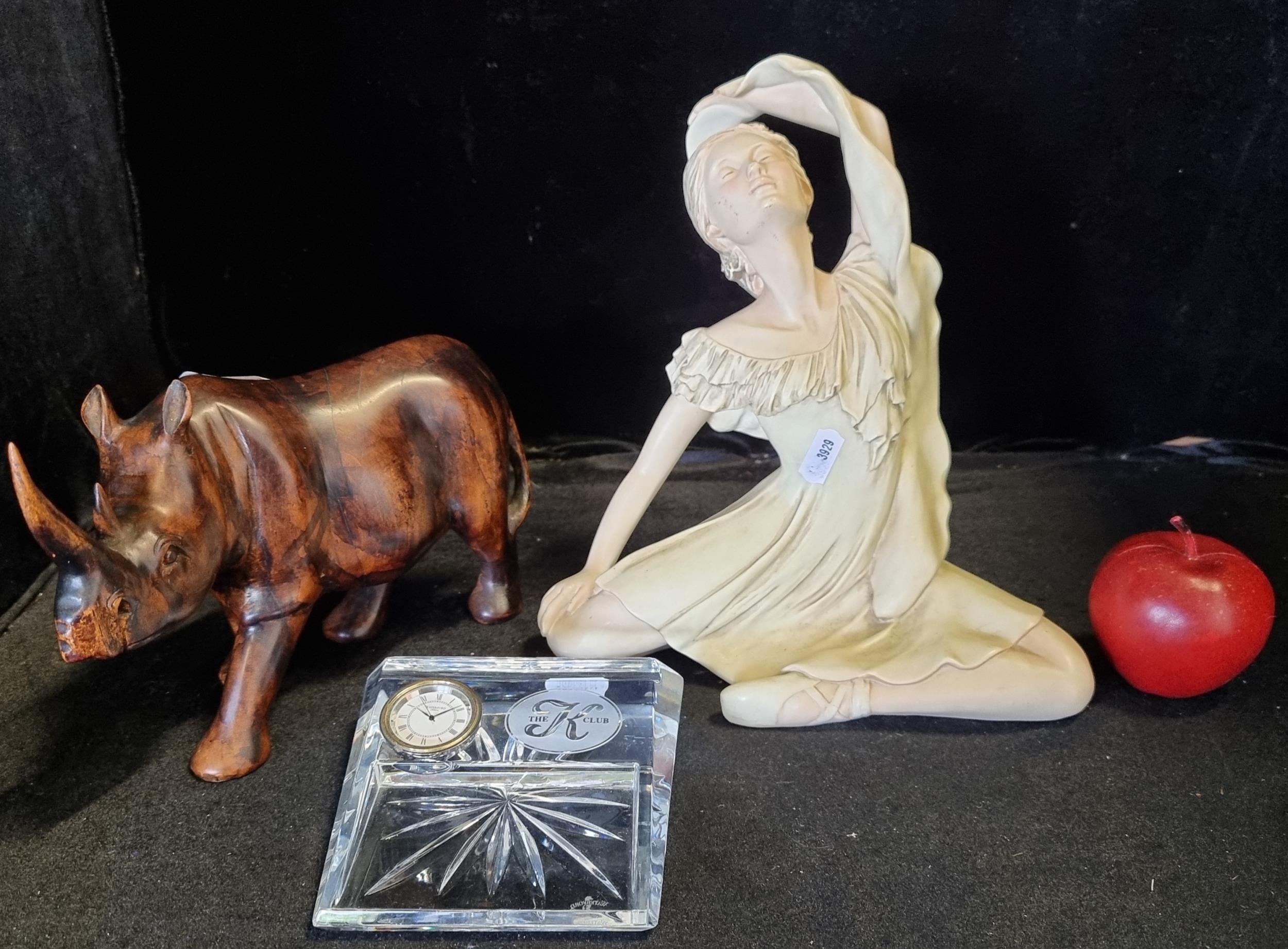 A mixed lot of three items including a Waterford crystal bedside clock, a carved wooden rhinoceros and a ceramic figure of a woman by Adonis, made in Ireland.