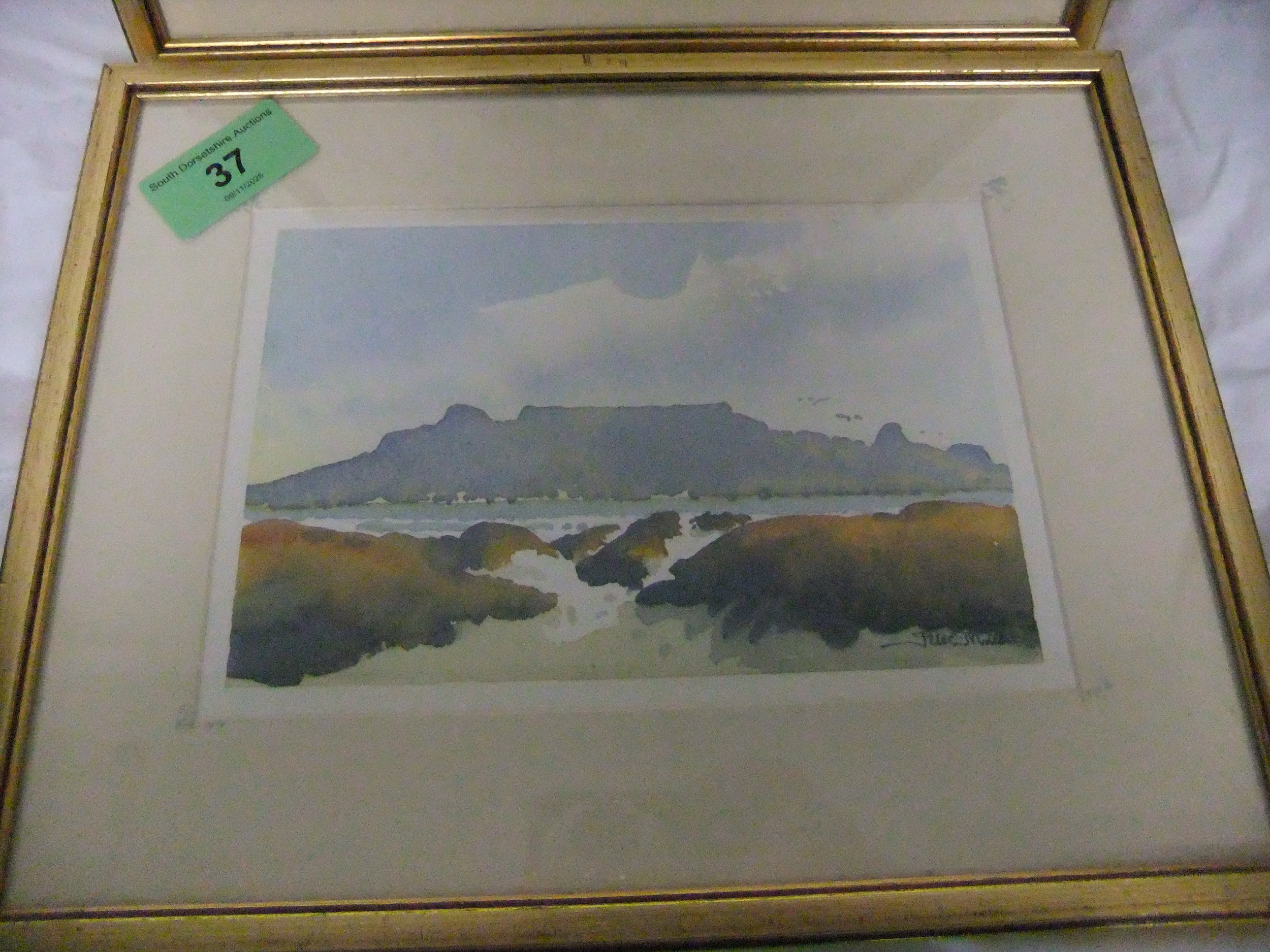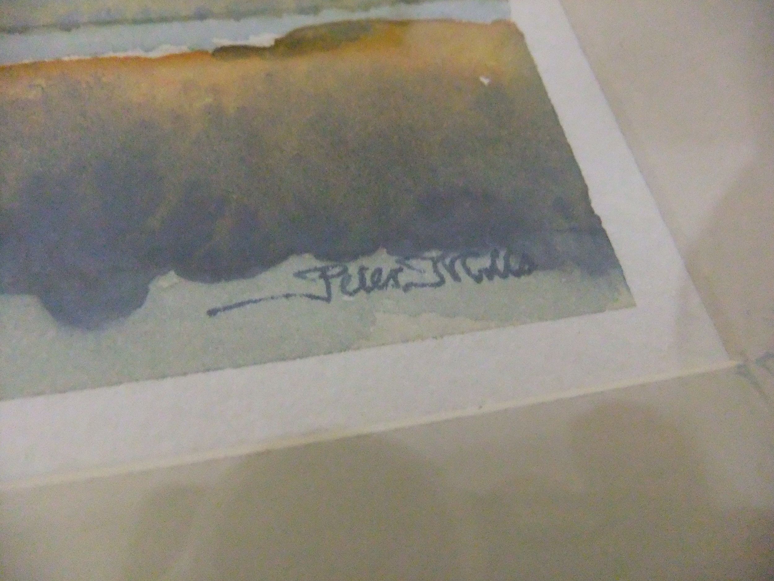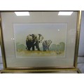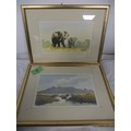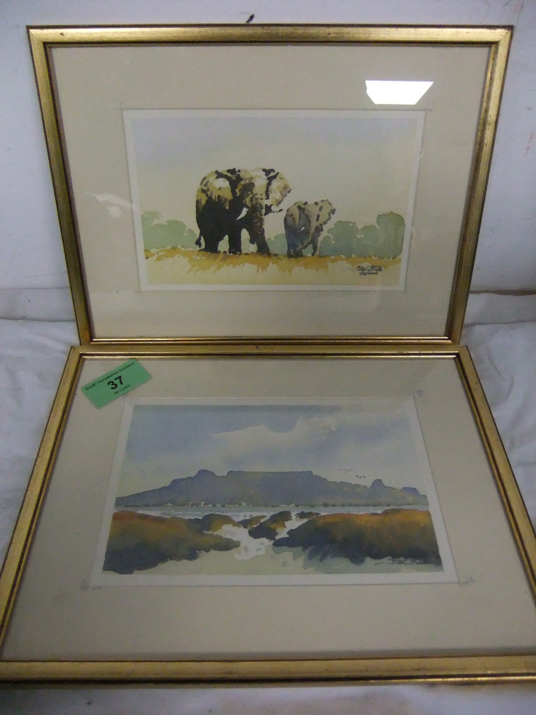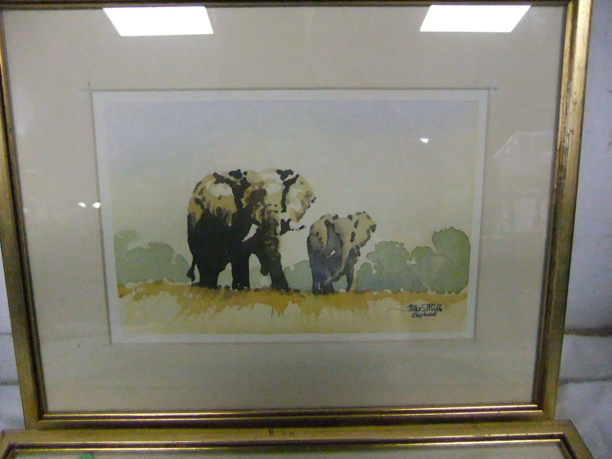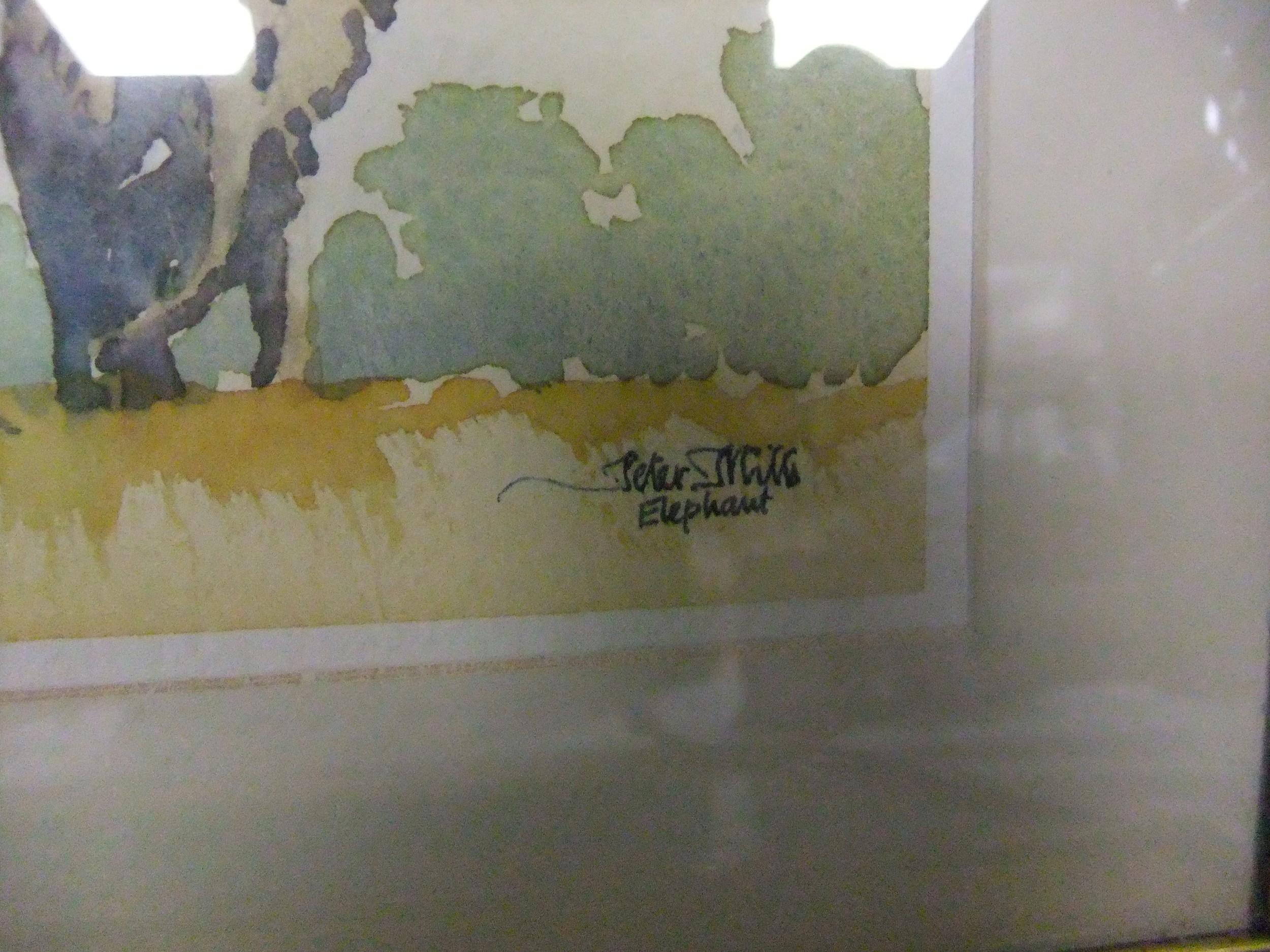 A pair of small watercolours by Peter White, one of elephants, the other of a landscape, both nicely framed and glazed