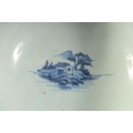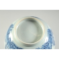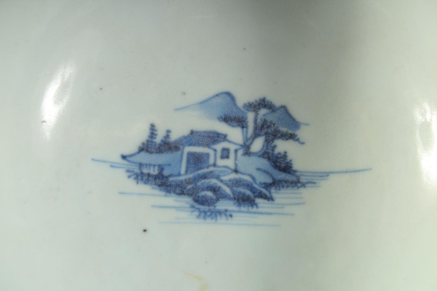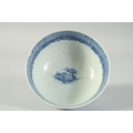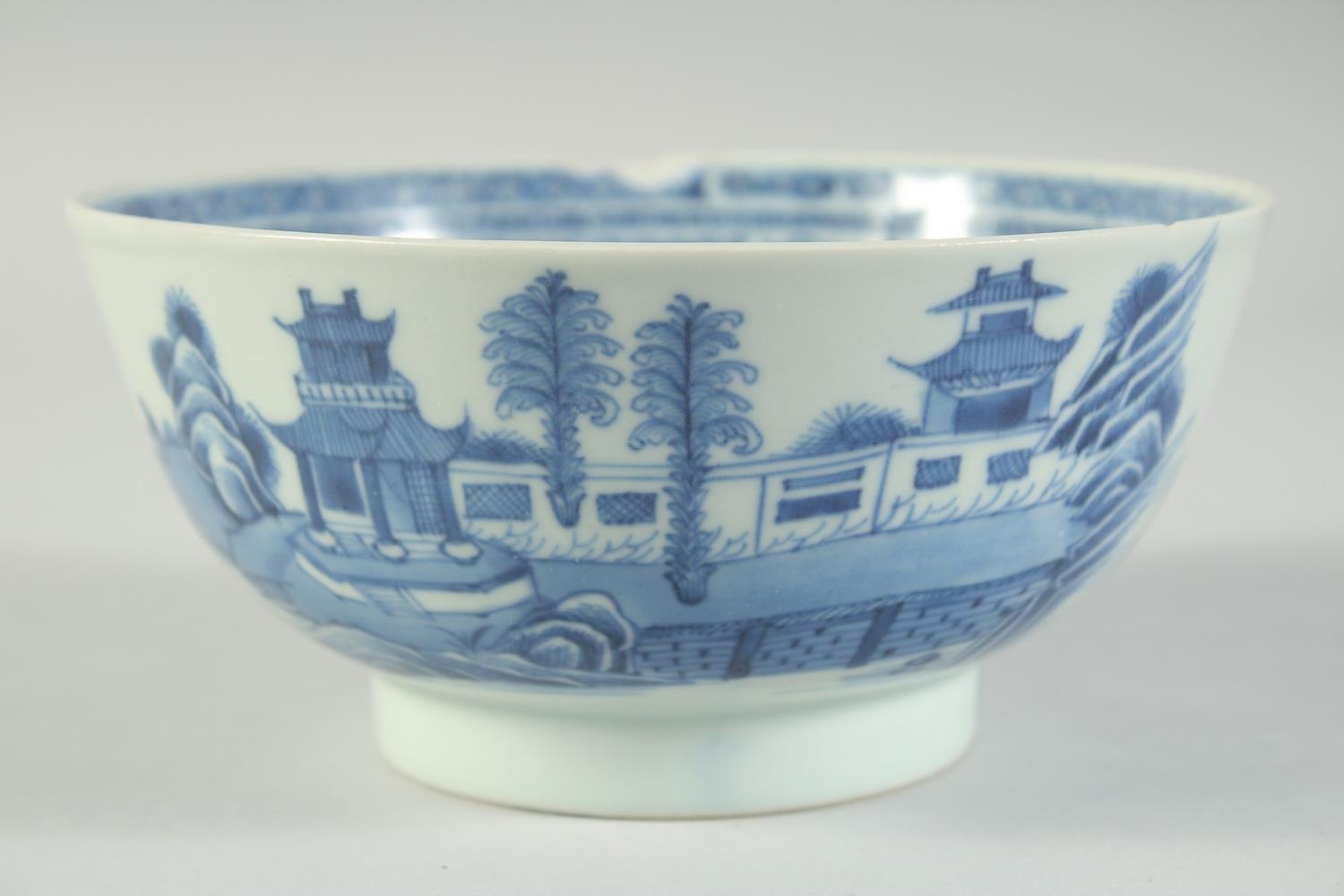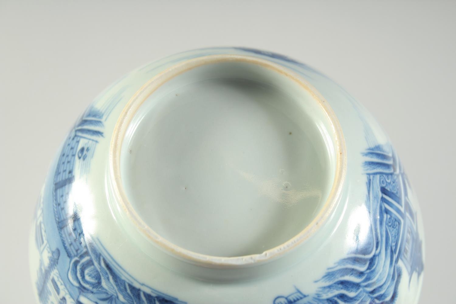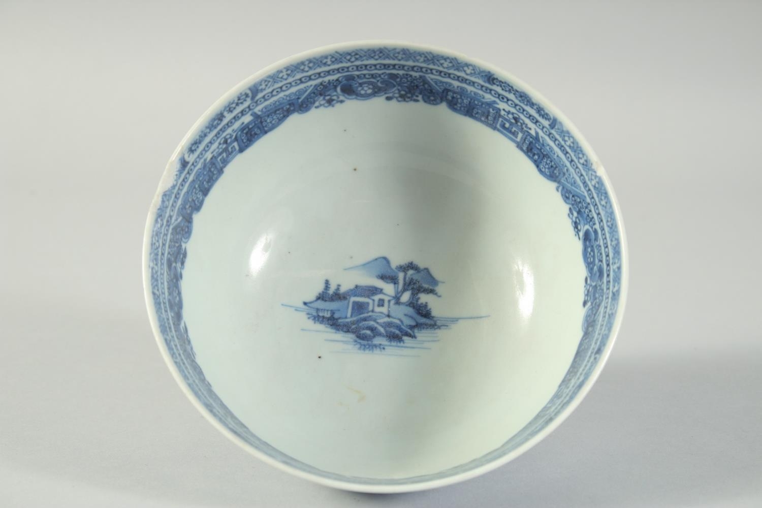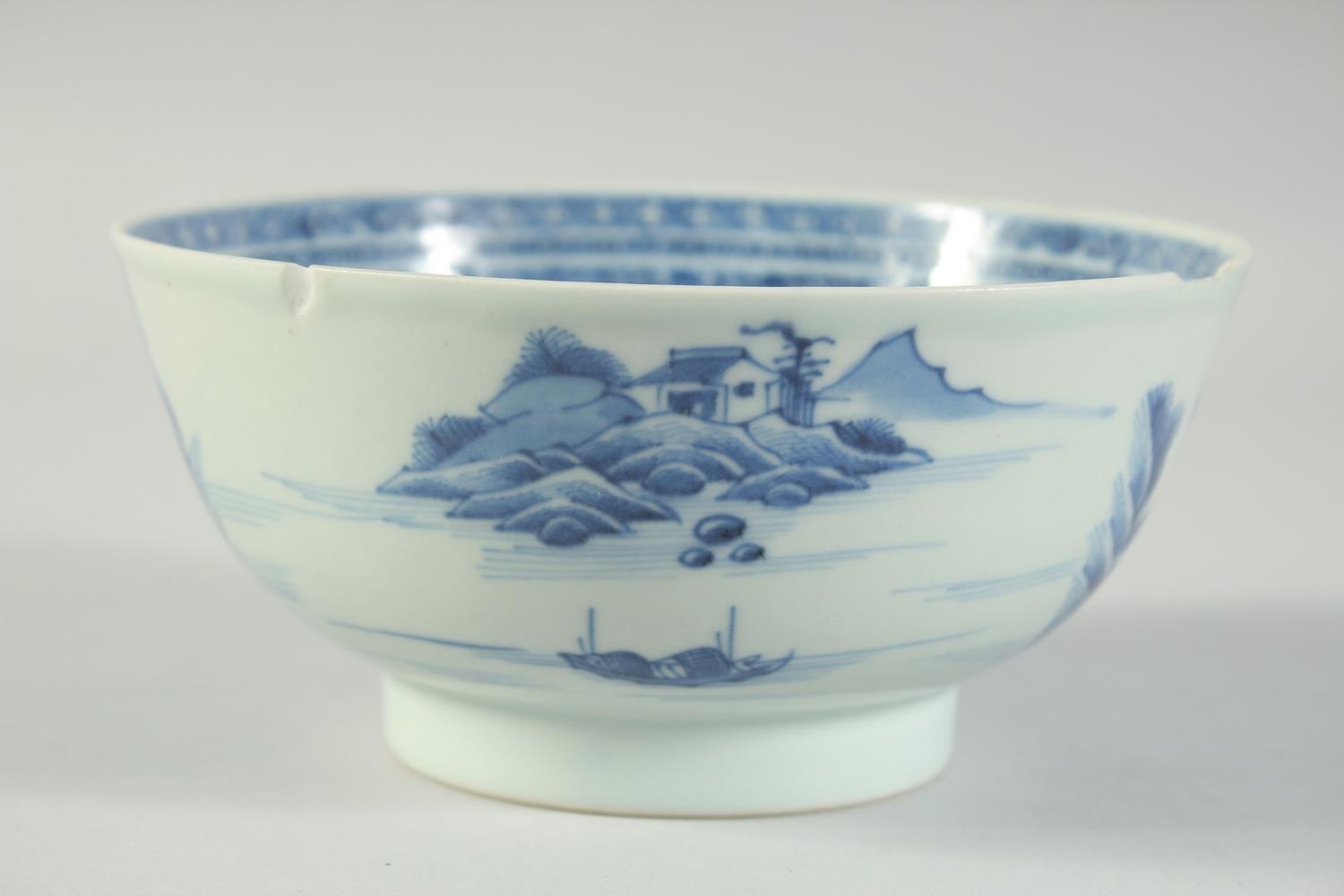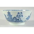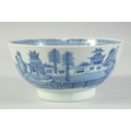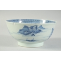 AN 18TH CENTURY CHINESE EXPORT BLUE AND WHITE PORCELAIN BOWL, painted with landscape scenes, (faults), 17cm diameter.
