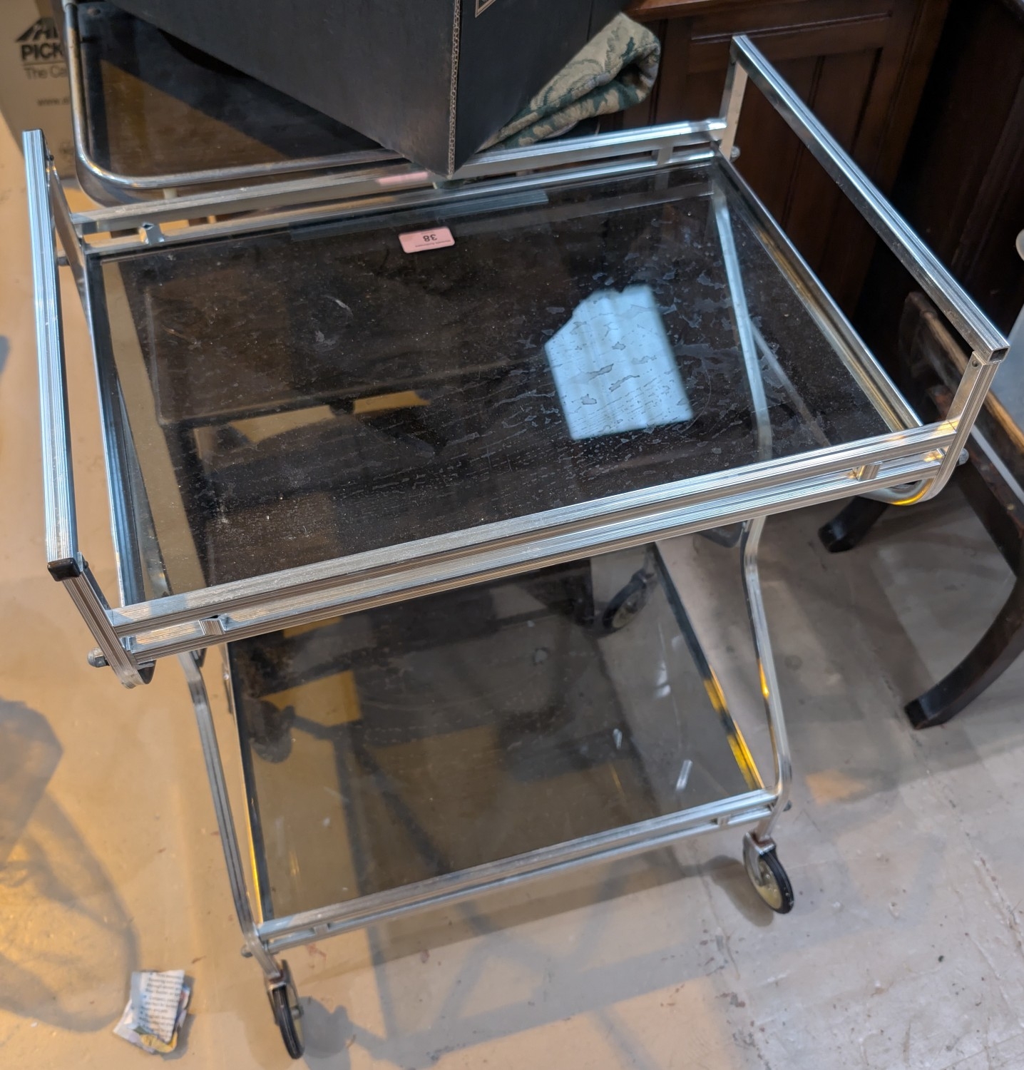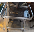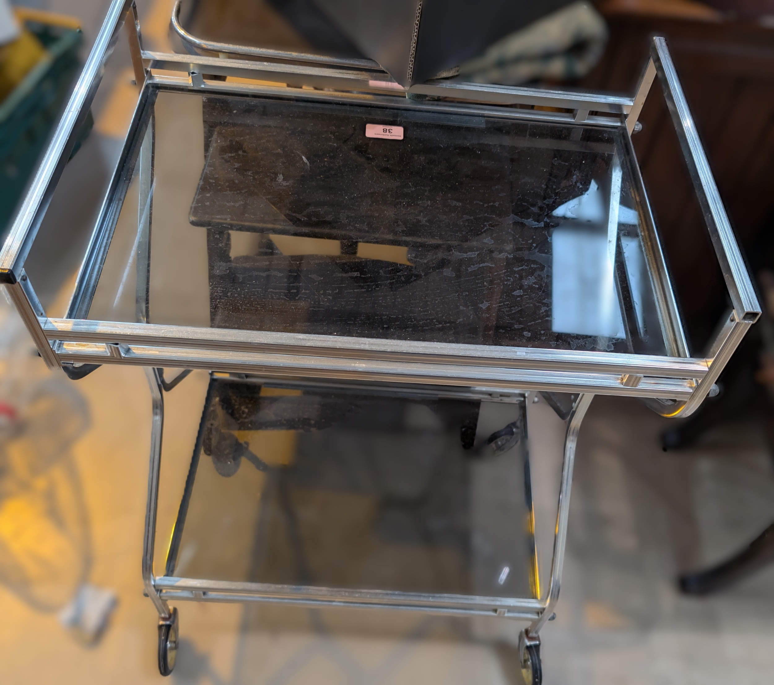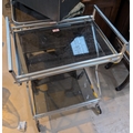 A 1970's 2 tier chrome and smokey glass drinks trolley.