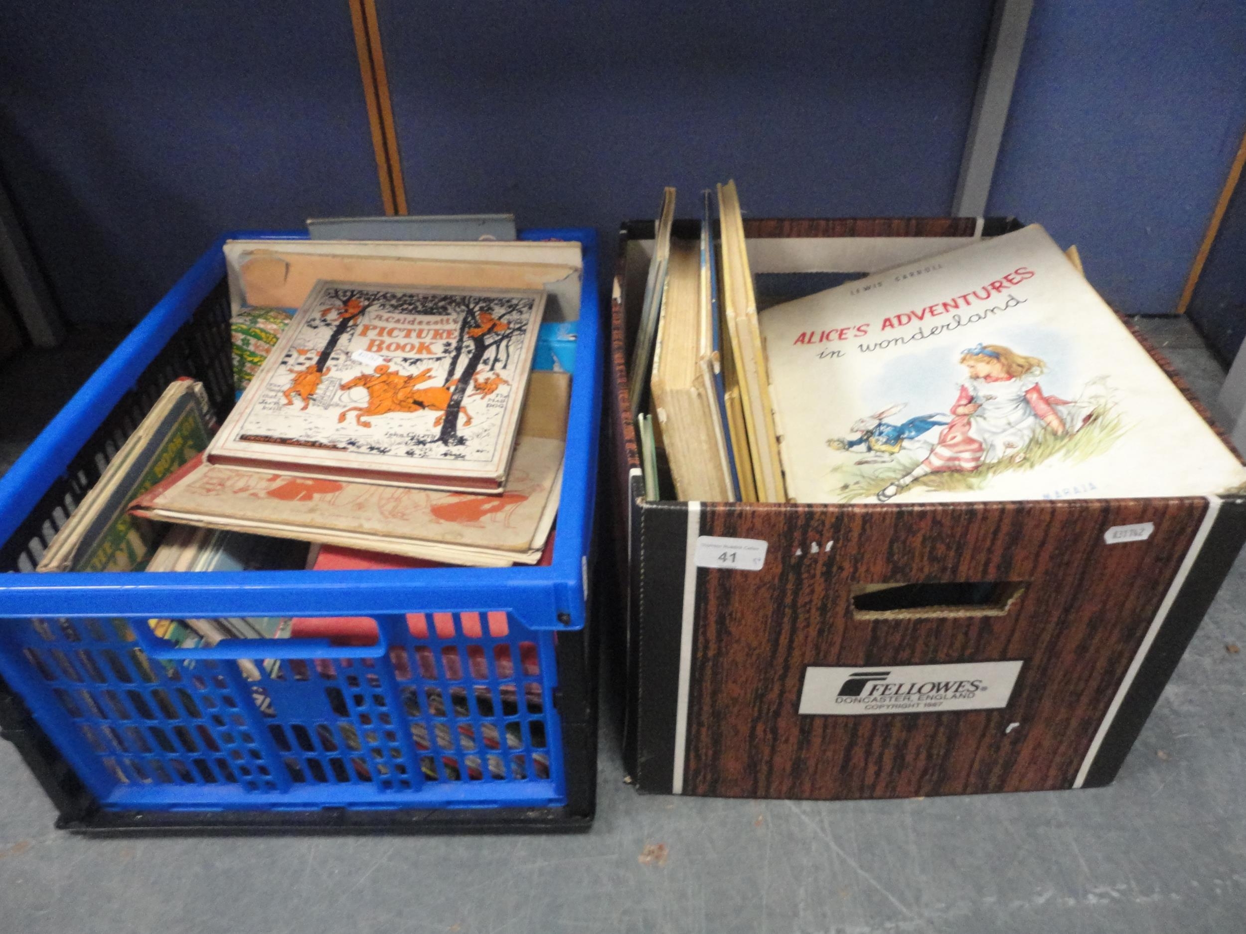 Two cartons of children's books to include Caldecott's Picture Book, Alice's Adventures in Wonderland, Ladybird books etc.