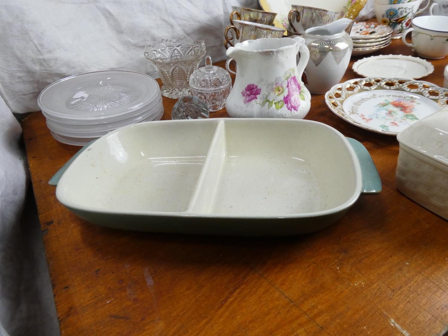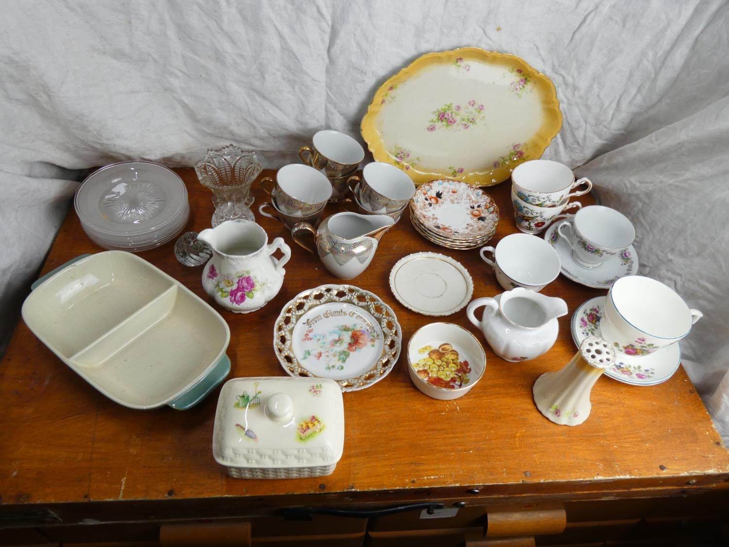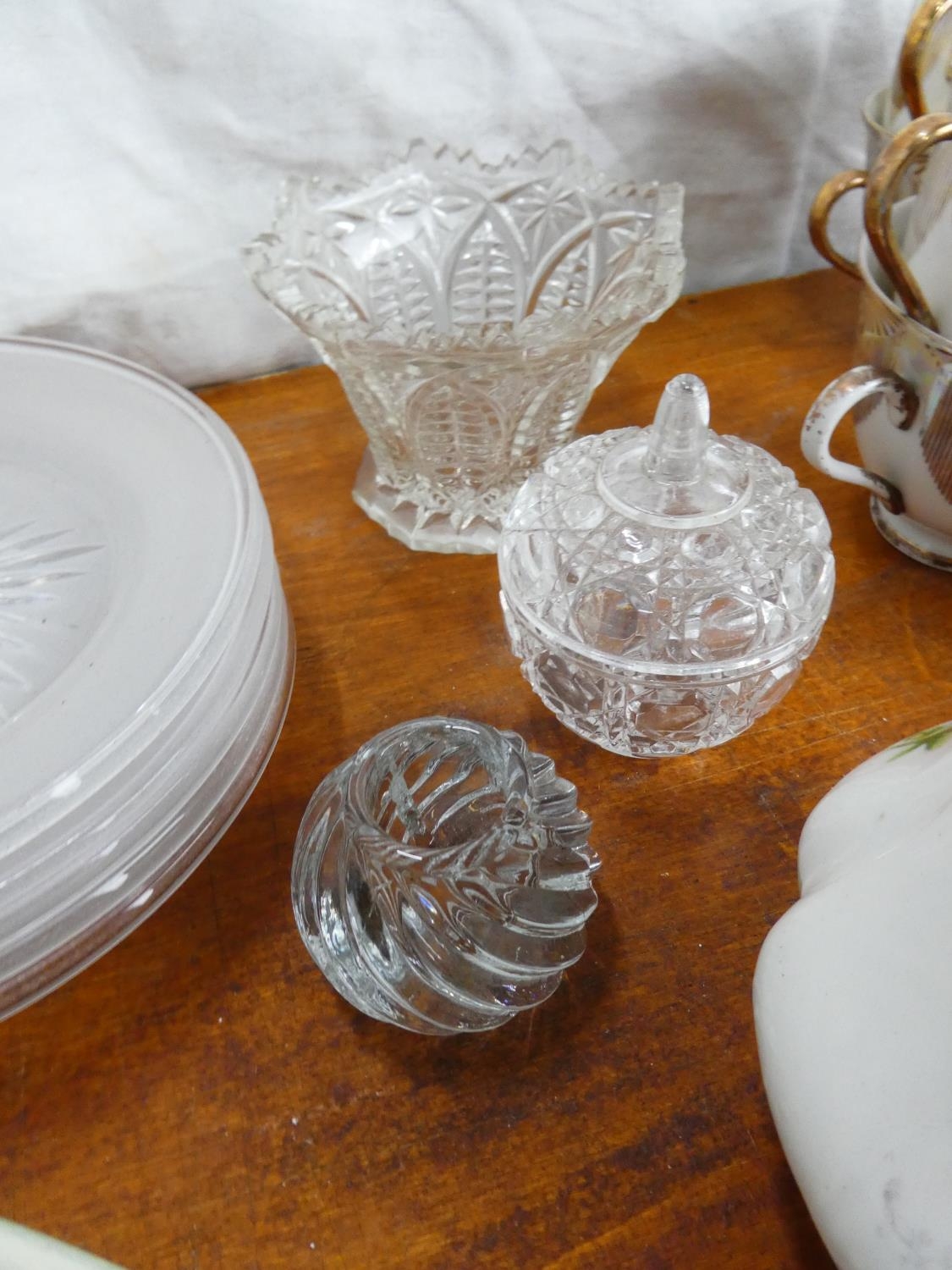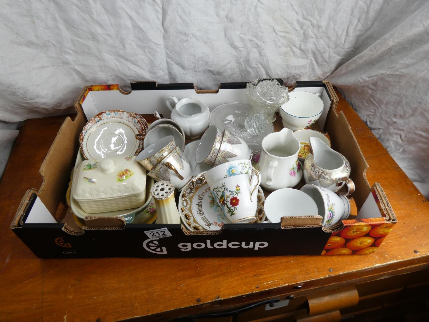 A boxed lot of ceramics and glass ware to include a Denby dish, an Aynsley butter dish and more.