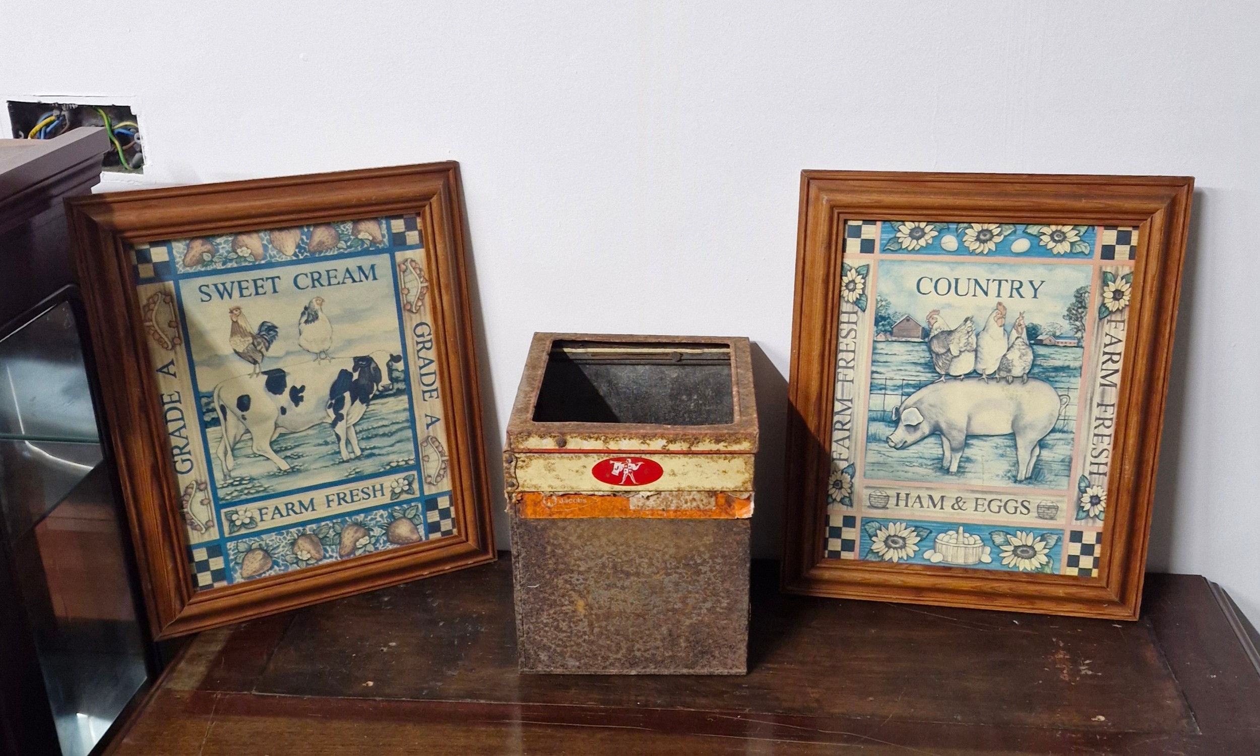 A Jacobs Biscuit tin and a pair of Butcher's wall art
