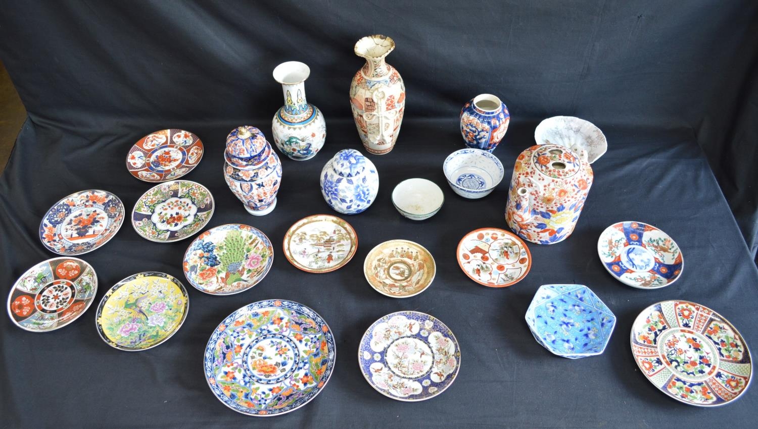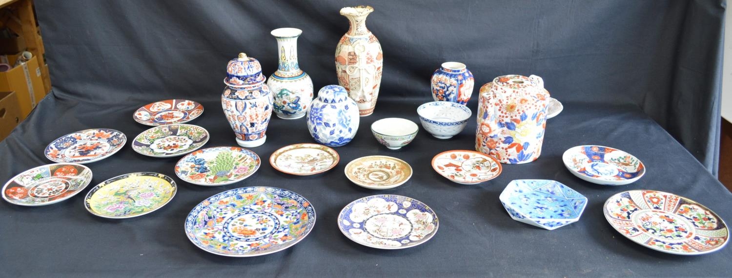 Collection of Oriental and other ceramics to include: plates, ginger jar and teapot etc together with a pair of glass candlesticks etc