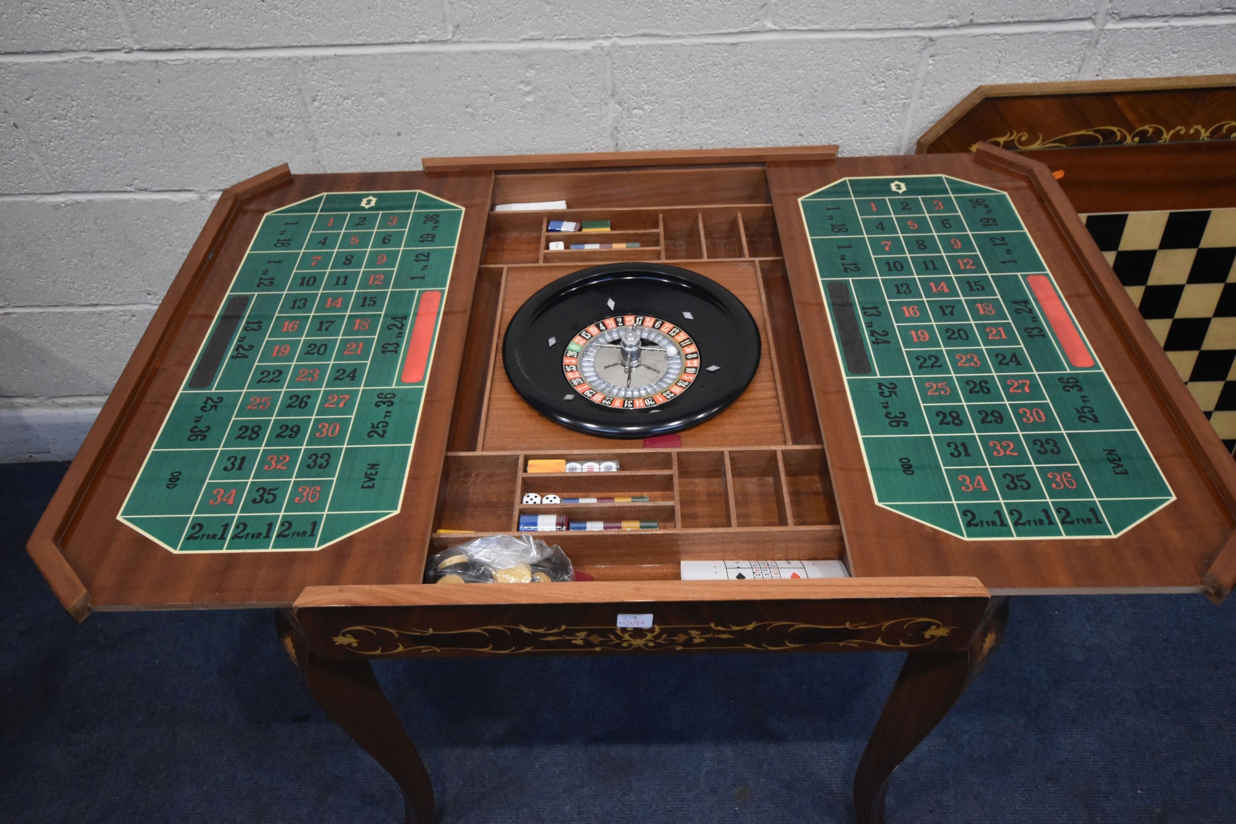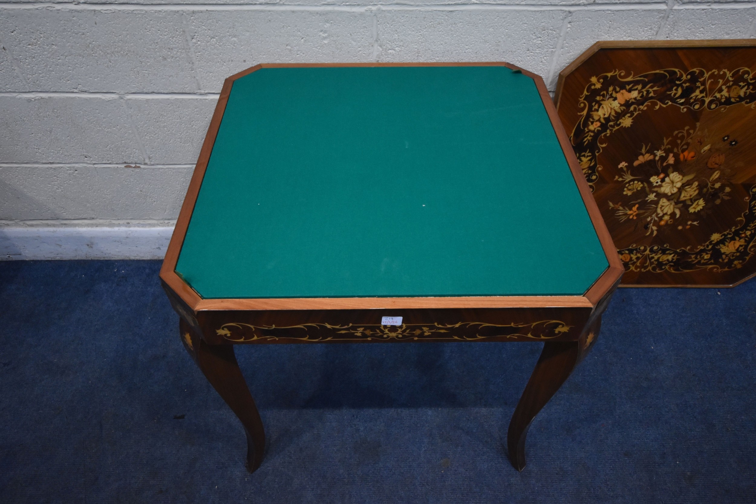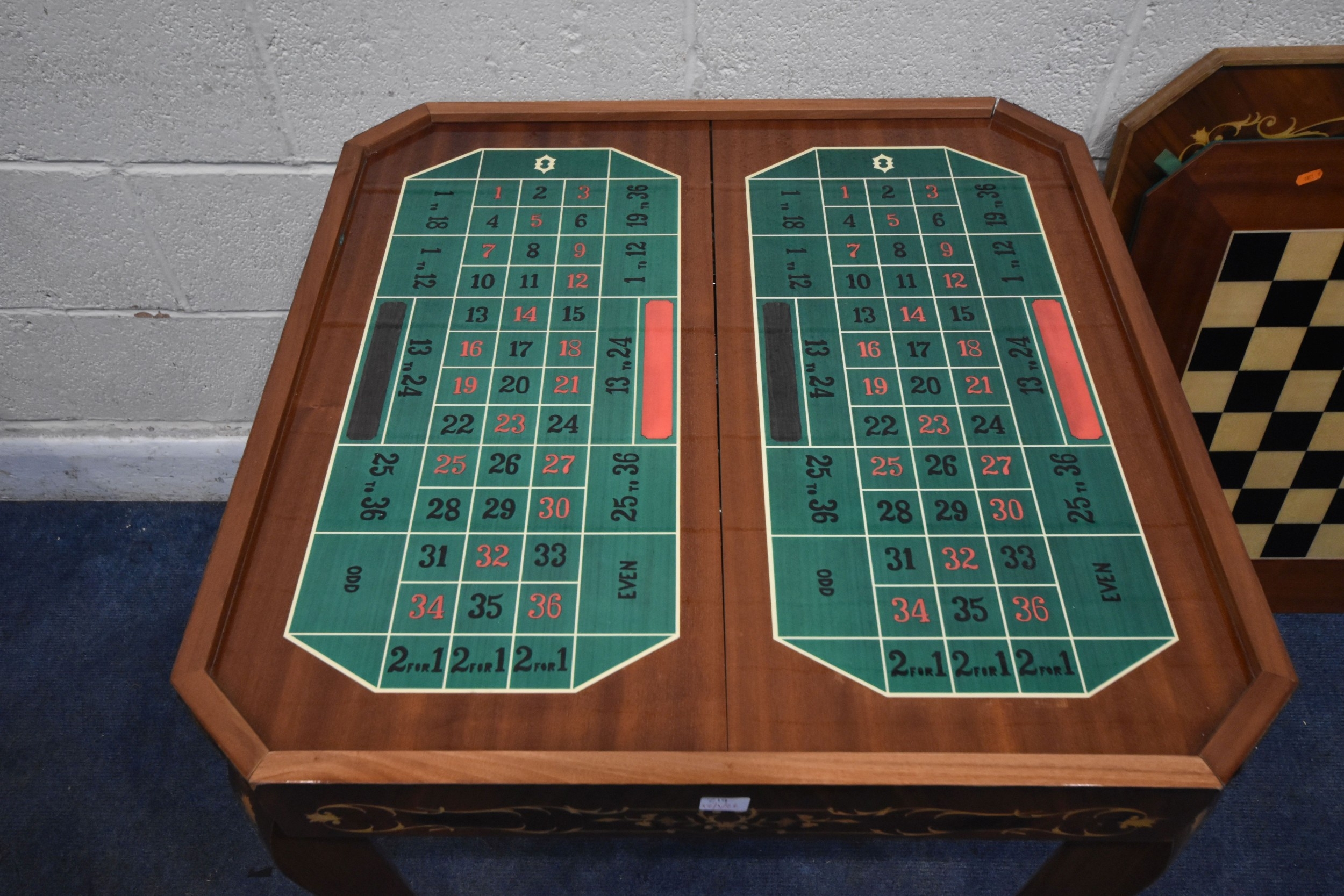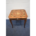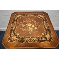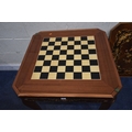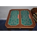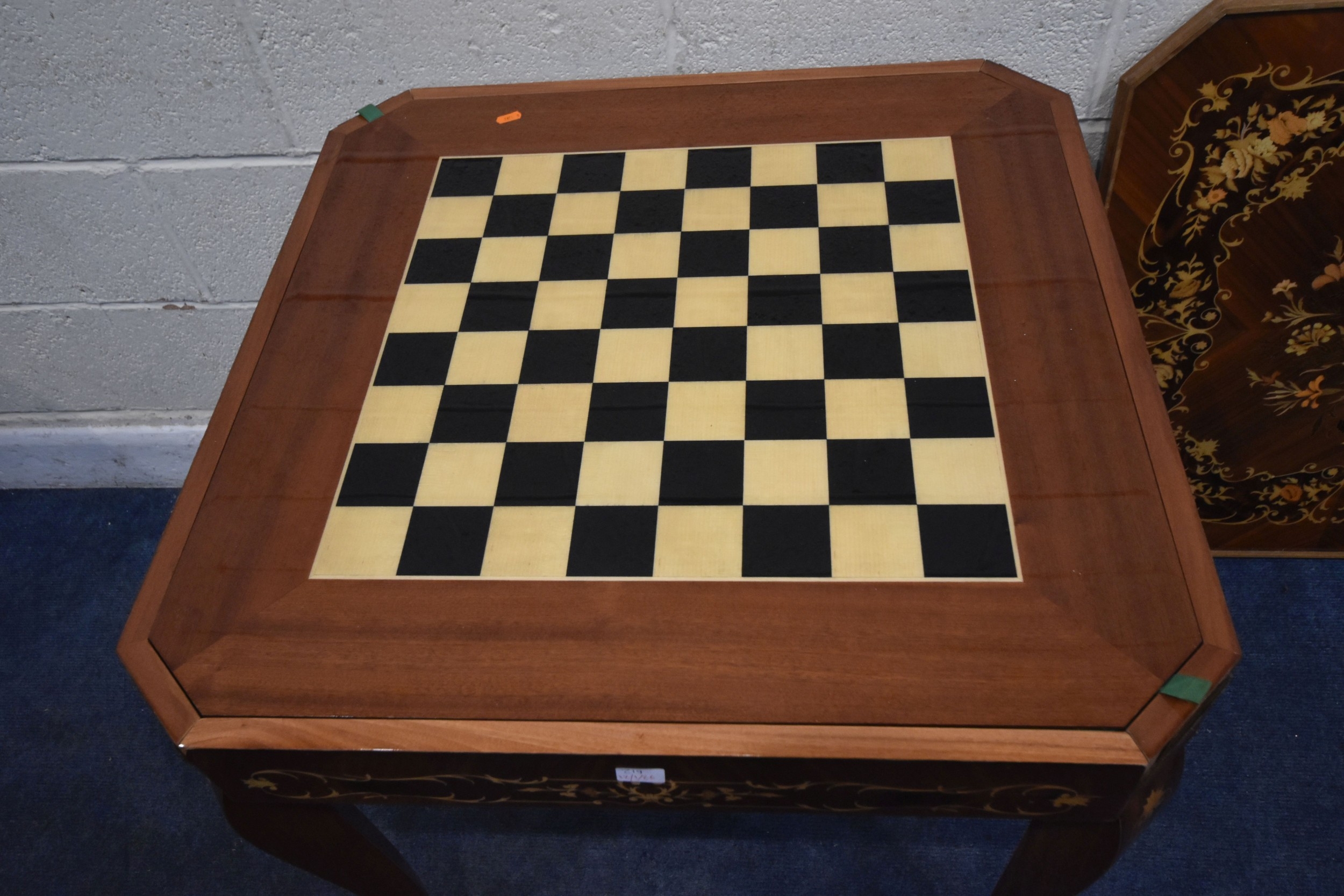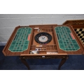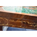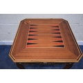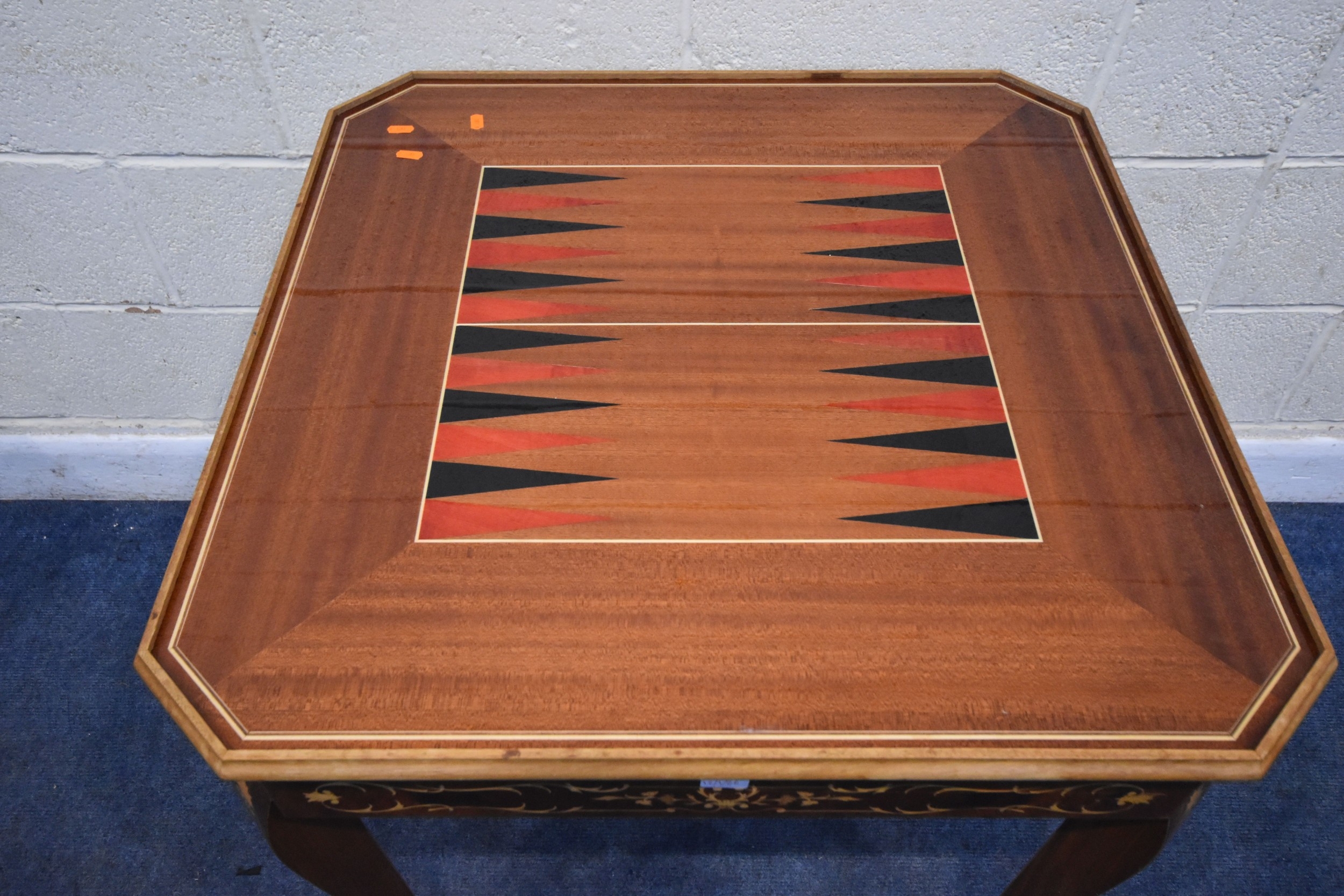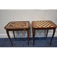 IN THE MANNER OF JANNUZZI OF SORENTO, AN ITALIAN GAMES TABLE, with foliate inlay, enclosing a variety of games and pieces, 78cm squared x height 76cm, condition report: marks, scuffs, veneer loss and lifting in places, other wear and usage