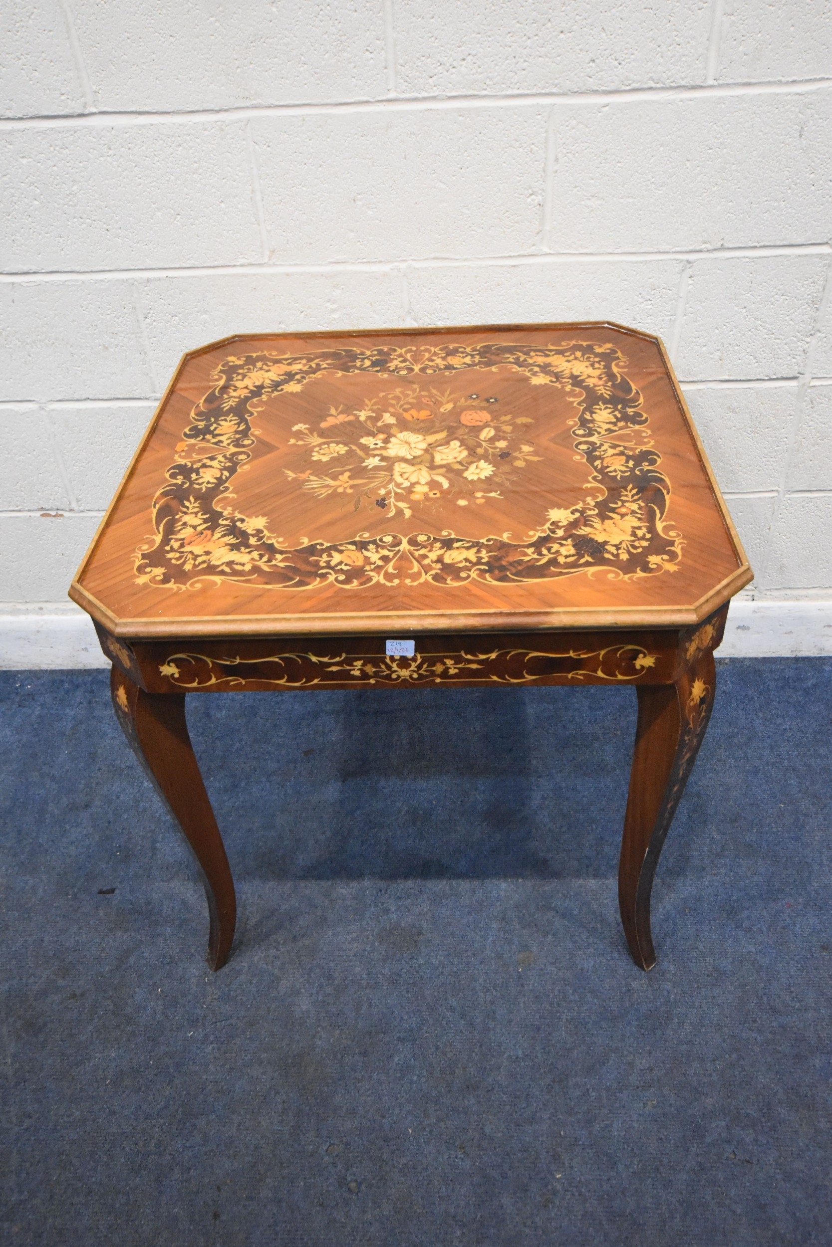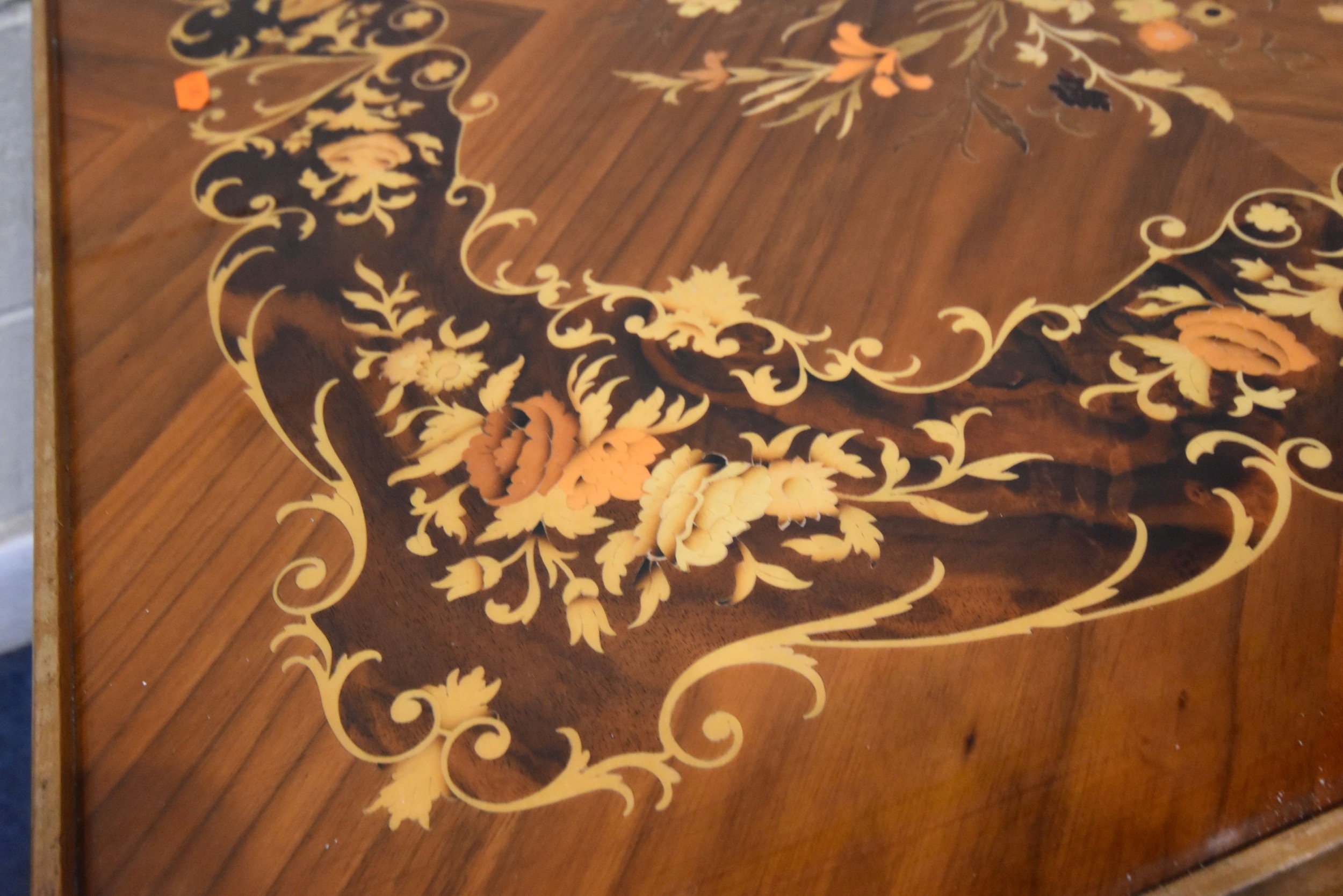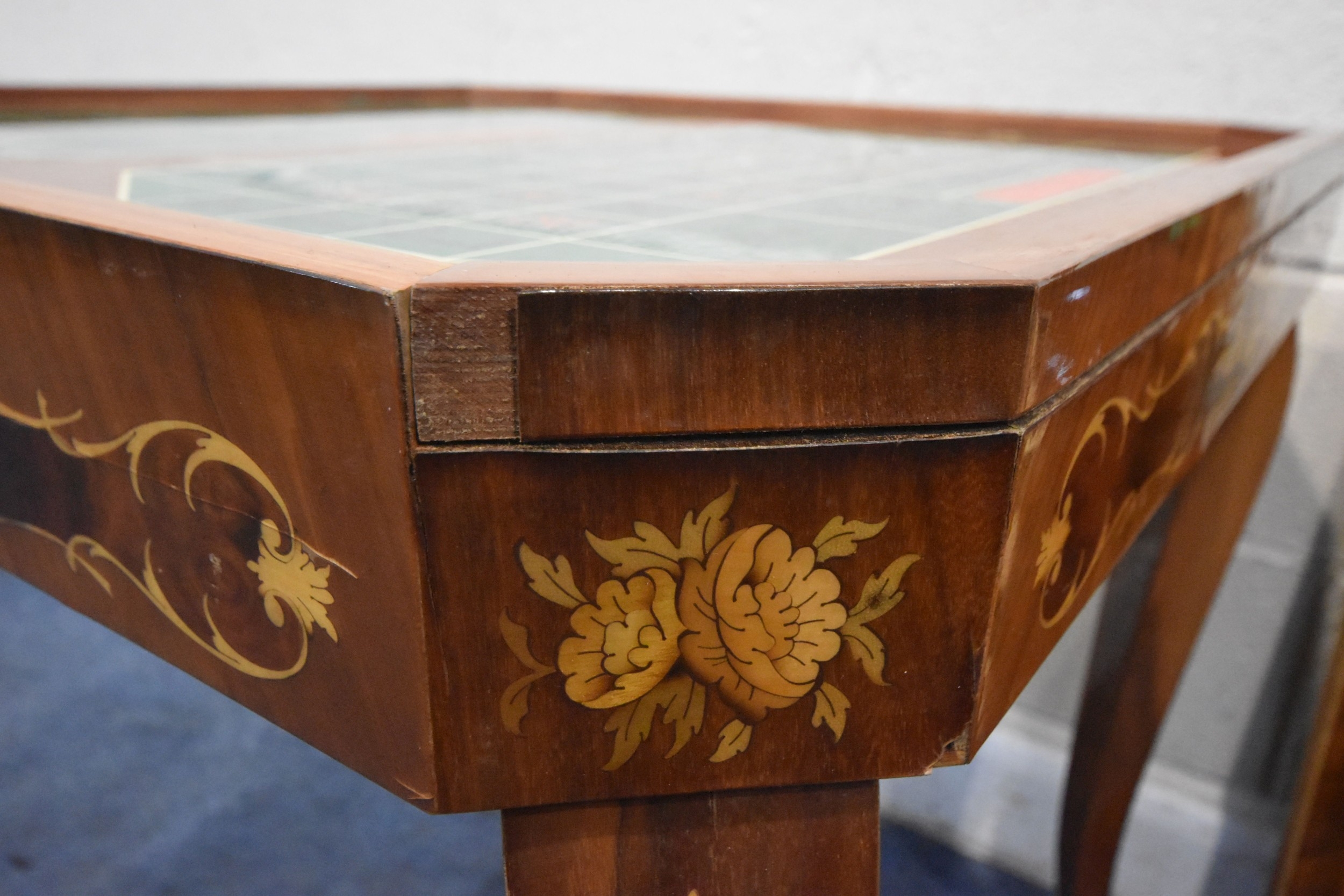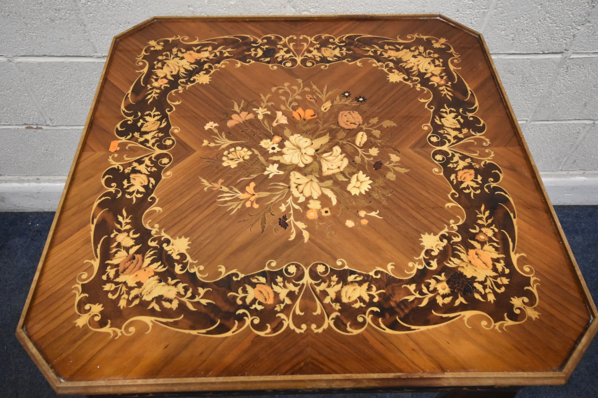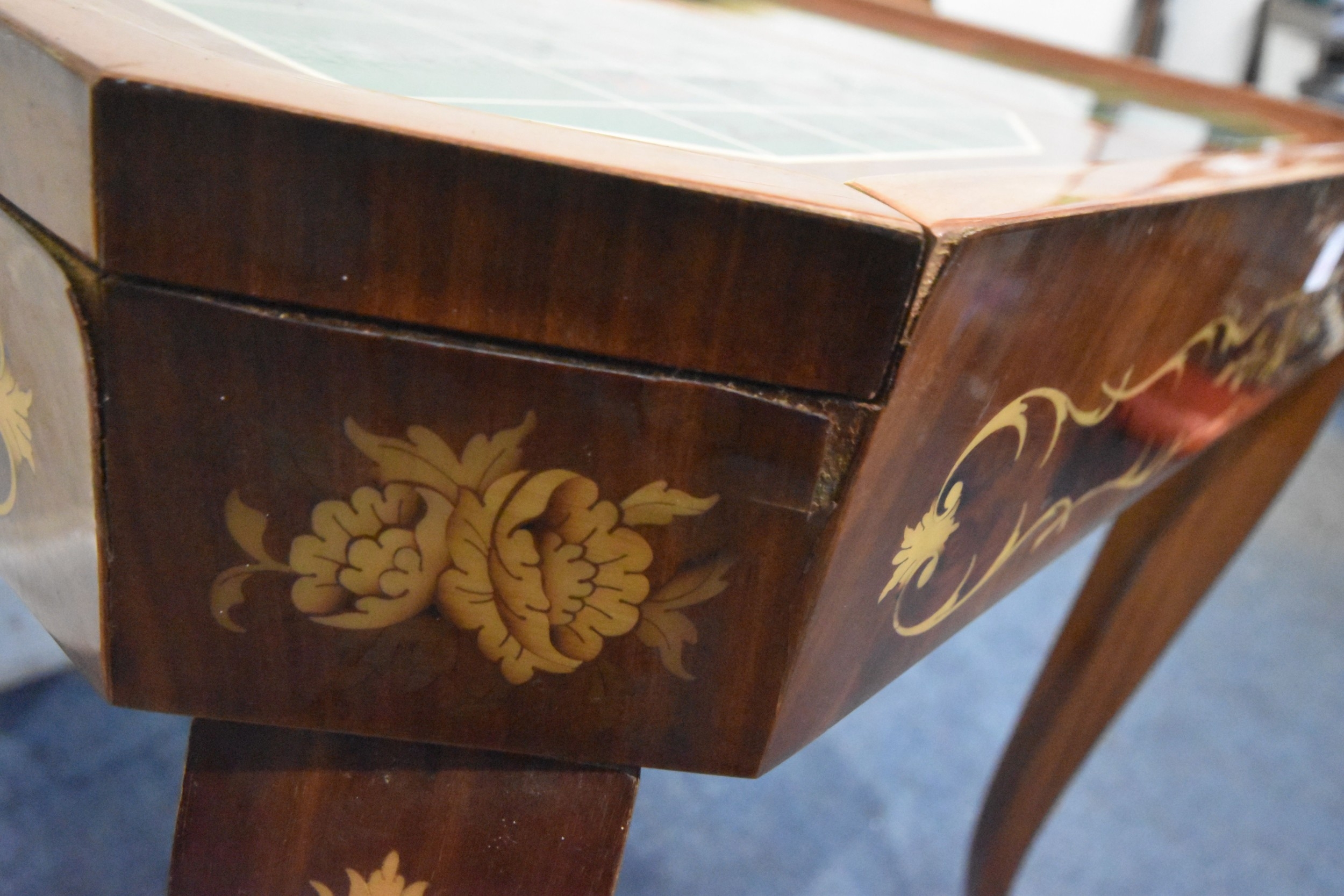 IN THE MANNER OF JANNUZZI OF SORENTO, AN ITALIAN GAMES TABLE, with foliate inlay, enclosing a variety of games and pieces, 78cm squared x height 76cm, condition report: marks, scuffs, veneer loss and lifting in places, other wear and usage