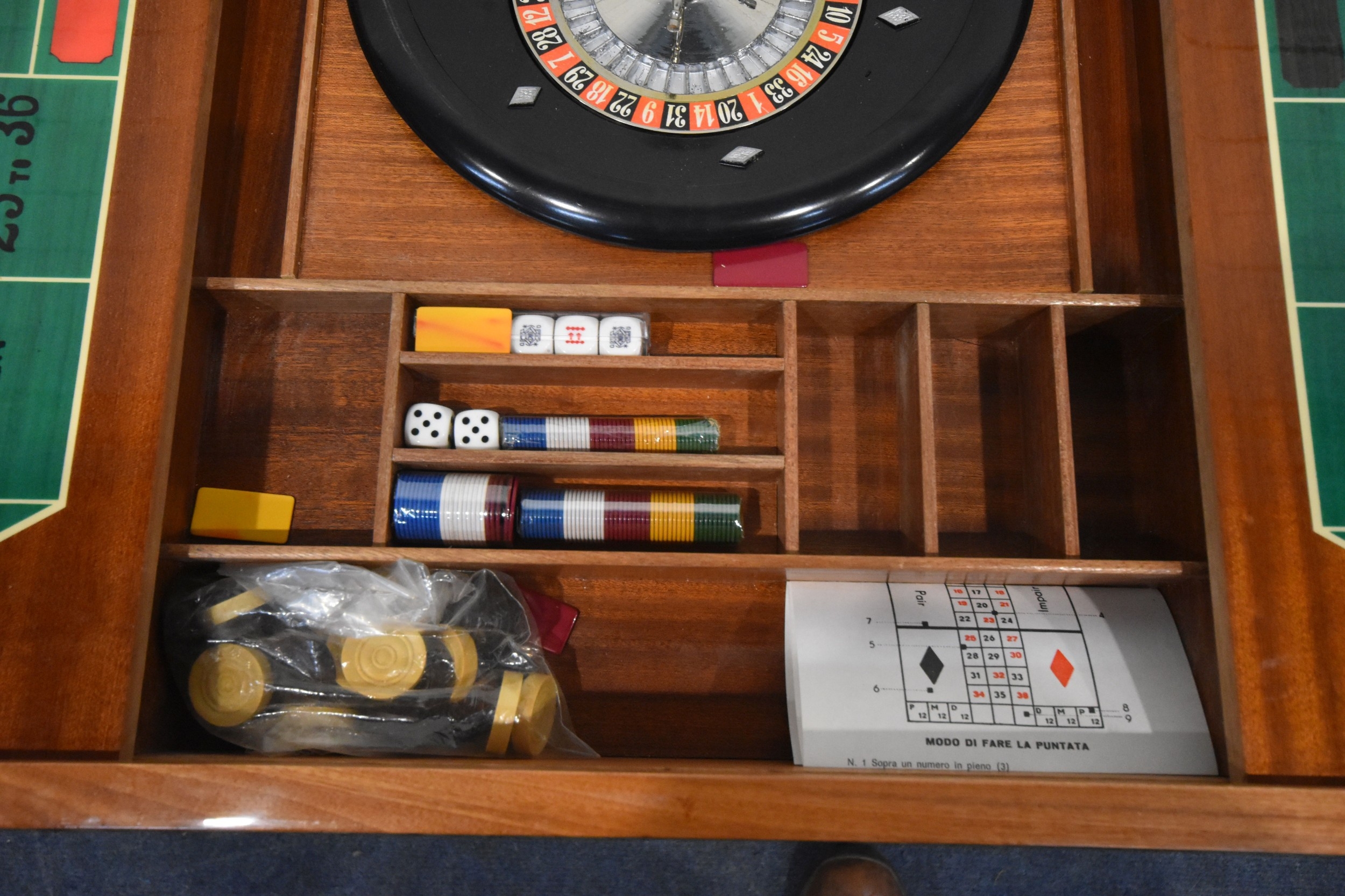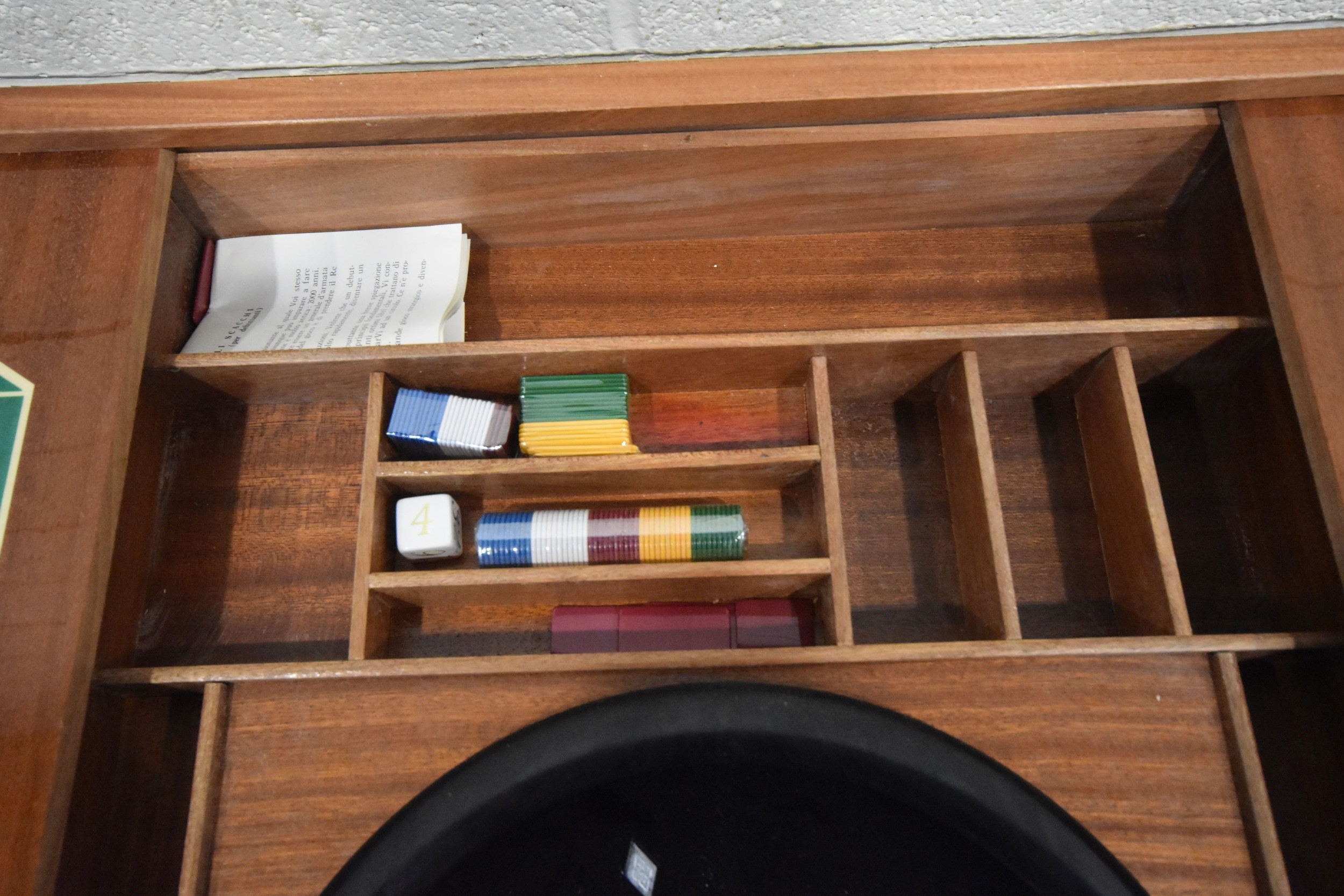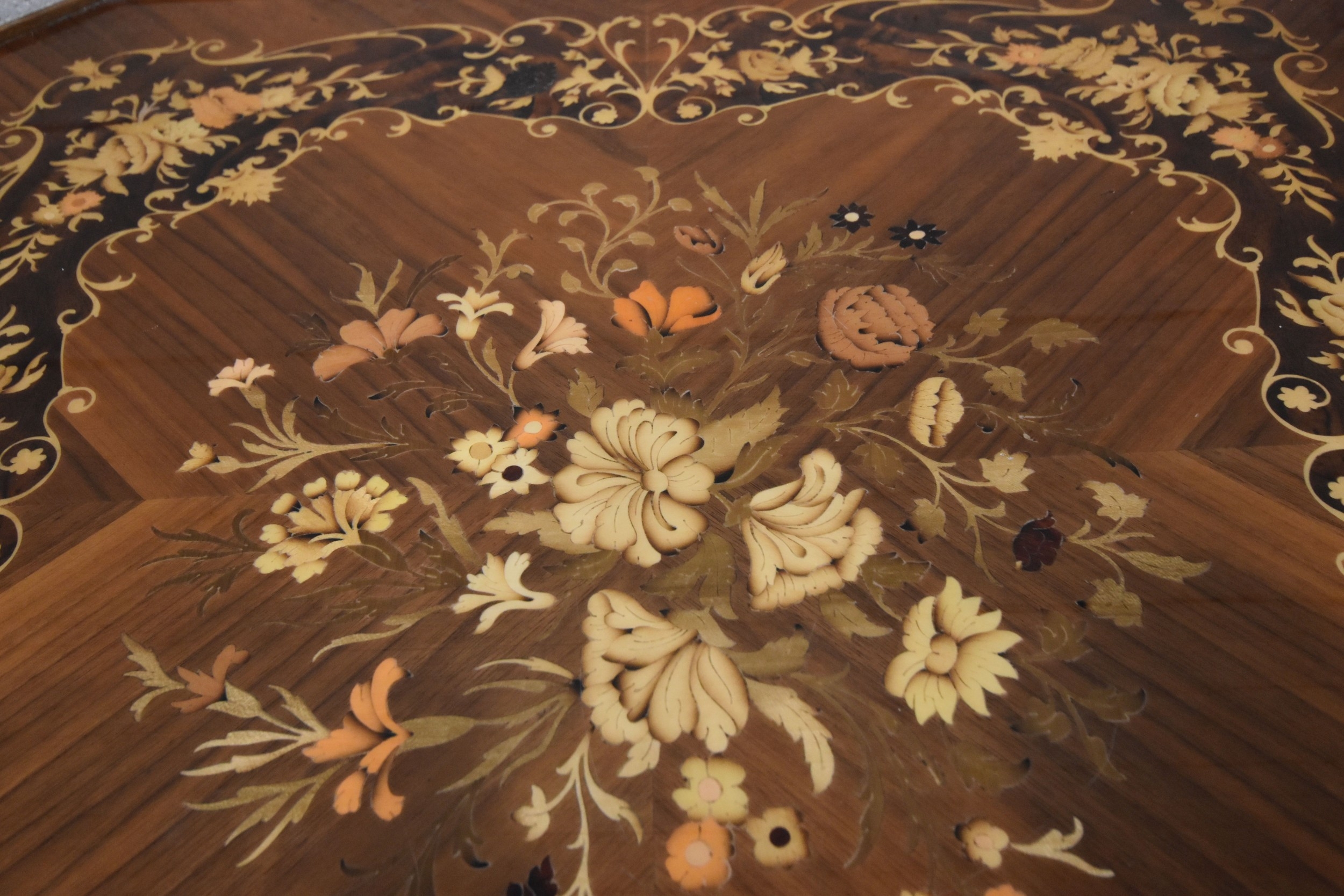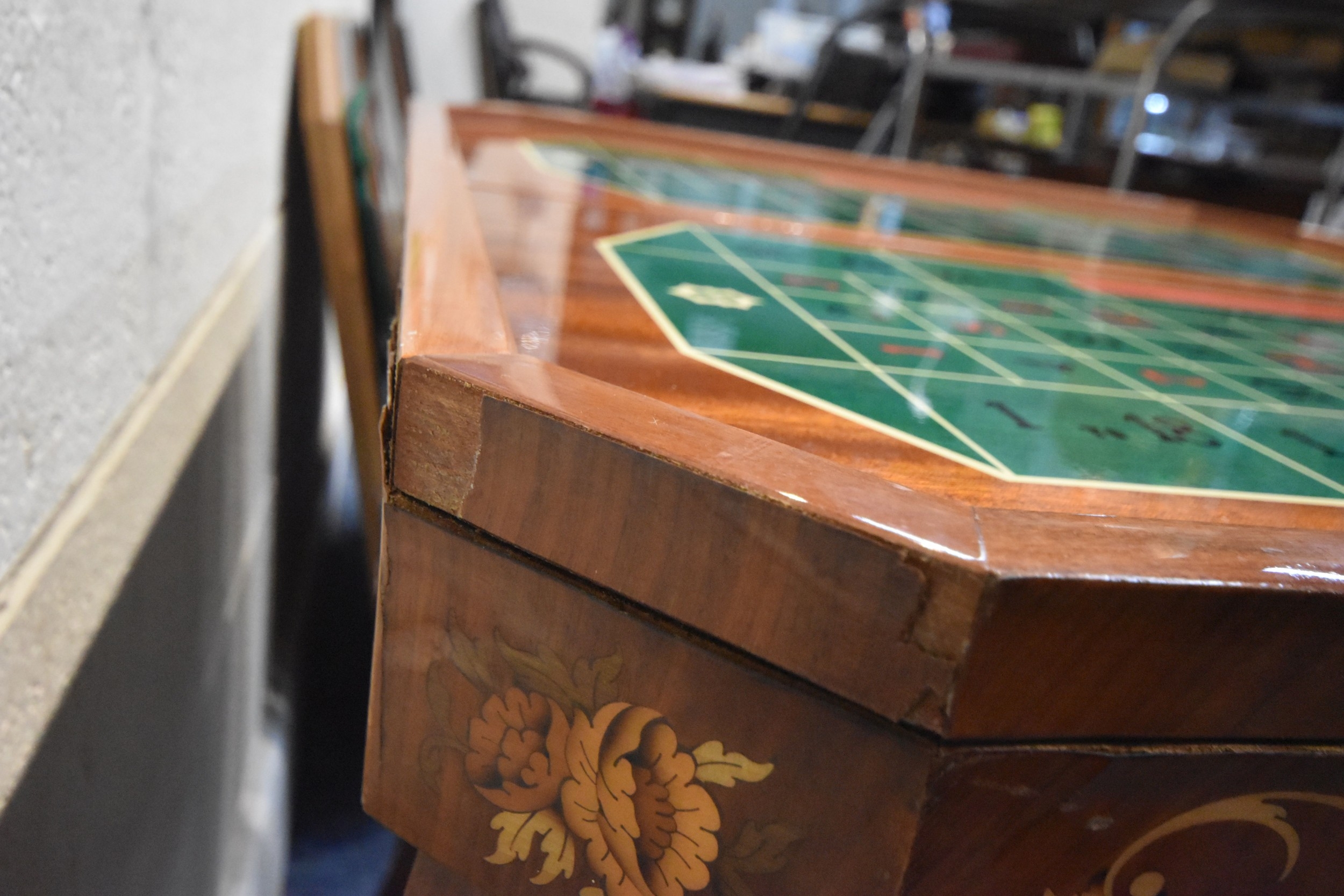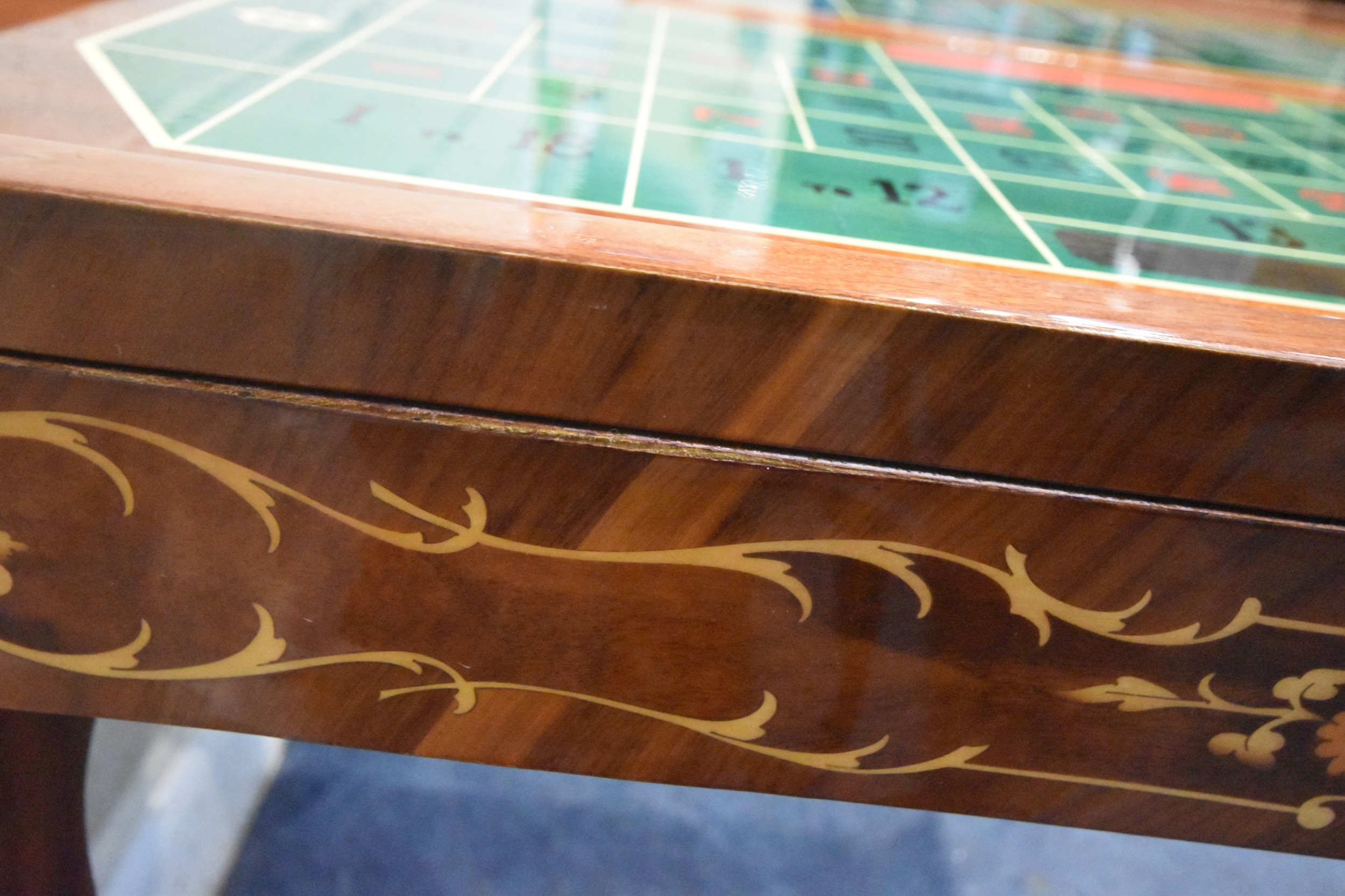 IN THE MANNER OF JANNUZZI OF SORENTO, AN ITALIAN GAMES TABLE, with foliate inlay, enclosing a variety of games and pieces, 78cm squared x height 76cm, condition report: marks, scuffs, veneer loss and lifting in places, other wear and usage