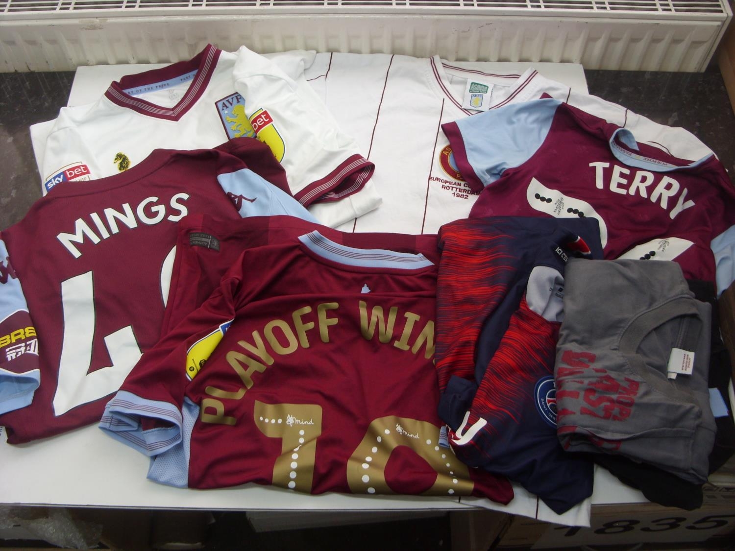 ASTON VILLA, 1982-2019, A collection of Replica Tops & associated Casual Wear, to include 1982 European Cup Final ('Mings & number '40' on reverse), 2018/2019 Home ('Playoff Winners' & number '19' on reverse, with Arm Patches) & Away (with number '7' on reverse, with Arm Patches), plus Home 2019/2020 (with 'Mings' & number '40' to reverse, with Arm Patches) In addition is a Junior 2017/2018 Home shirt (with 'Terry' & number '26' on reverse), two casual t-shirts (medium & XL) and a Paris Saint Germain 2018/2019 Home shirt All Shirts are Small unless noted. Estimate: £25/£30 - Opening Bid: £20