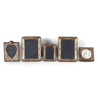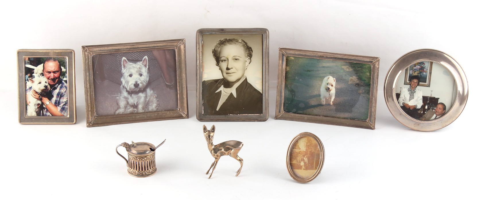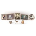 Property of a deceased estate - a Spanish silver model of a deer, approximately 48 grams; together with a silver mustard pot with blue liner & silver mustard spoon, silver approximately 25 grams; three Spanish silver photograph frames; and two other silver photograph frames (a lot).