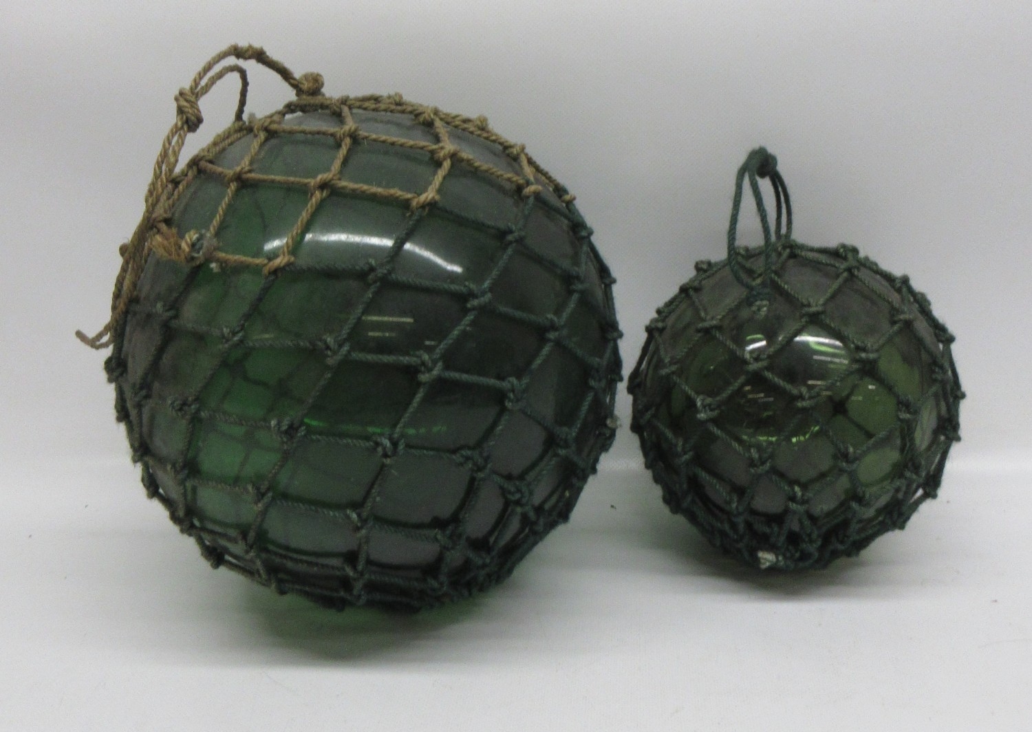 20th Century green glass fishing float encased in rope netting, D18cm and another smaller fishing float D12cm