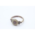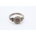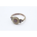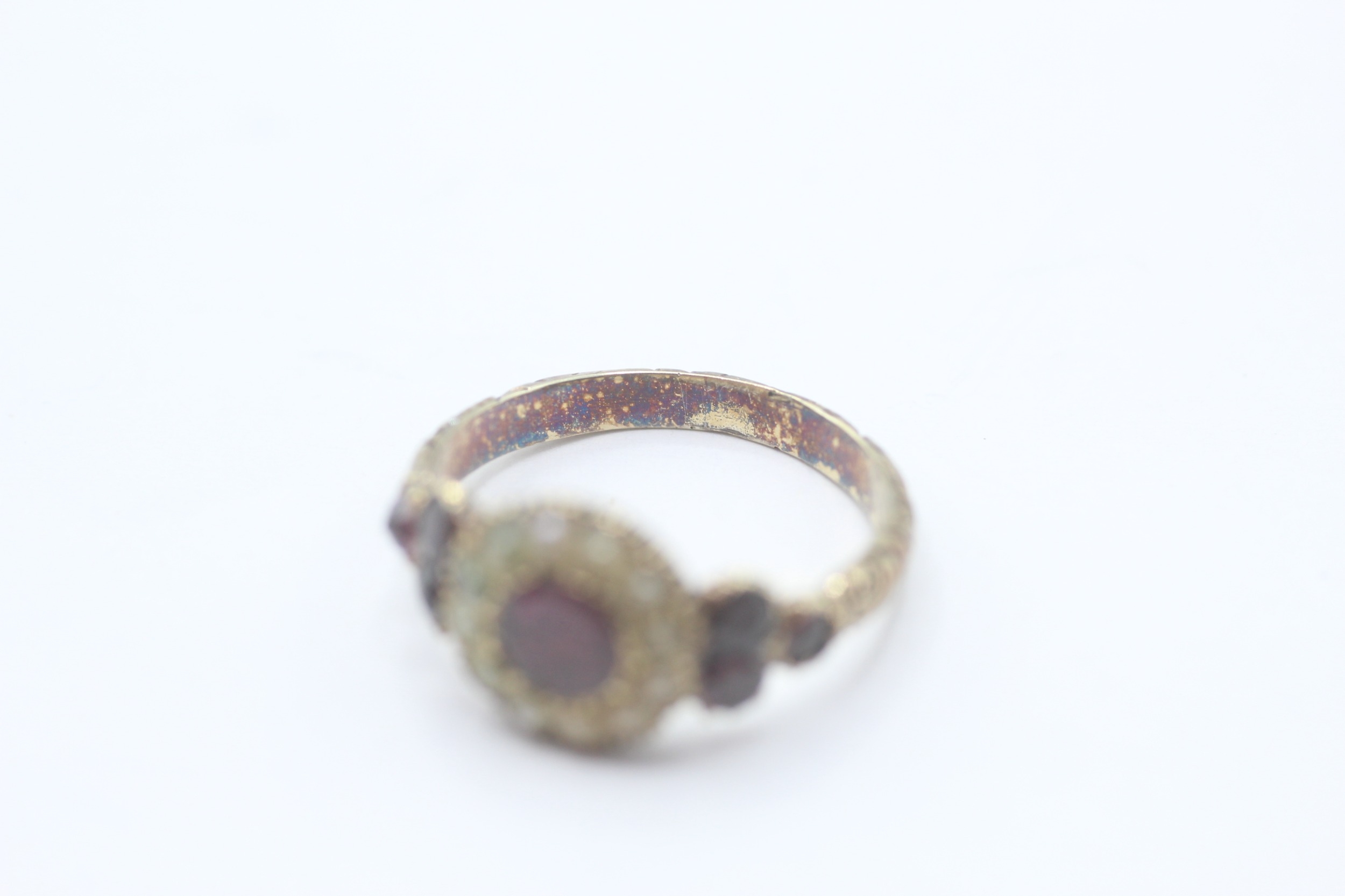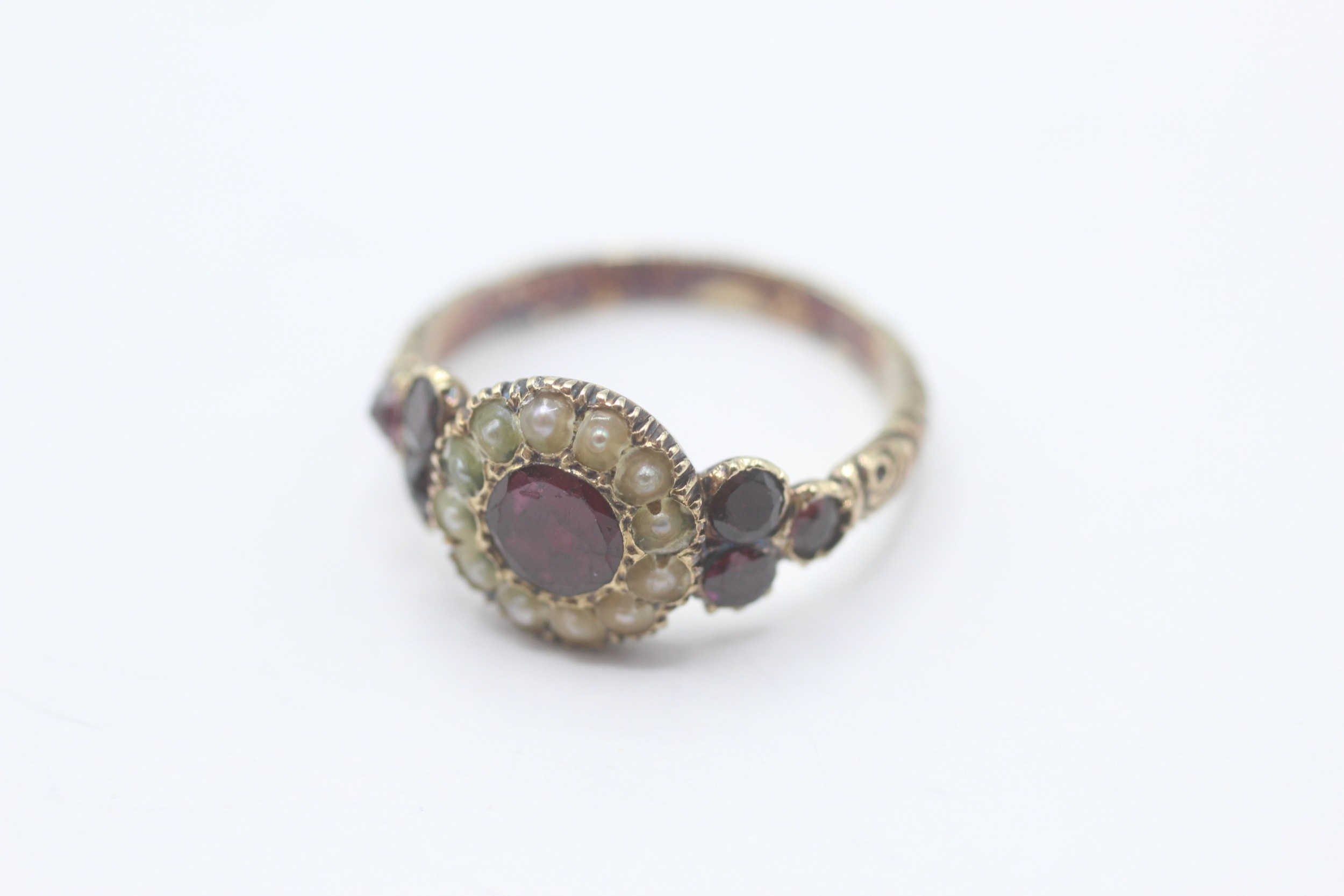 9ct gold Victorian foiled back garnet & seed pearl dress ring with a patterned band (2.8g) Size N
