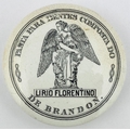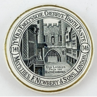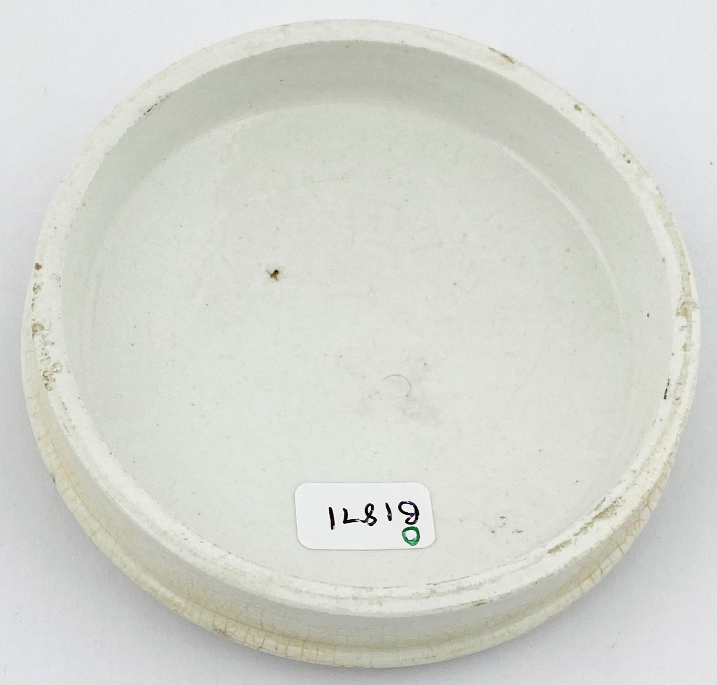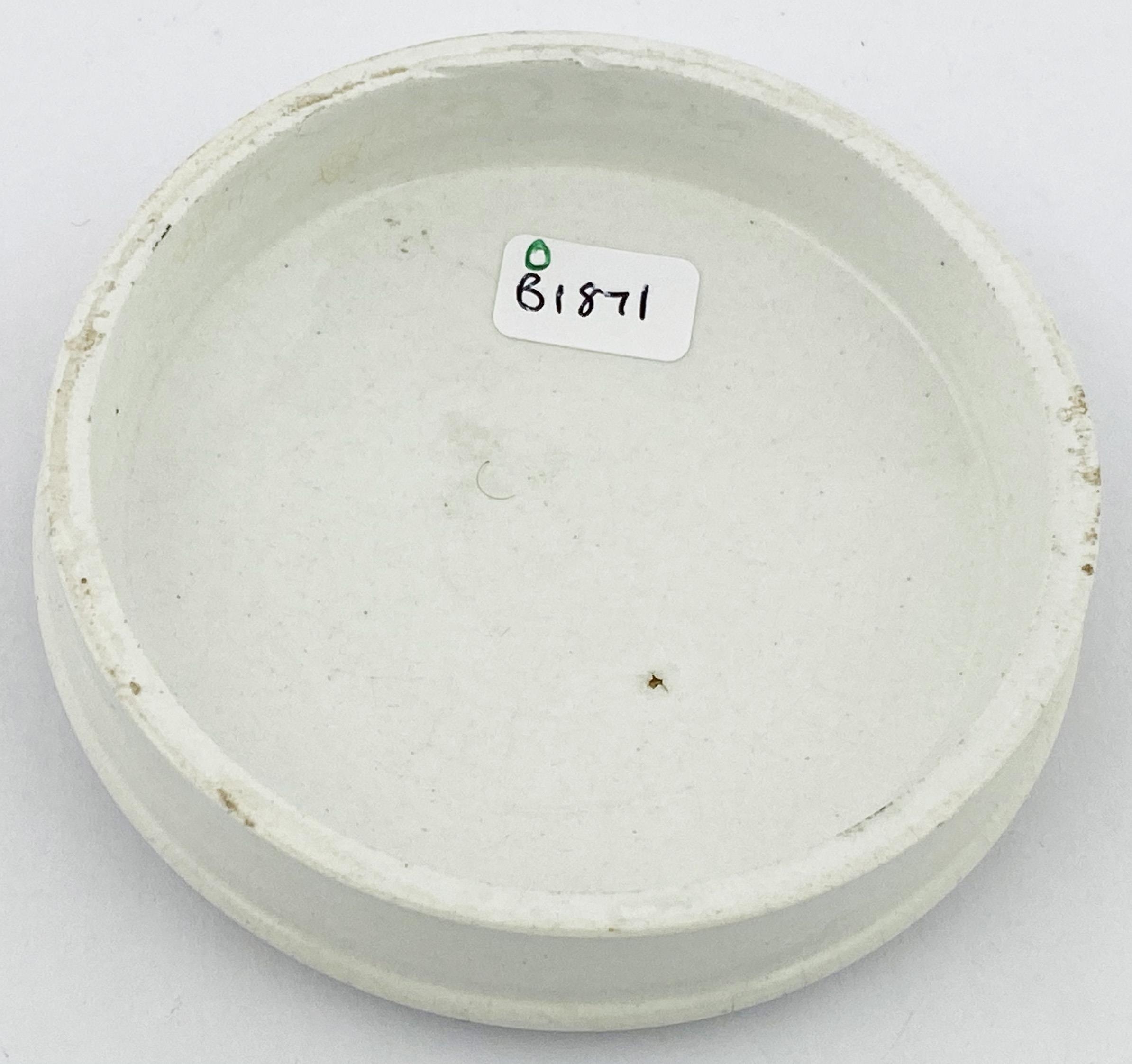 DE BRANDON POT LID. 3.5ins diam. Black transfer. PASTA PARA DENTES COMPOSTA DO. With angel pict to centre. Minute surface wear & slight staining.