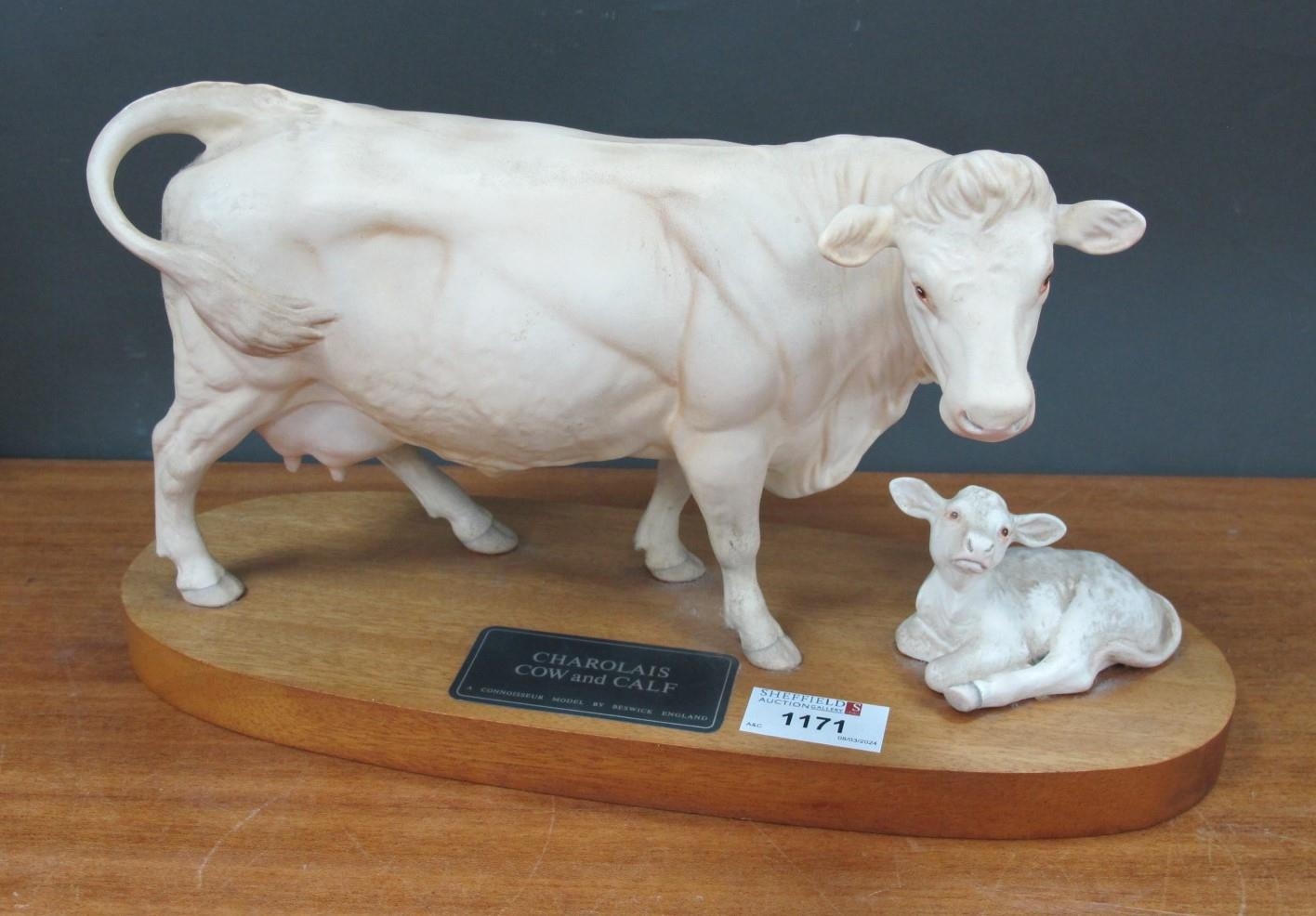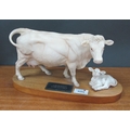 Beswick Charolais Cow and Calf, connoisseur model on an oval wooden base.