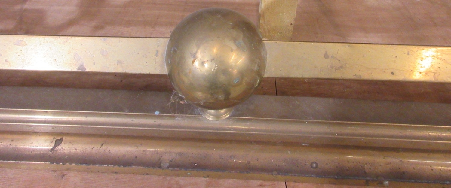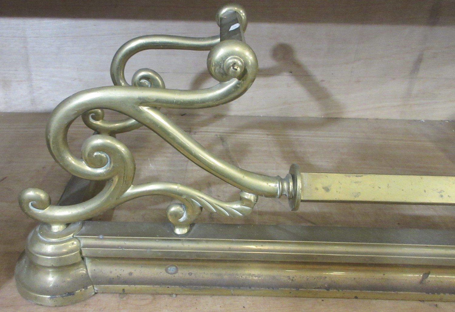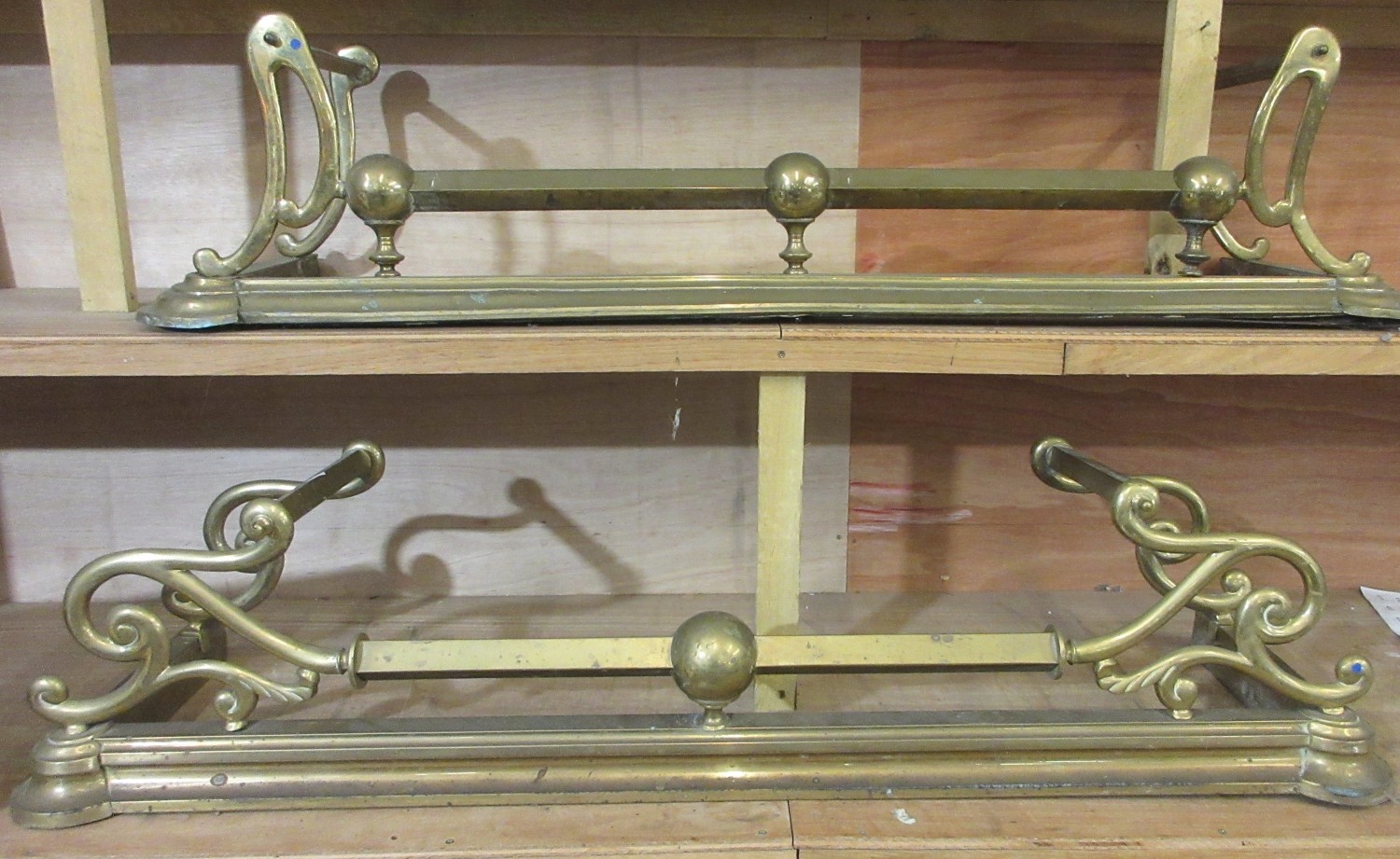 Two late Victorian brass fenders, with scroll and ball decoration, approx W132cmn D36cm H30cm (2)