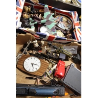 A TRAY OF ASSORTED METALWARE TO INCLUDE SOUVENIR SPOONS, SILVER PLATED WARE ETC.