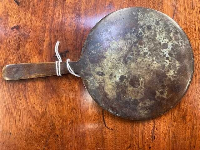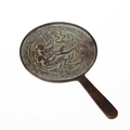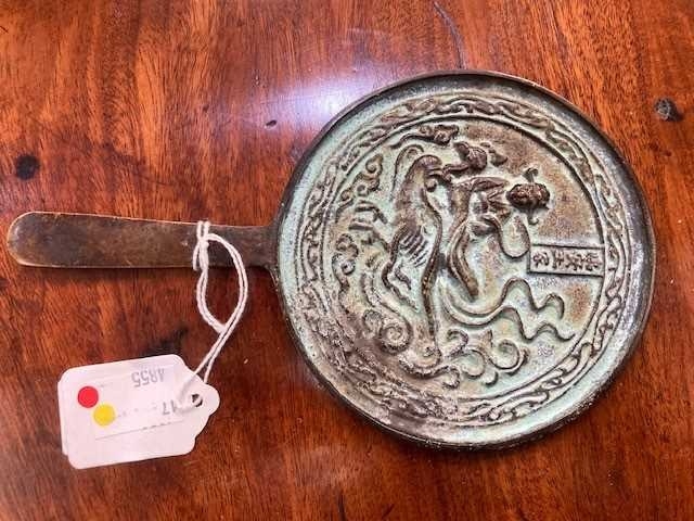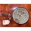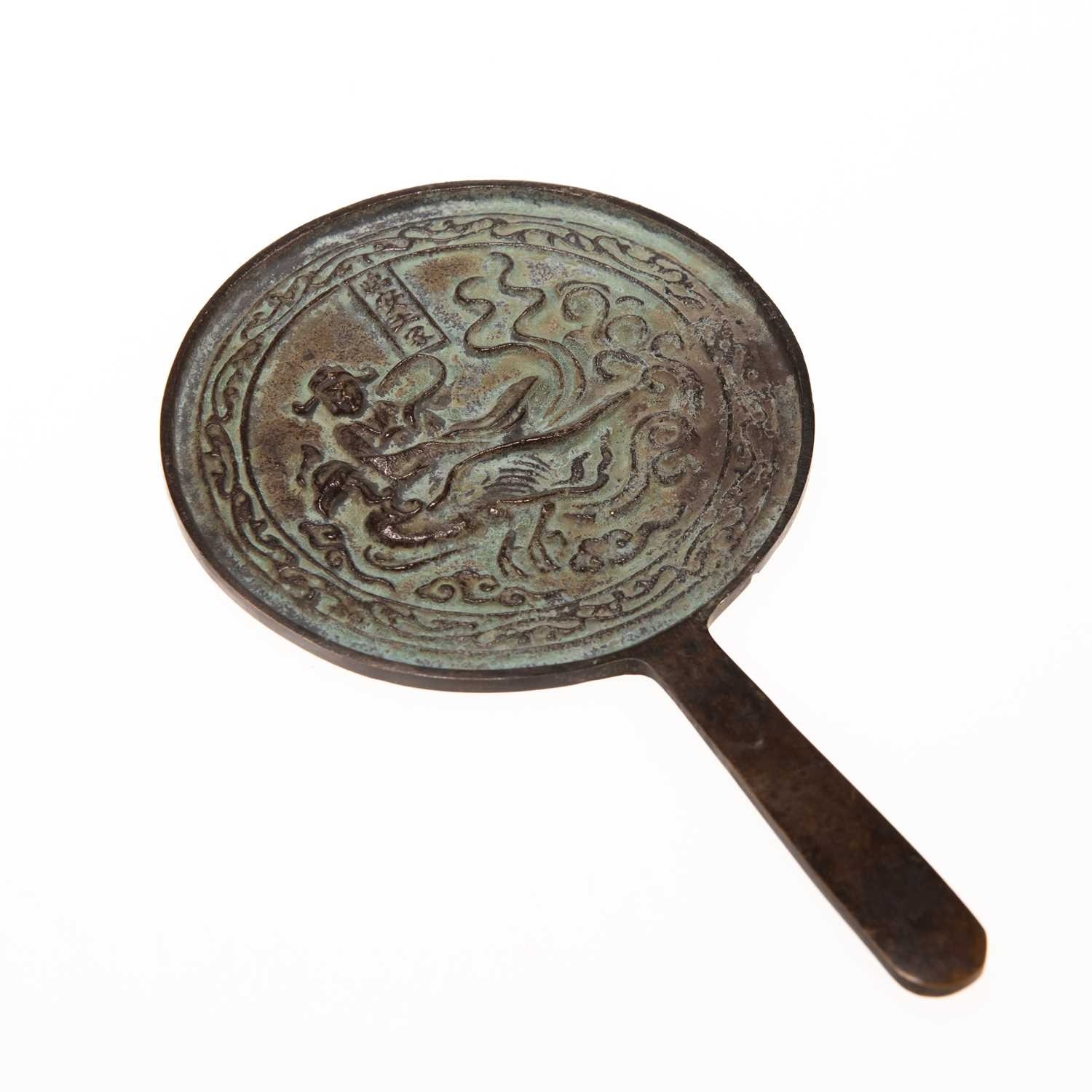 the circular mirror with a tapering handle, decorated with a figure astride a bird. 18cm diameter