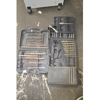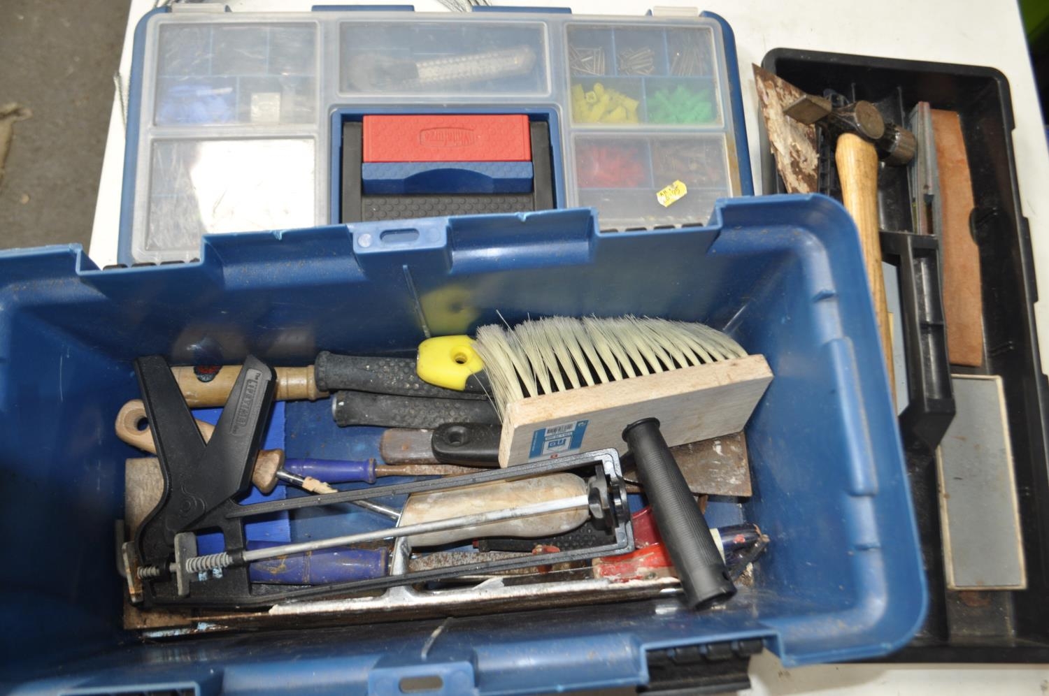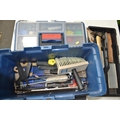 BLUE TOOLBOX WITH TOOLS INC HAMMERS, SCRAPERS ETC