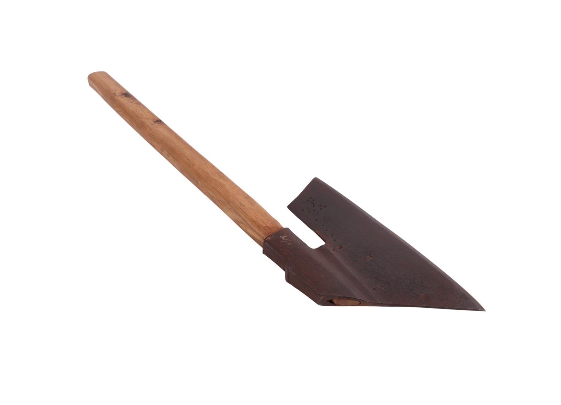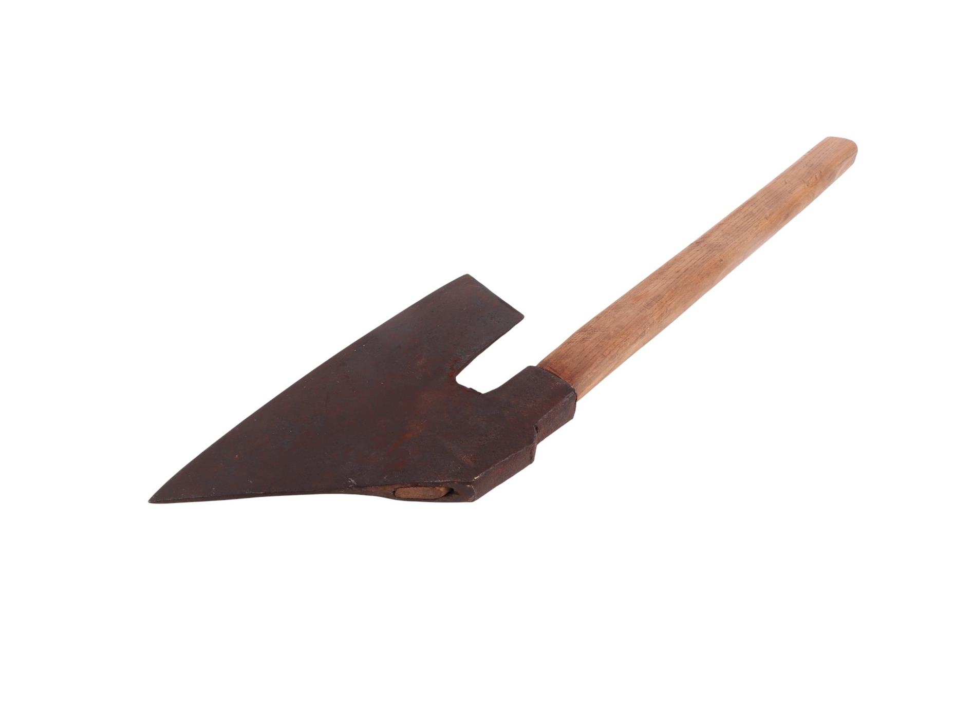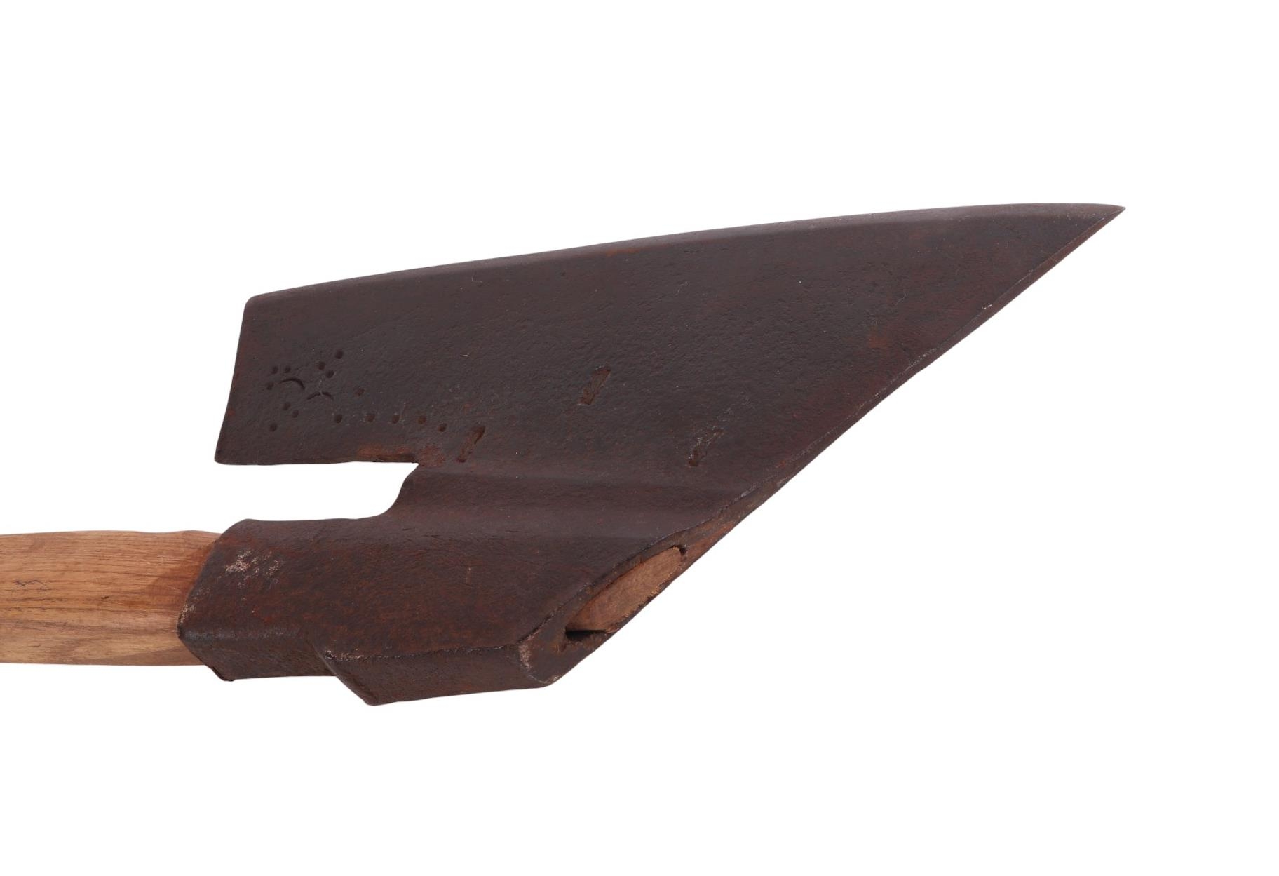 A possibly 18th century large heavy axe head with numerous identification touch marks, 35.5cms long, on a modern oak shaft, approx 85cms long overall.
