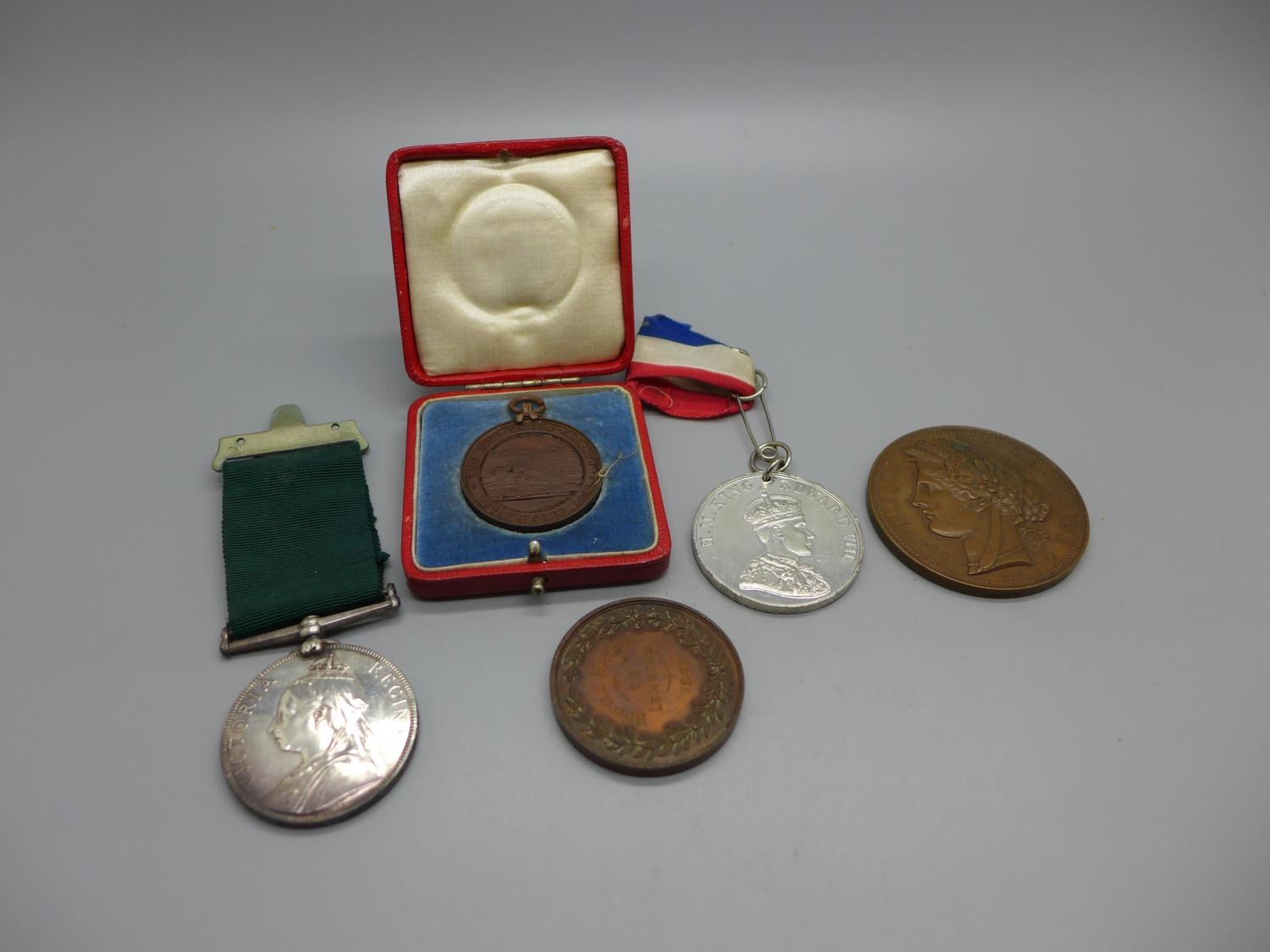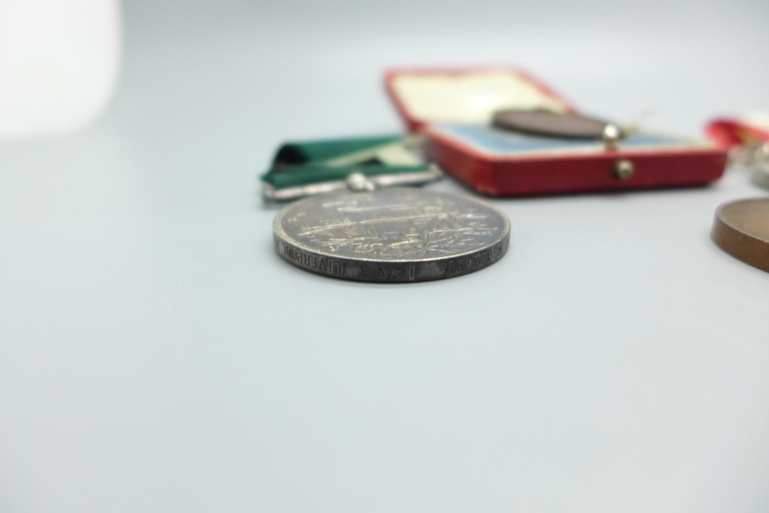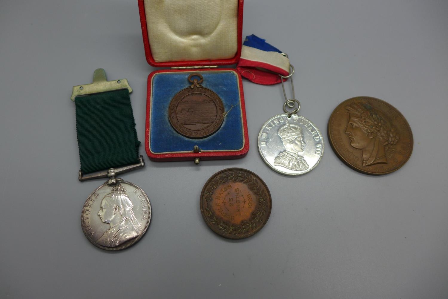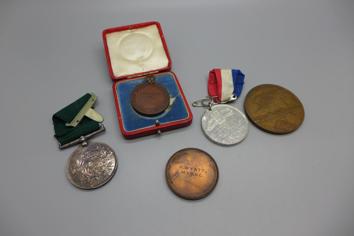 A Queen Victoria For Long Service In The Volunteer Force Medal to 5905 C.Sgt. H. Wyatt 1st V.B. Liverpool Regt., two medallions to H. Wyatt, a French medallion and an Edward VIII medallion