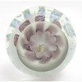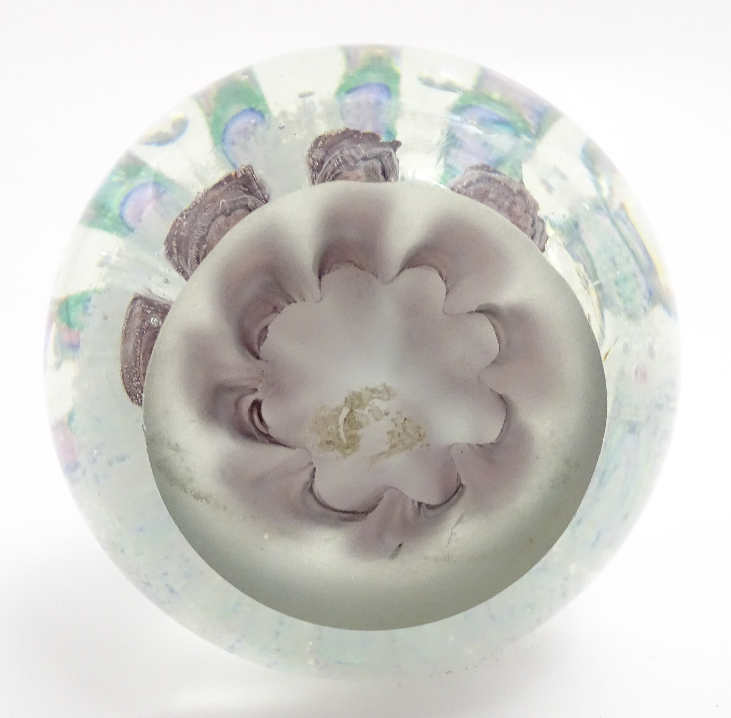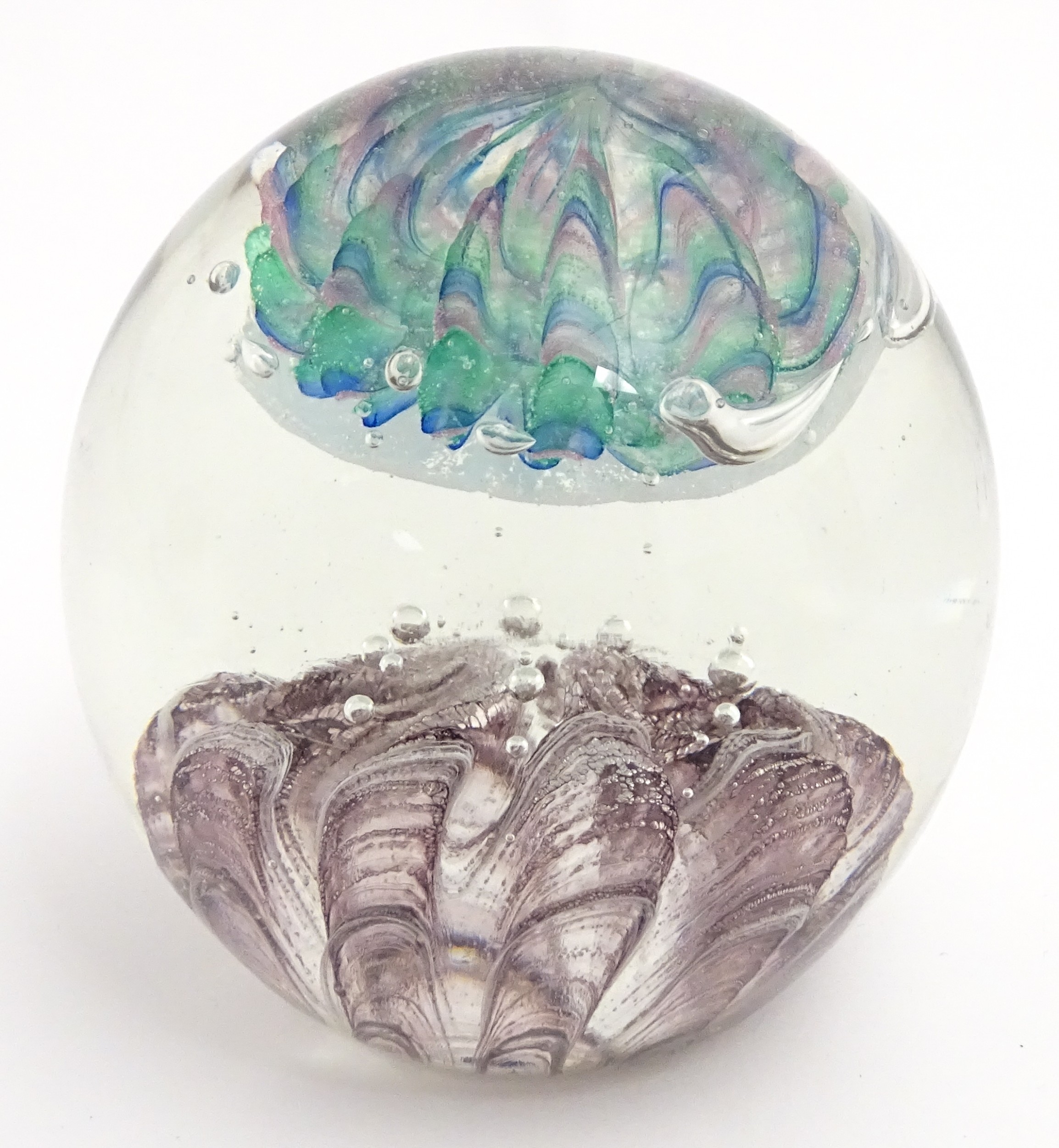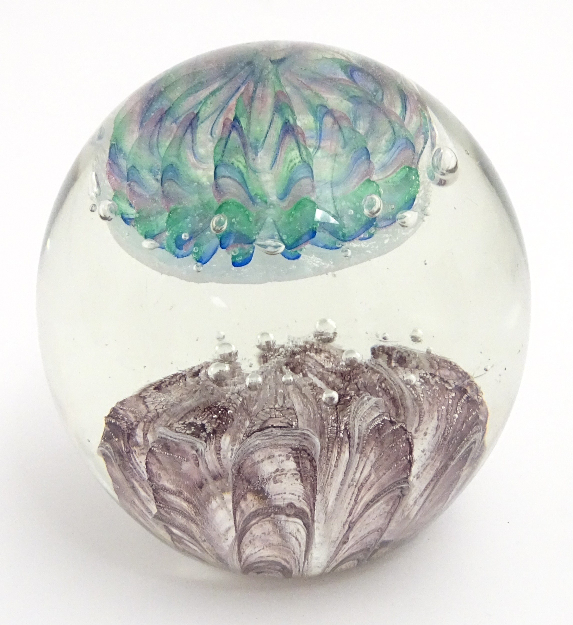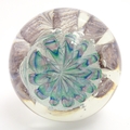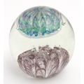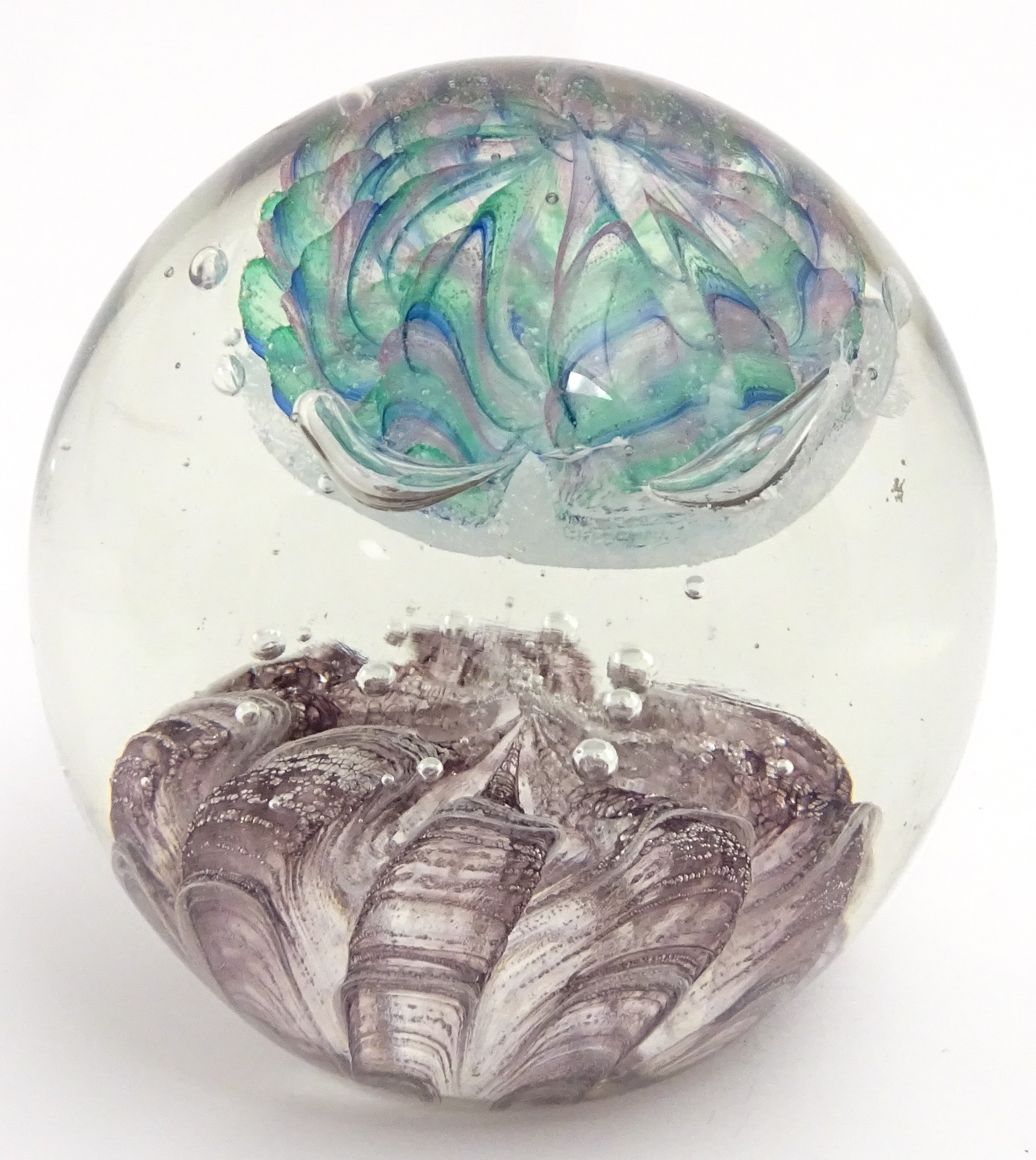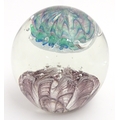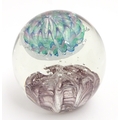 A large art glass paperweight with purple, blue and green detail. Approx. 5" high.