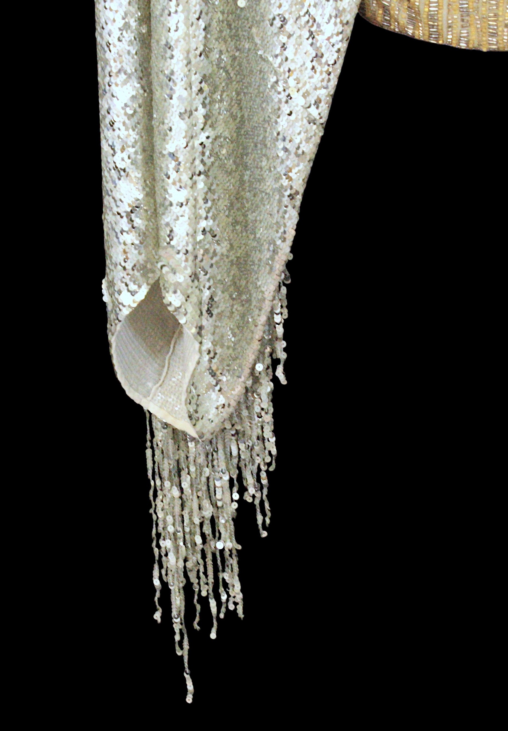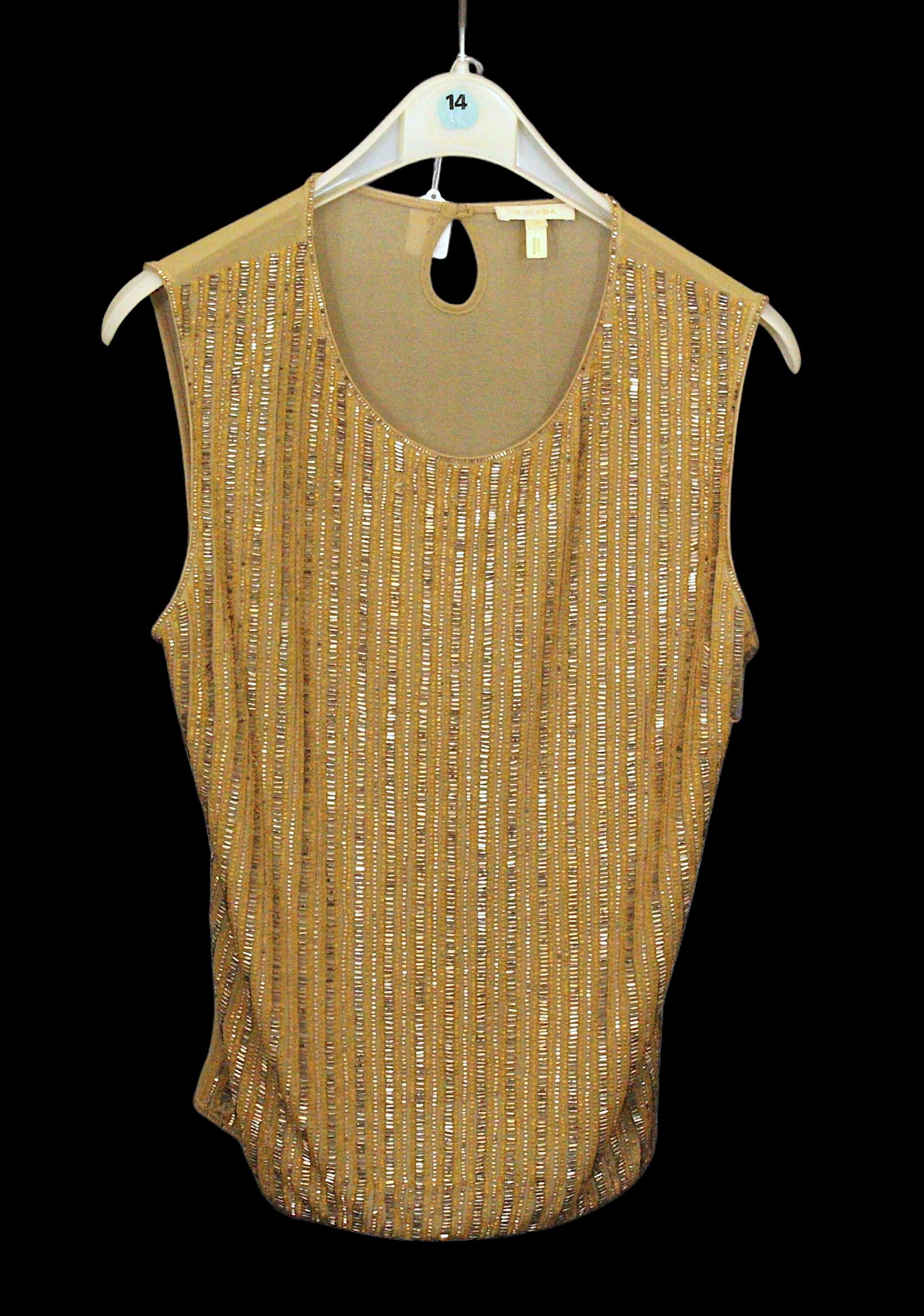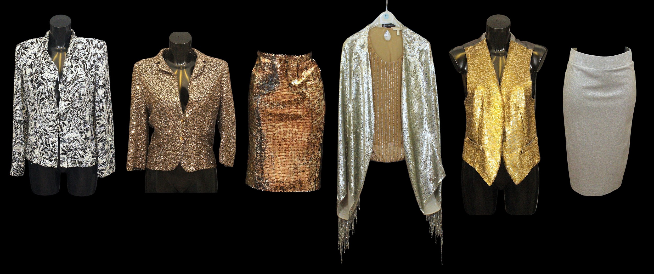 including: a Jenny Packham silver sequin cape / jacket, fringed tassel hem, size UK 10; an Escada gold and silver beaded sleeveless top, with sheer back, size S; a Max Mara gold and silver sequin waistcoat, wool mix outer; a Medici jacket, in patterned black and silver beads and sequins, silk outer, size 12; an IISLI New York knitted jacket, in embellished with bronze coloured sequins, size 8; a Jackie Palmer bronze and silver sequin pencil skirt, waist flat 40cm; together with a Label Lab silver pencil skirt, size 12 with retailers label (7)