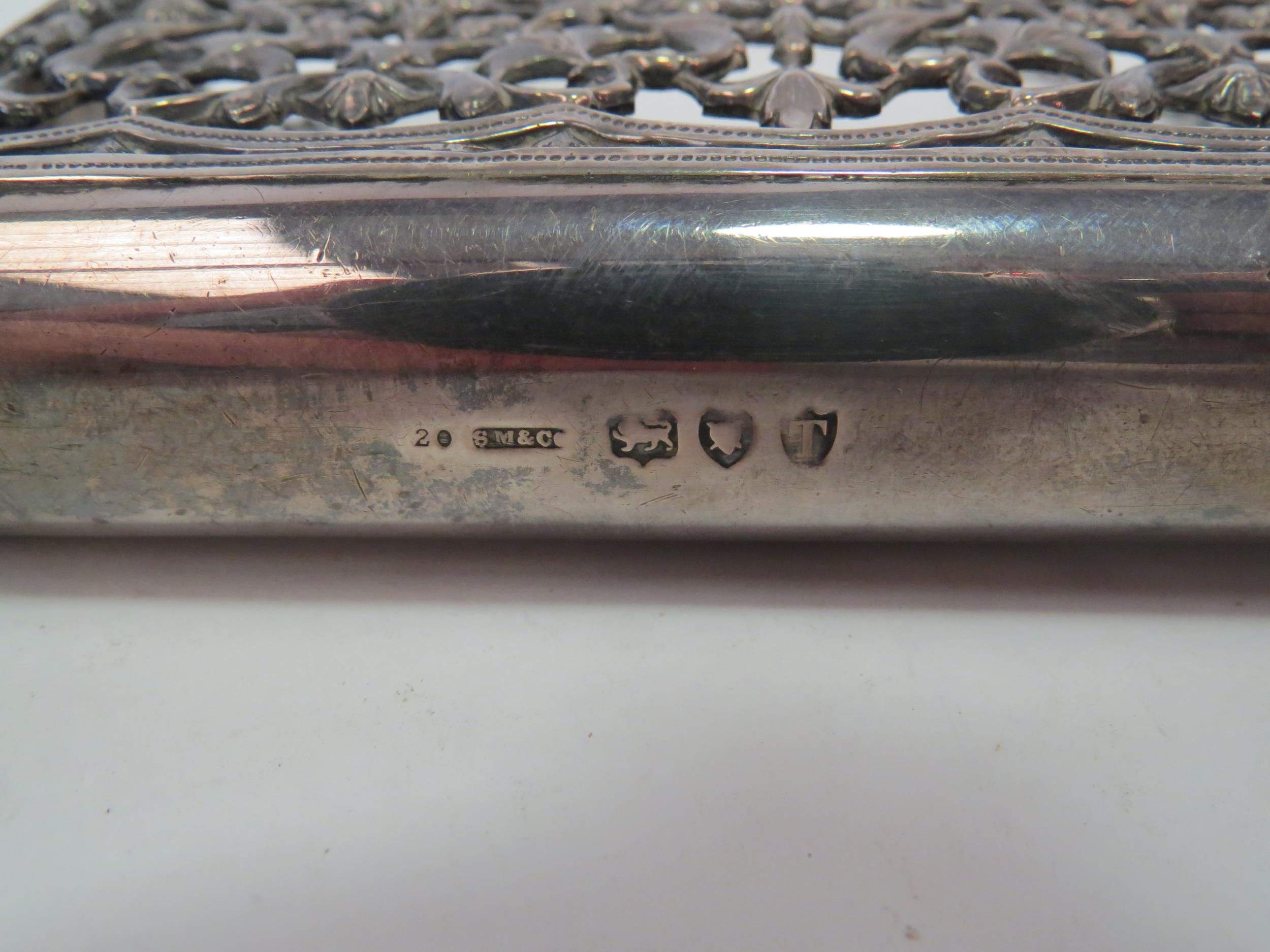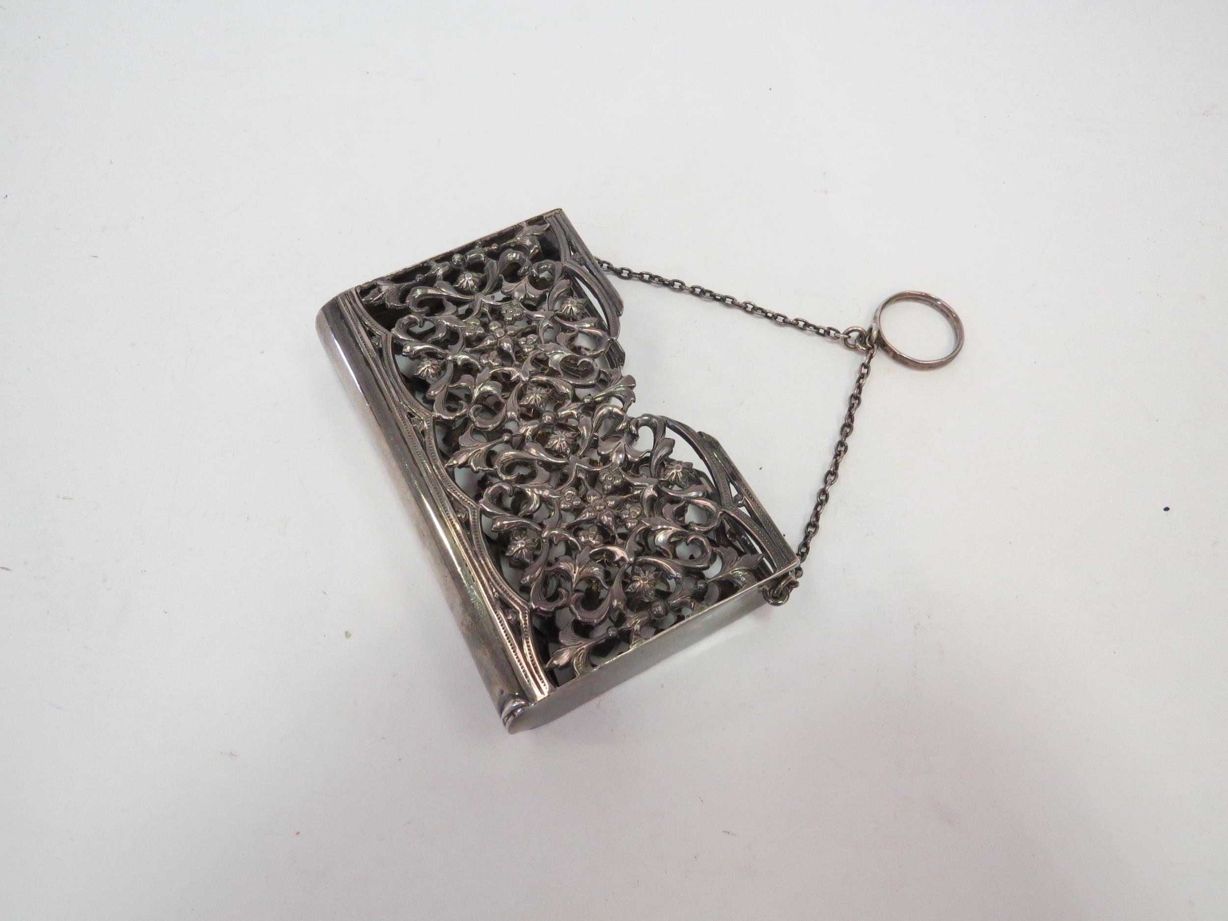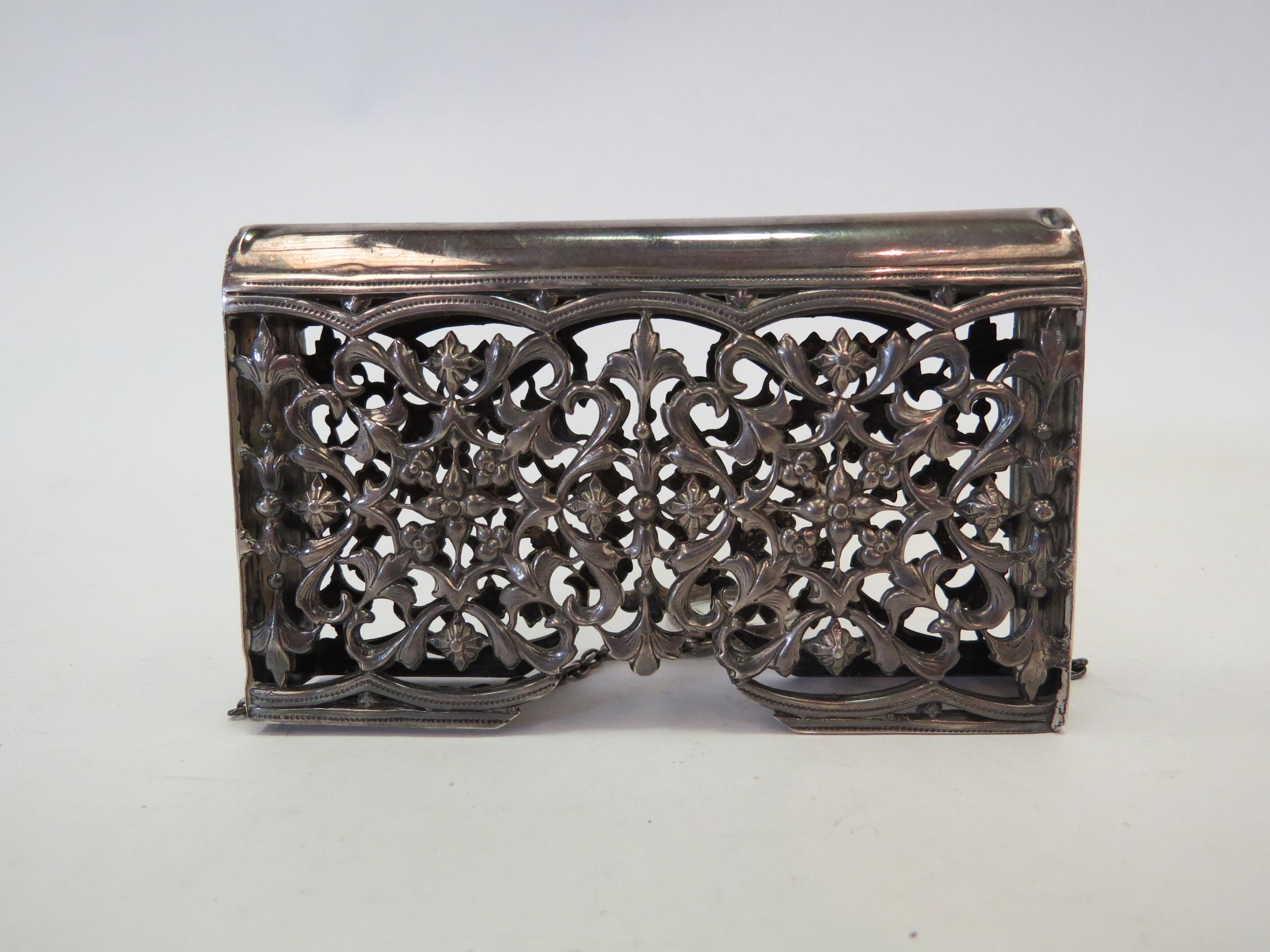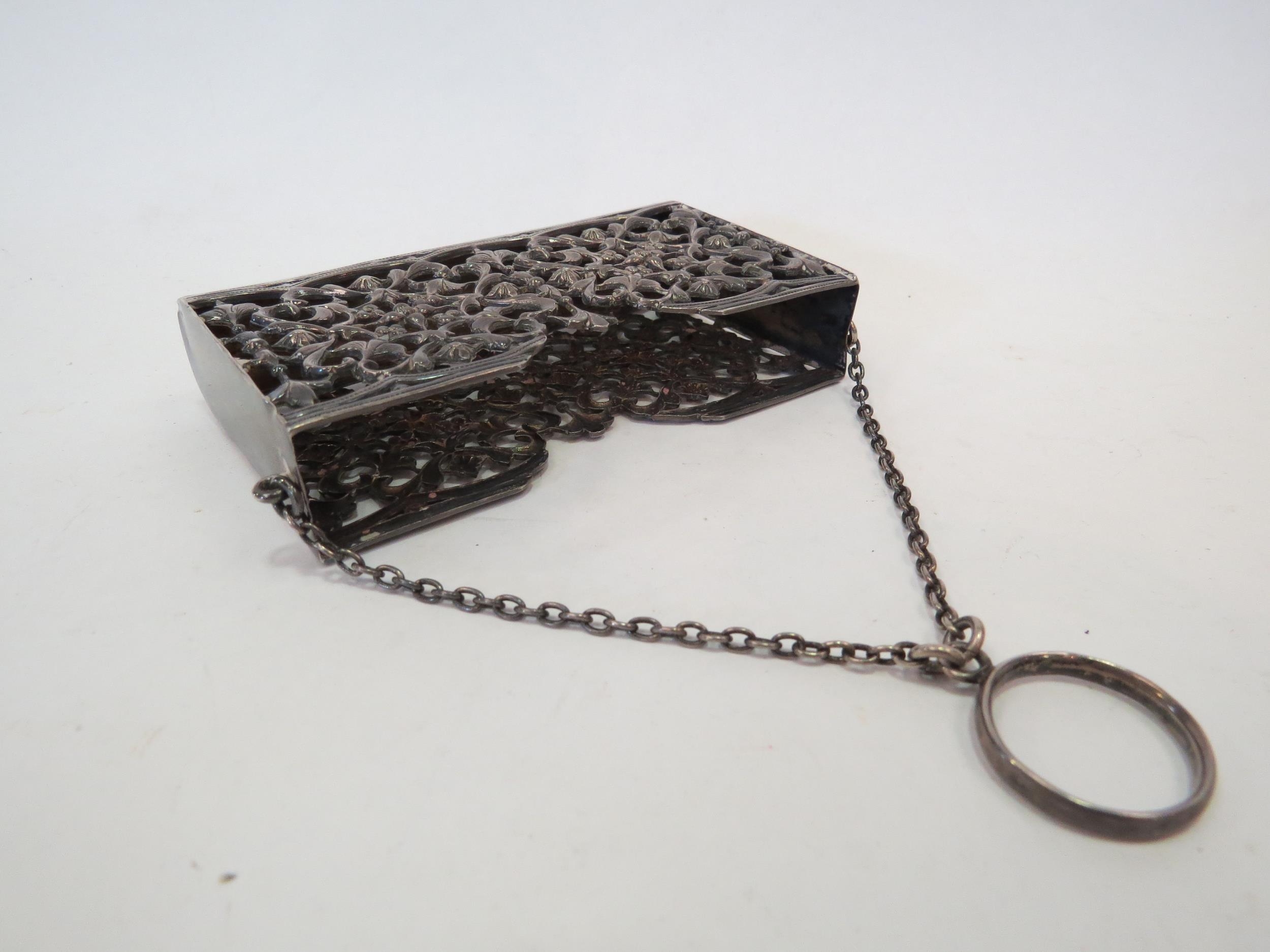 A Sampson Mordan & Co. silver bible holder, pierced scrolled foliate sides with chain, London 1894