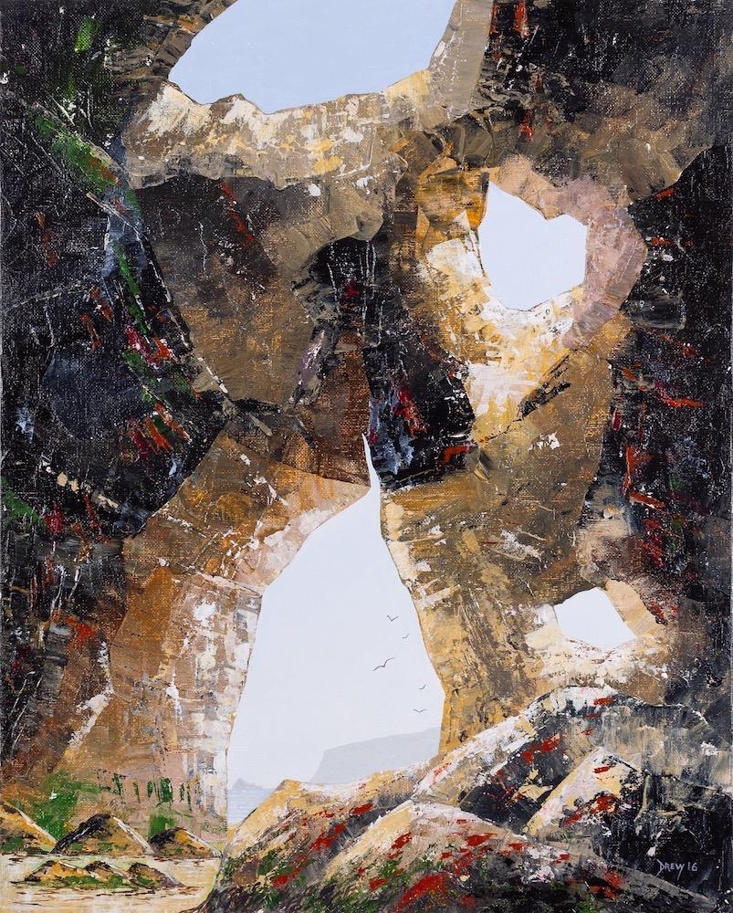 Colin Drew (British, 20th Century) Sea Caves, St Agnes, Cornwall Acrylic on Canvas 40 x 51 cm Signed and dated '16 lower right