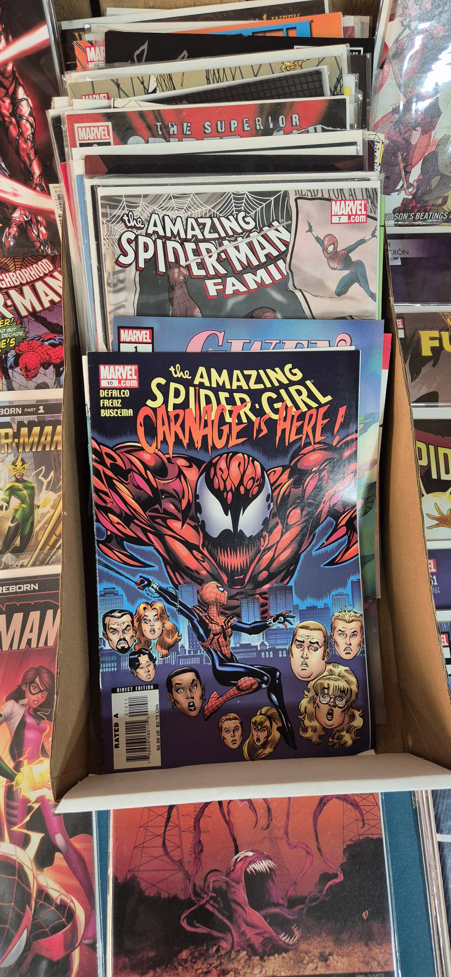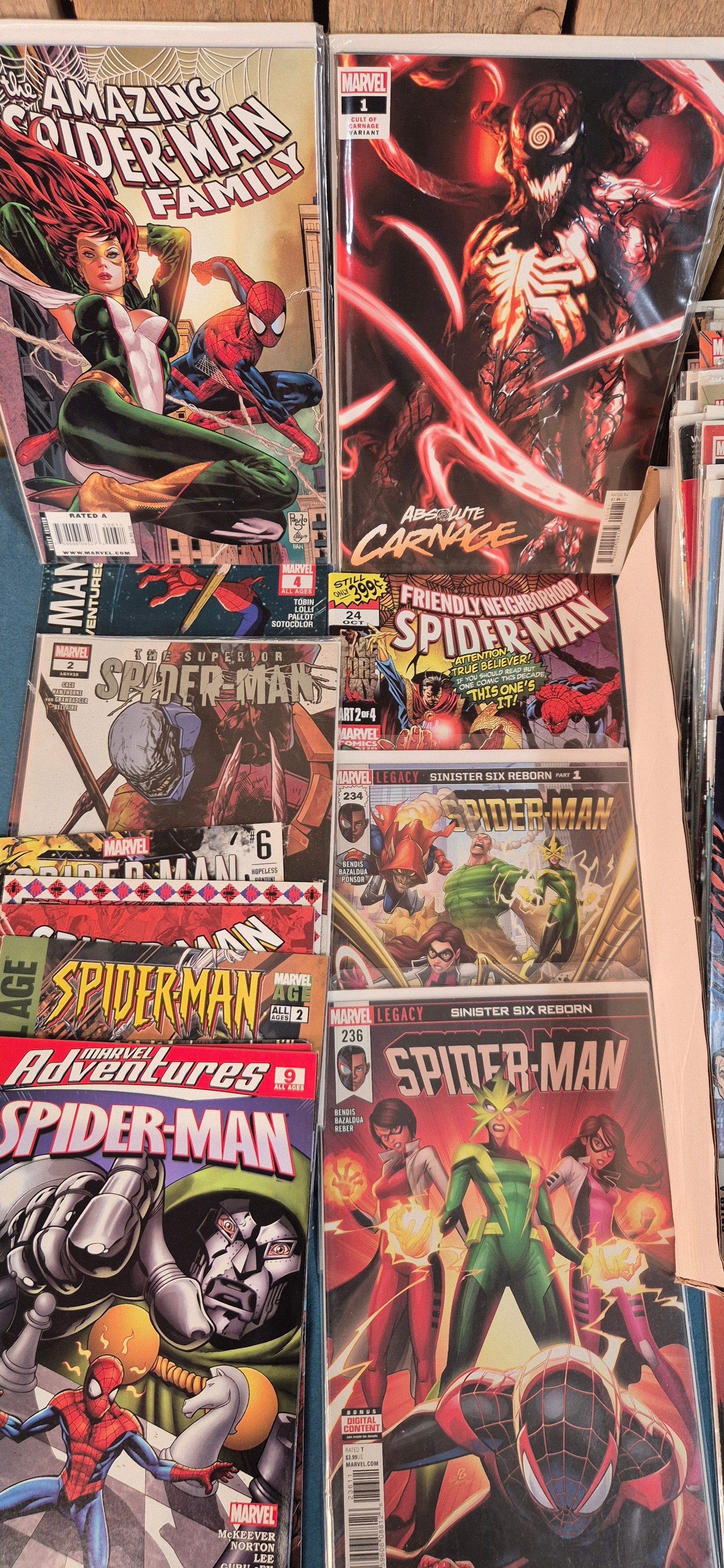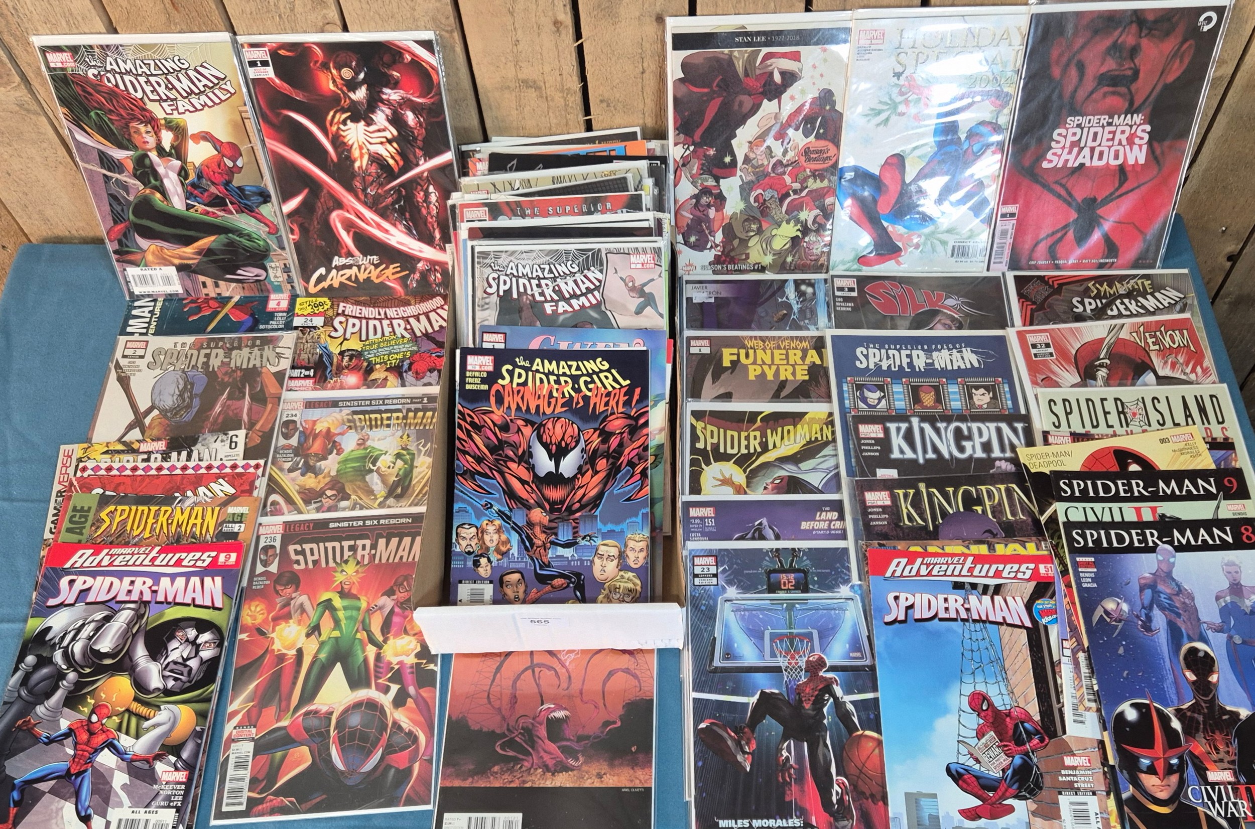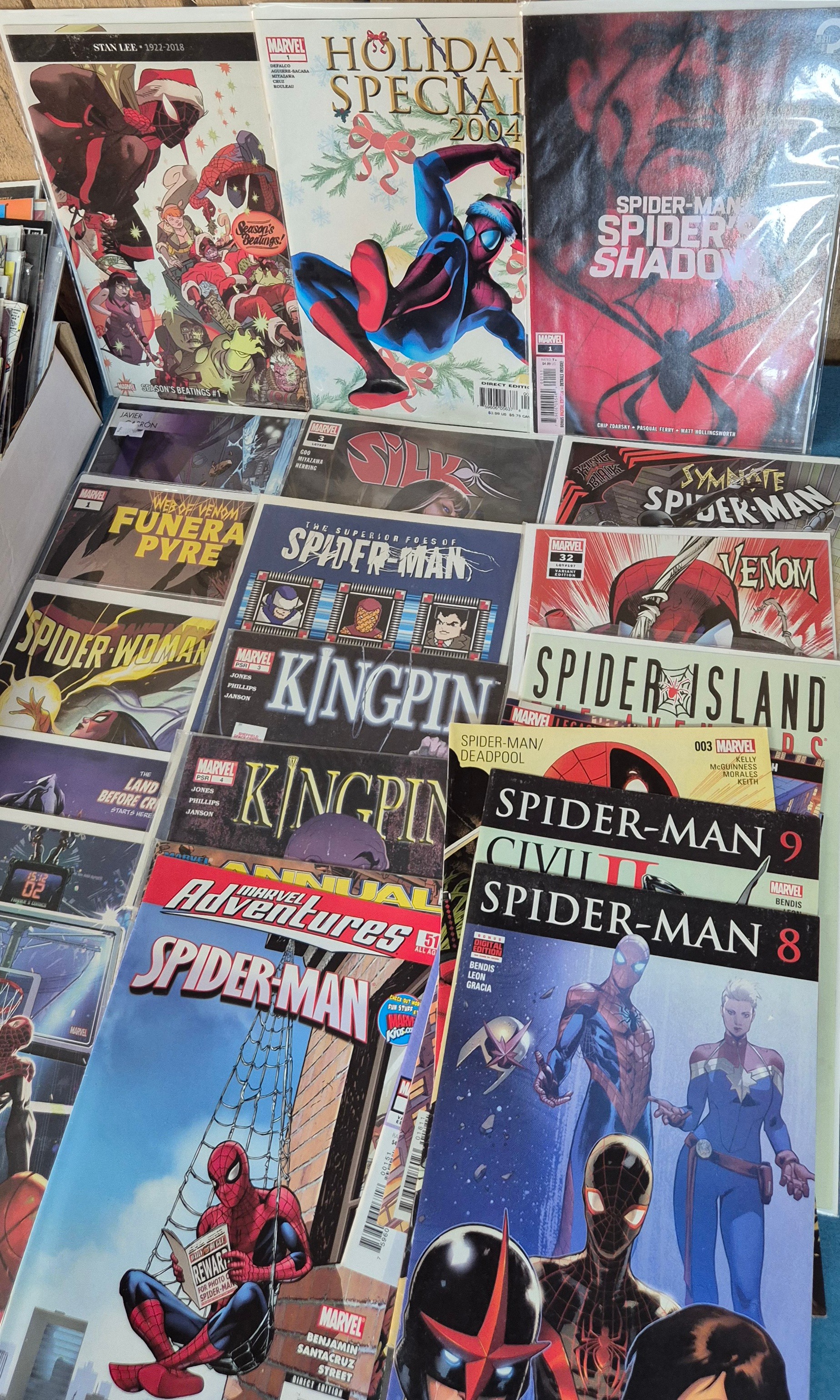 Collection of Marvel Comics; Holiday Special Spider Man, Stan Lee Seasons Beatings, Carnage, Miles Morales, Silk, Gwen Stacy, variant editions and #1 comics along with others.