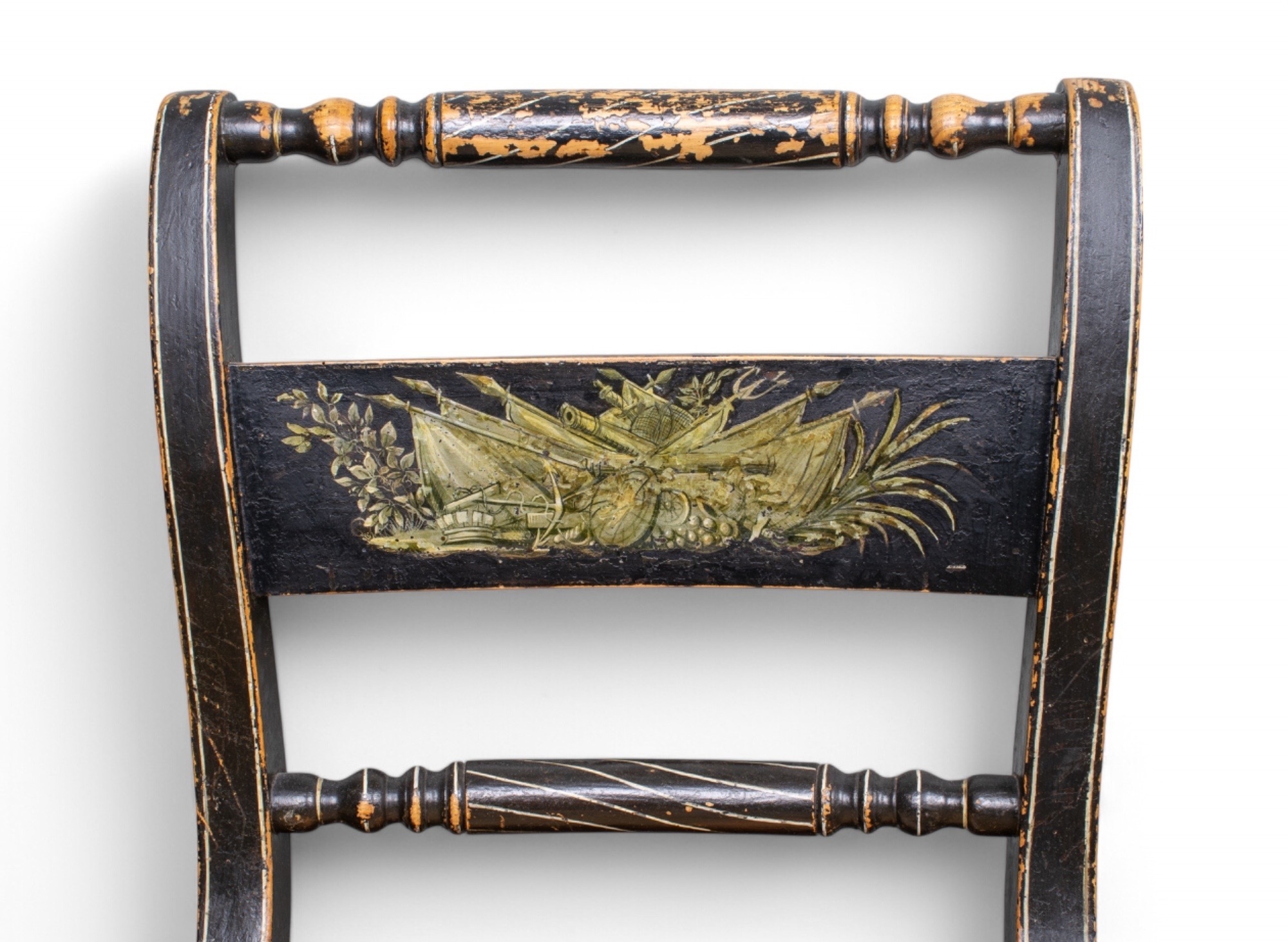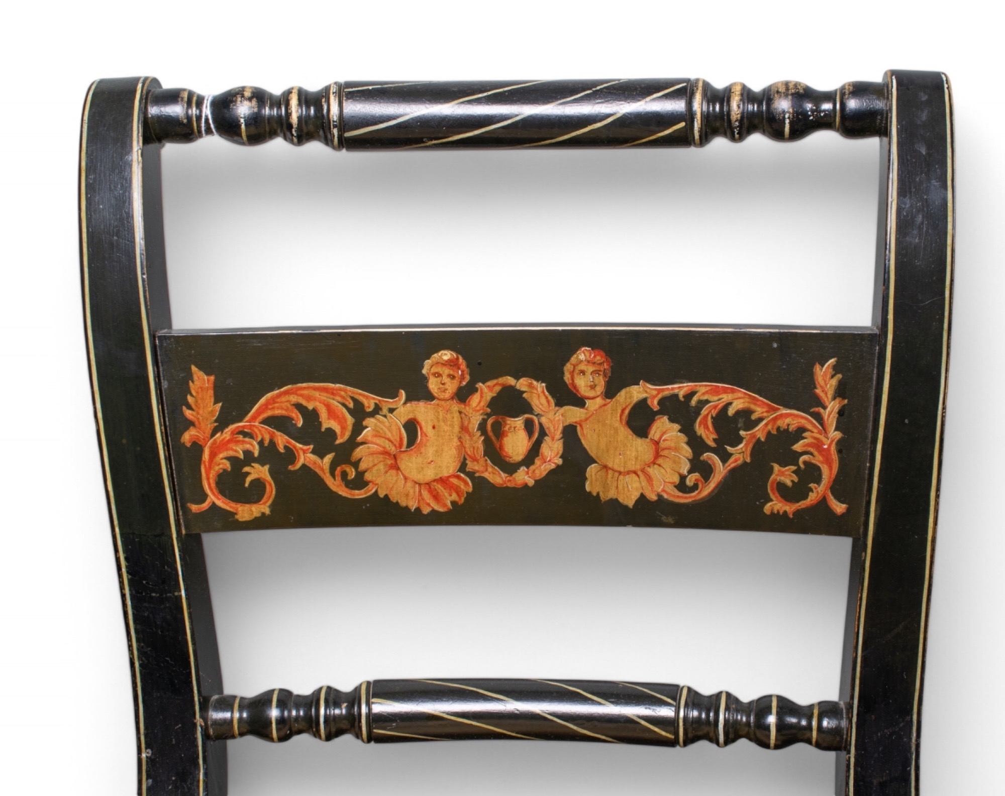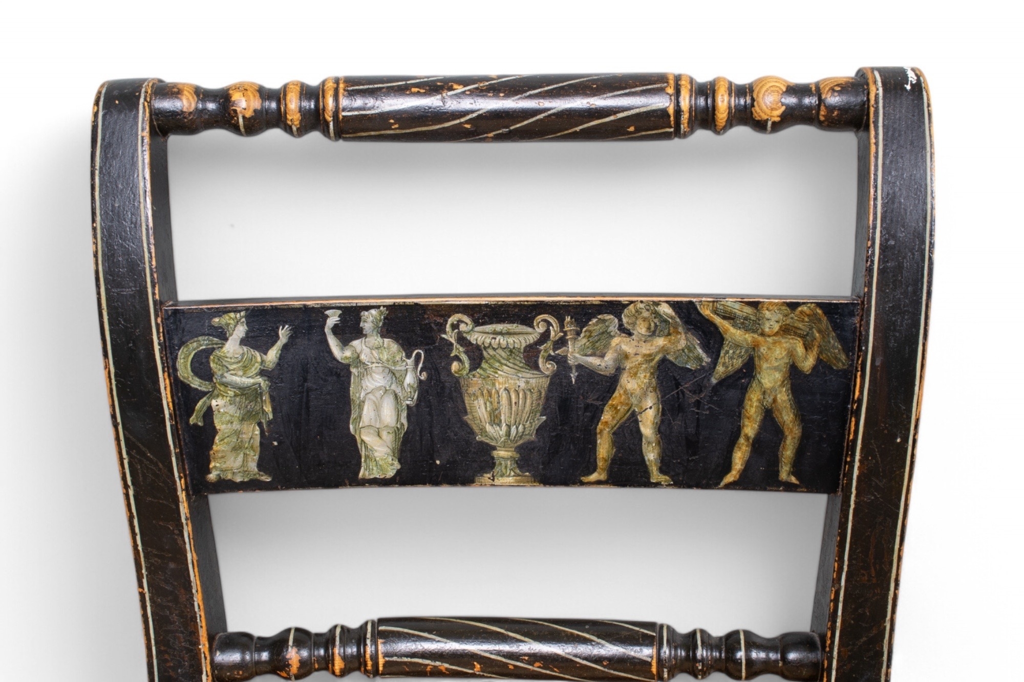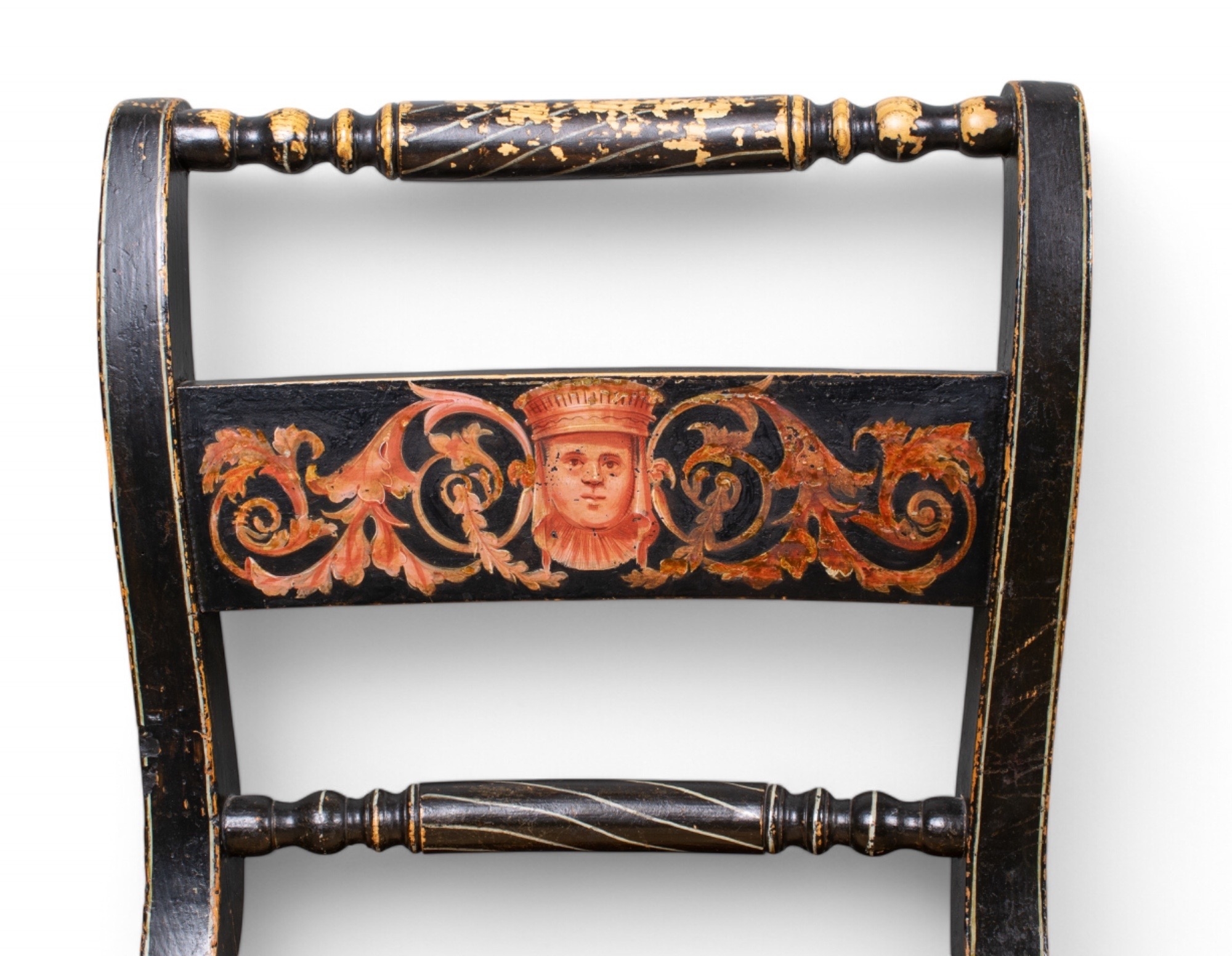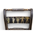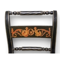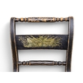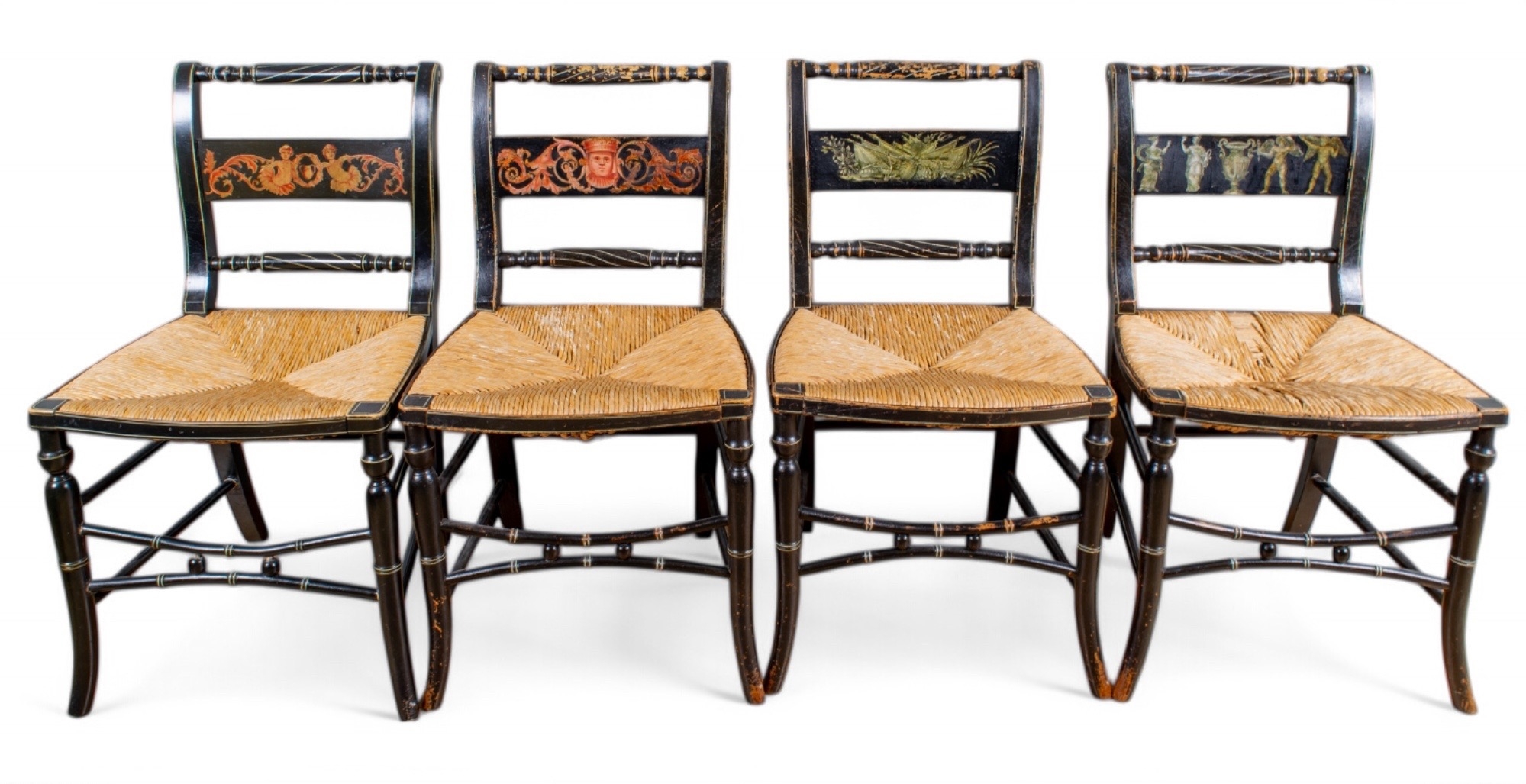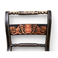 A set of four black painted standard chairs with rush seats, each with a central panel painted with masks, foliage etc. On everted front legs