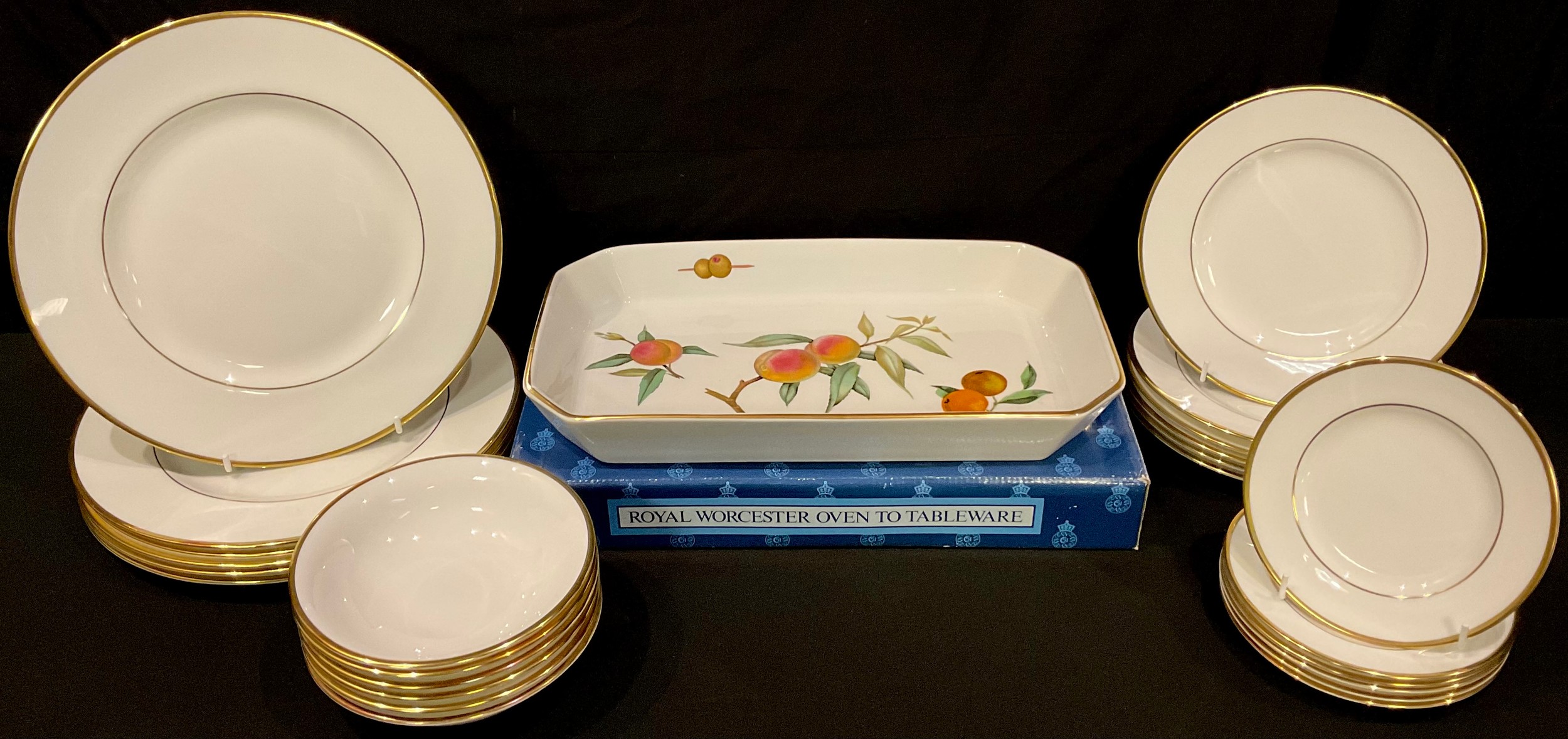 A Wedgwood California patter dinner service for six; a Royal Worcester Evesham pattern rectangular oven/serving dish, boxed