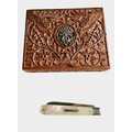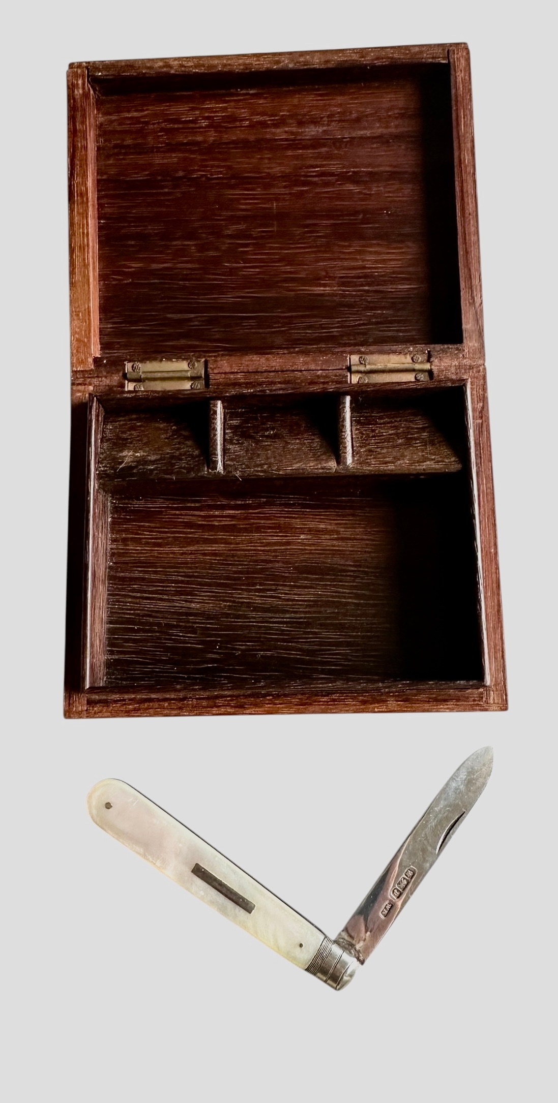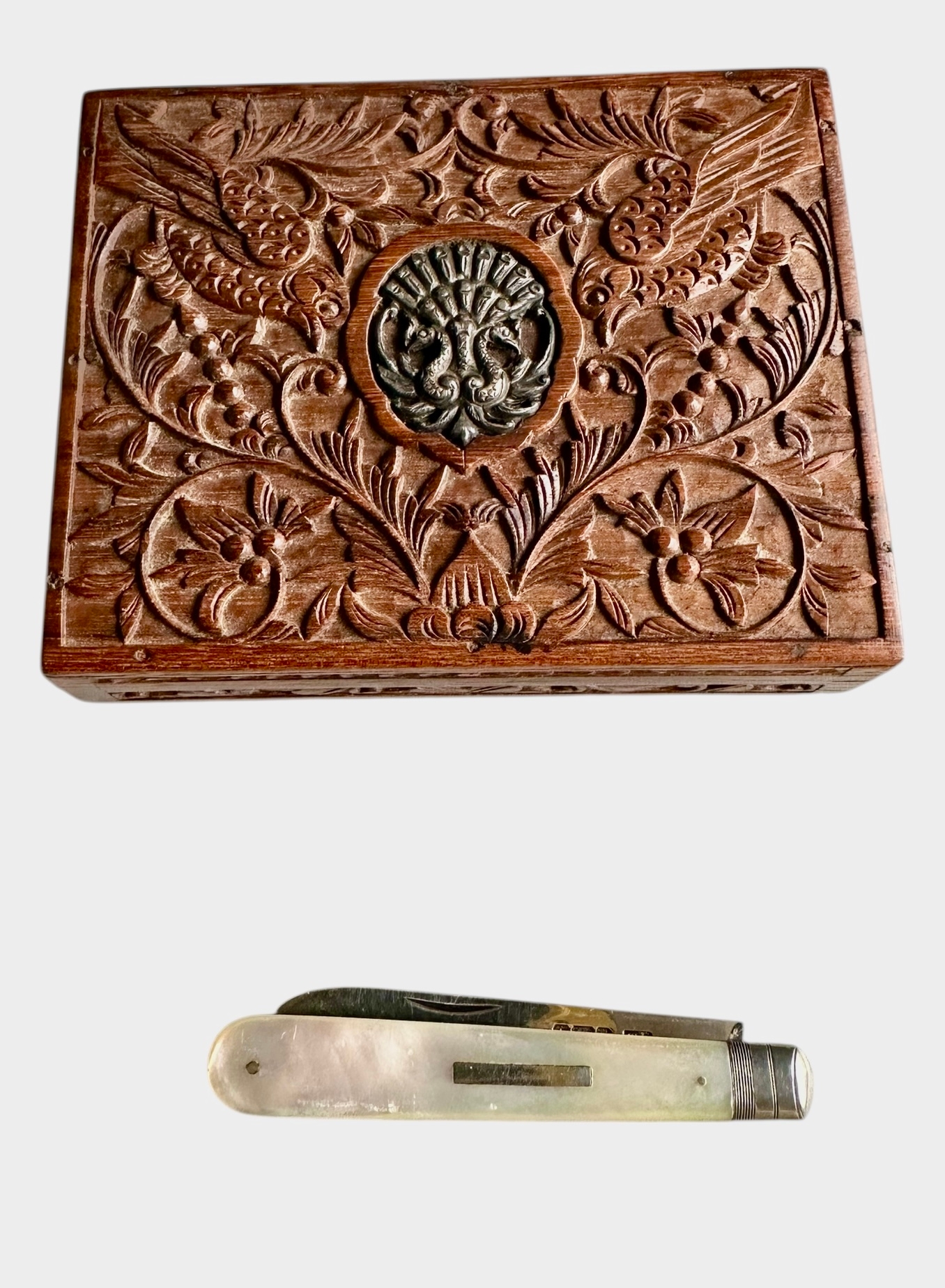 Anglo-Indian Carved Stamp Box 10.3cm x 8.3cm x 2.4cm & A Silver Fruit Knife 13cm x 1.2cm