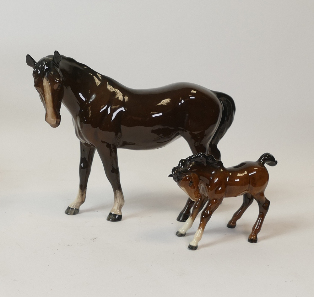 Beswick mare facing left 976, together with foal head down, 1085, both in brown gloss. (2)