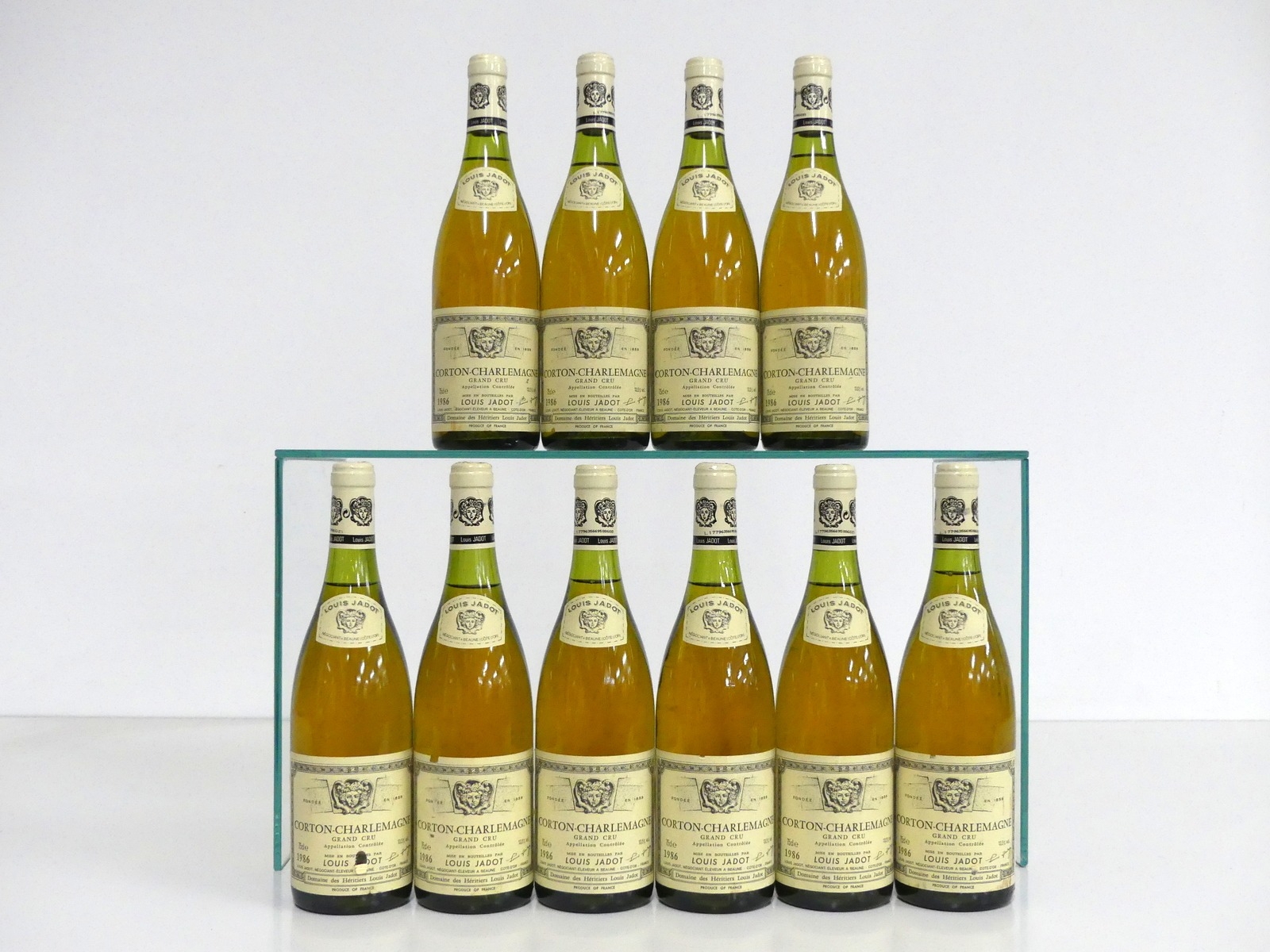 V 10 bts Corton-Charlemagne Grand Cru 1986 oc Louis Jadot 2 ts, 2 us/ts, 6 us. vsl torn labels