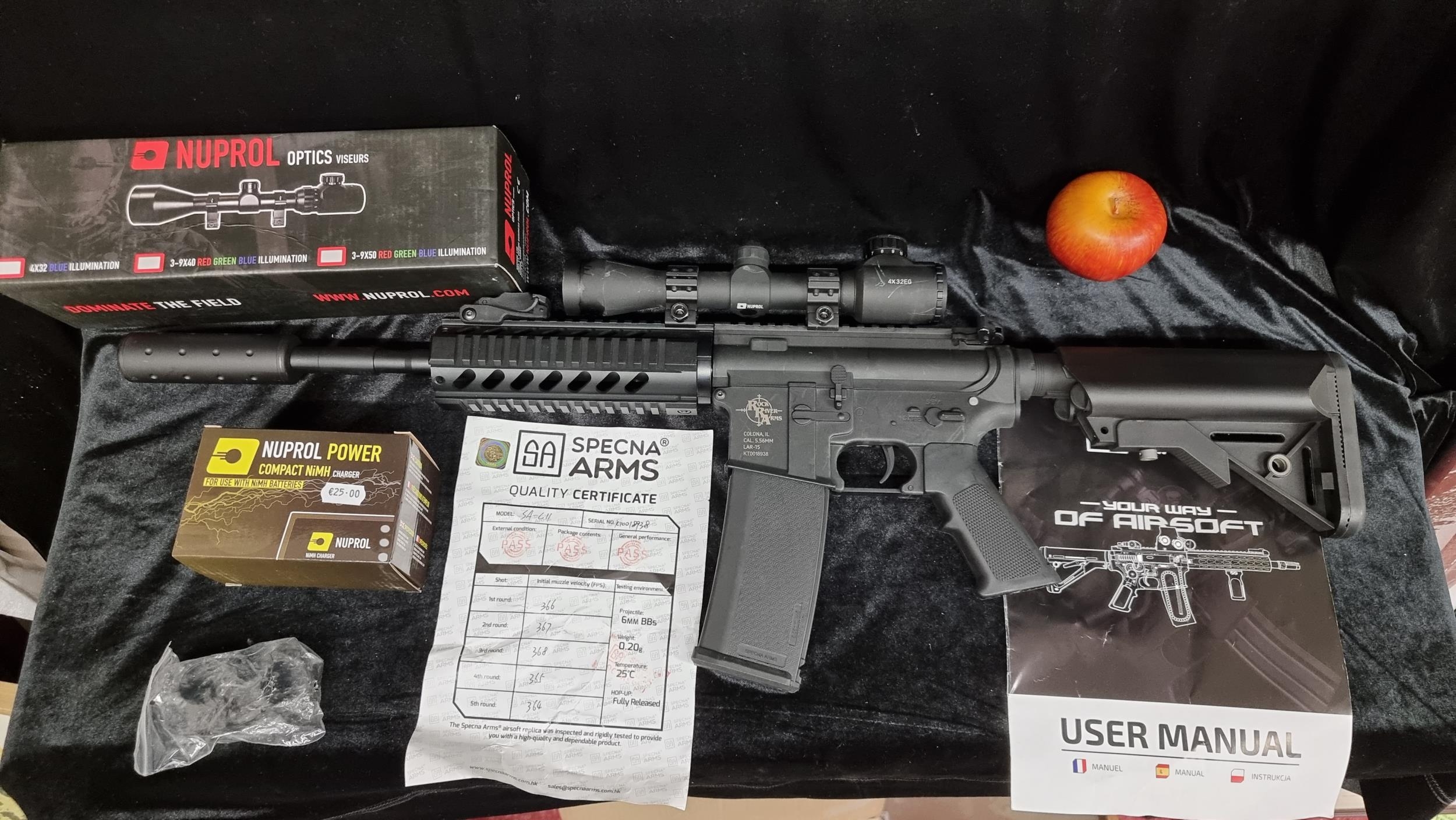 Star Lot : A high value Air Soft gun by SPECNA INDUSTRIES,. A detailed replica of an AR15 Rifle. 5.56mm x 45. With Nuprol Power Charger and a Nuprol optics Viseurs. Very heavy with a super power scope. Its working and firing away. Originally cost €500 according to vendor. Has a very good quality gun sight.