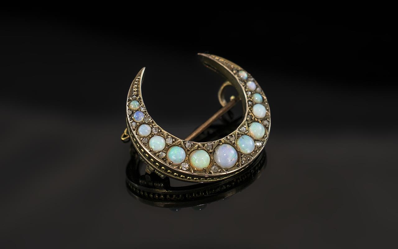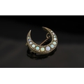 Antique Period 15ct Gold - Crescent Shaped Opal and Diamond Set Brooch. Lovely Condition, A Good Quality Well Matched Set of Opals, Good Colour with Rose Cut Diamond Spacers. Tests High Ct Gold. Size 1.1/8 Inches - 2.75 cms.
