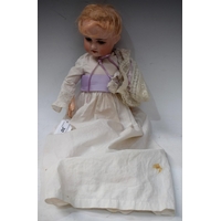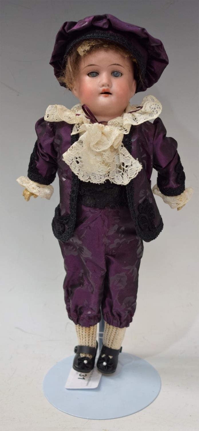 A Porzellanfabrik Rauenstein socket head Dandy boy doll, bisque porcelain head, sleeping blue eyes, open mouth with teeth, light brown hair, dressed in a purple and white dandy boy outfit and hat, black shoes, impressed marks, Made in Germany, crossed flags factory stamp, No 7/0X, approx 32.5cm high