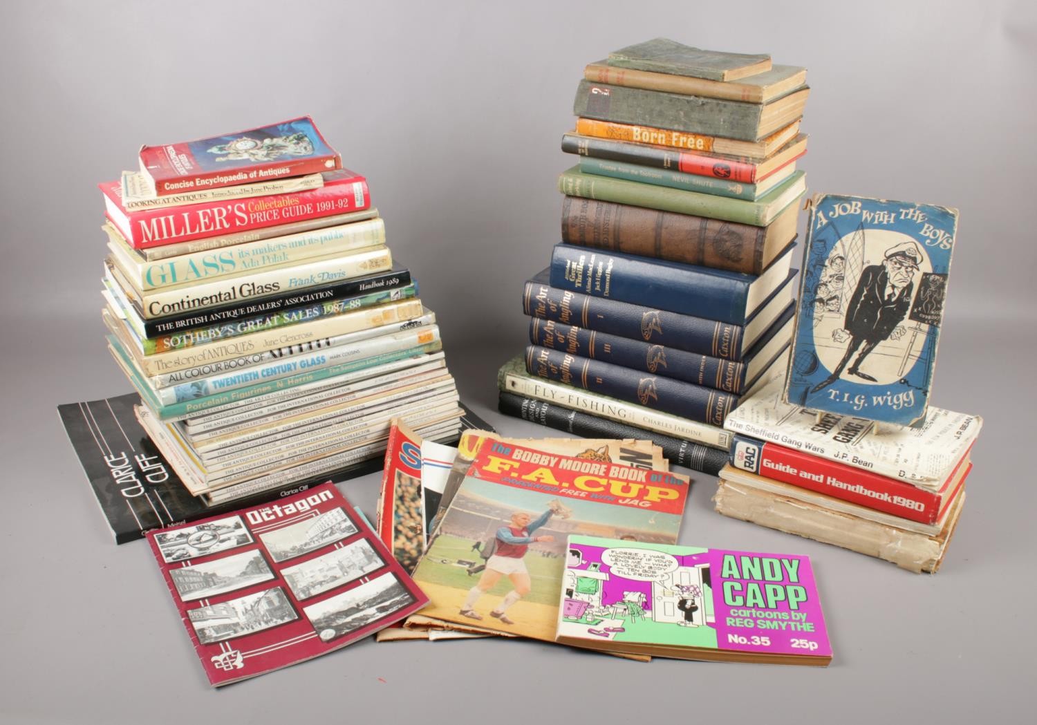 Two boxes of books - comprising of one box containing a selection of books and magazines on antiques such as, 'Continental Glass' by Frank Davis and Clarice Cliff. The other box contains a selection of books such as 'Last of The Mohicans' by J.Fenimore Cooper and 'Born Free' by Joy Adamson etc.