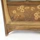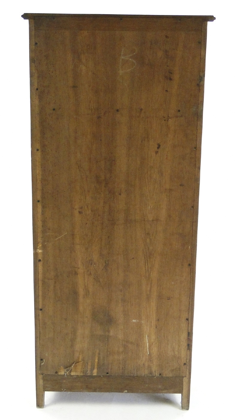 French Art Nouveau walnut bookcase, the rectangular top above open shelf space, the glazed central door enclosing three shelves and carved with a stylised central flower above a floral inlaid marquetry panel, 145cm high x 65cm wide x 35cm deep