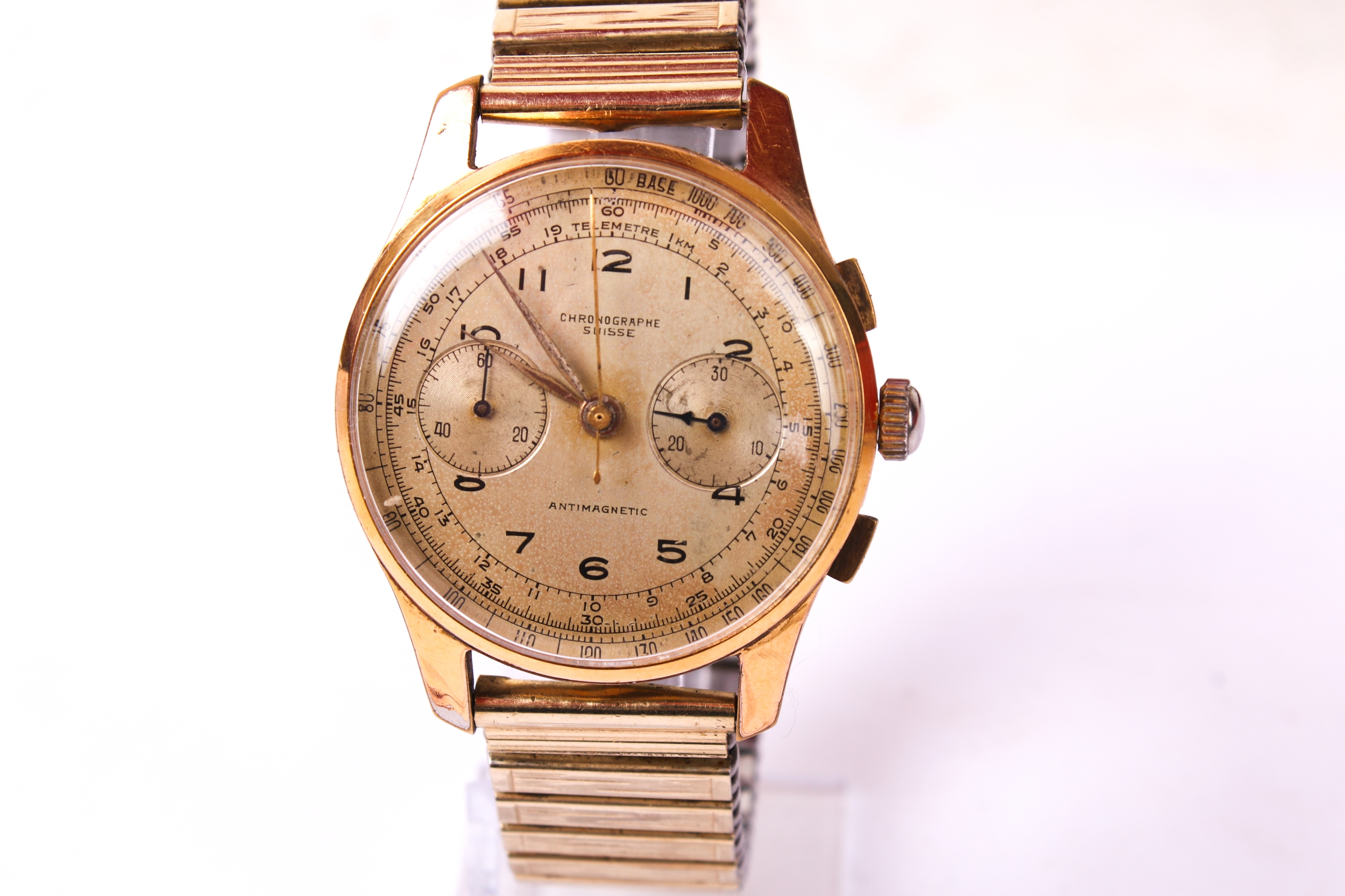 Winds fine, crown moves and adjusts hands. Buttons function and re-set correctly. Minor discolouration to face. Scratches to glass and case.