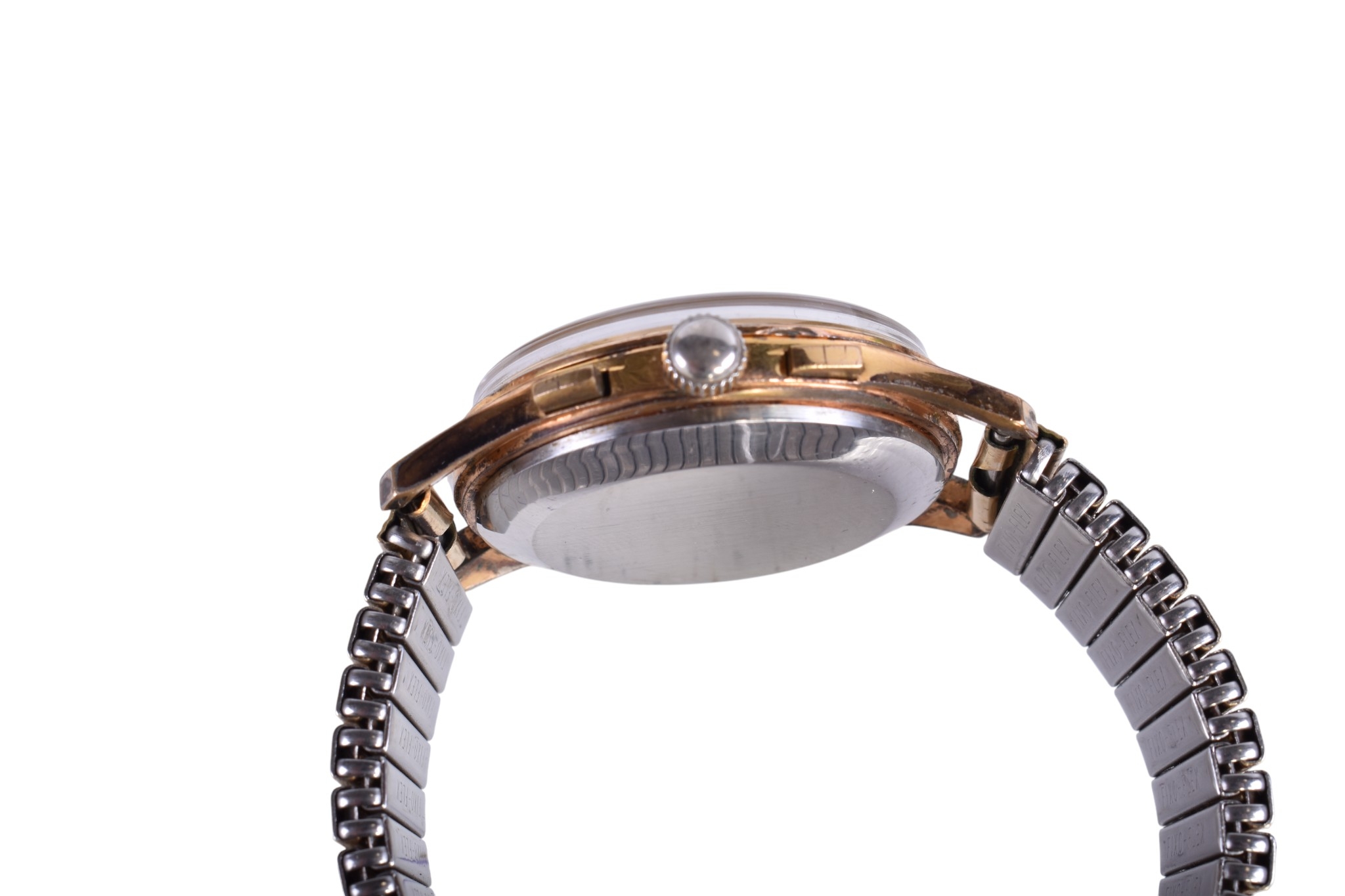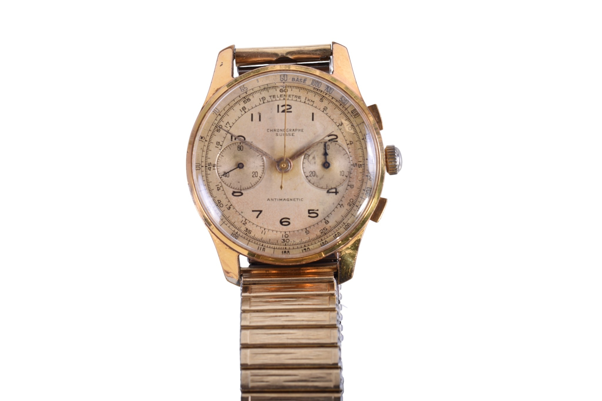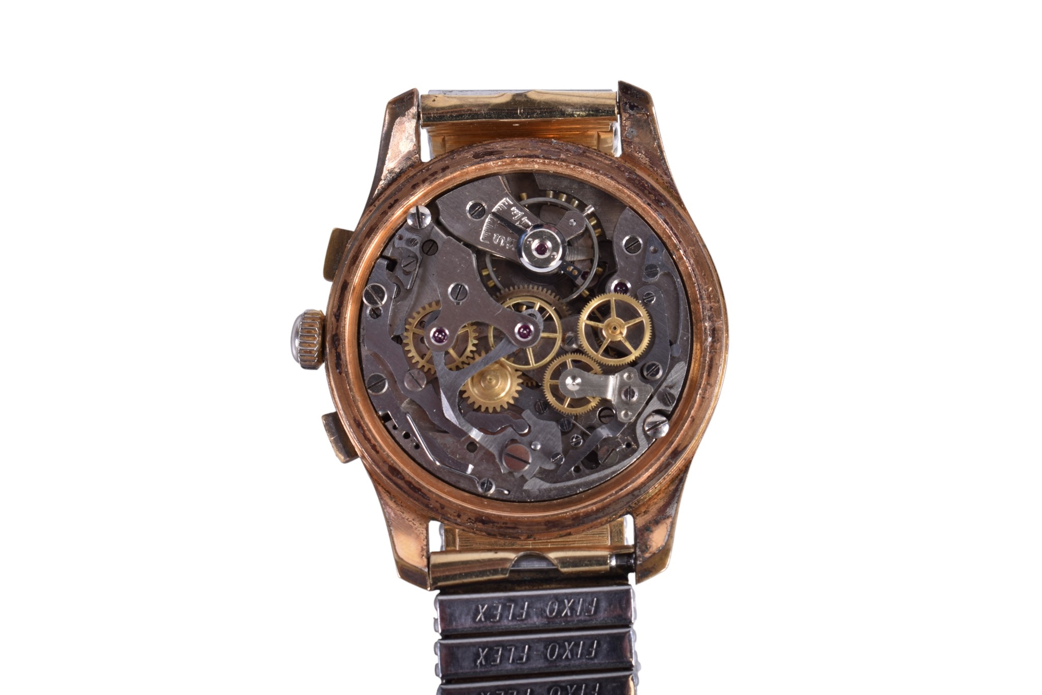 A gentleman's Swiss chronograph watch. The gilt dial having Arabic numerals and two subsidiary dials, automatic movement, in a gold plated case, attached to a gold plated Fixo-Flex bracelet, case diameter 3.8cm.