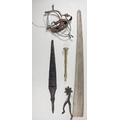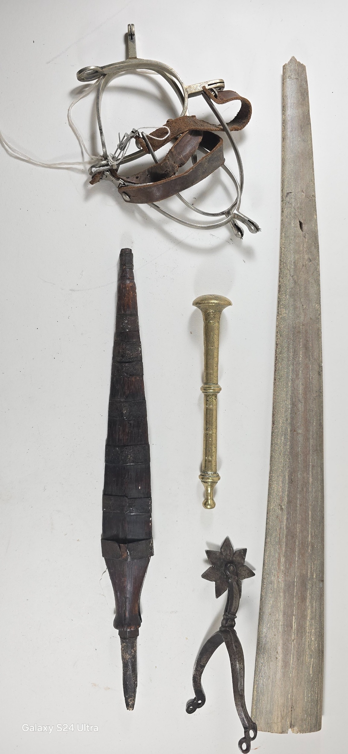 The iron head of a Moro spear from the Philippines, 30cms, with iron bound wooden cover; 2 pairs of nickel spurs c.1900 (1 pair with rowels missing); another iron spur; a brass pestle; and a polished saw fish saw (damaged, repaired, teeth removed). Average Good condition, some age wear.